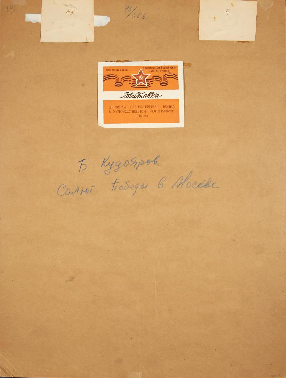 Vintage silver print, mounted on cardboard 52,3 x 39,5 cm Annotated “B. Kudoyarov. Victory Fireworks in Moscow” in an unidentified hand in pencil on the reverse, annotated “Exhibition “World War II in photographs” 1948” on a label with typographic description on the reverse of the mount PROVENANCE Howard Schickler Fine Art, New York