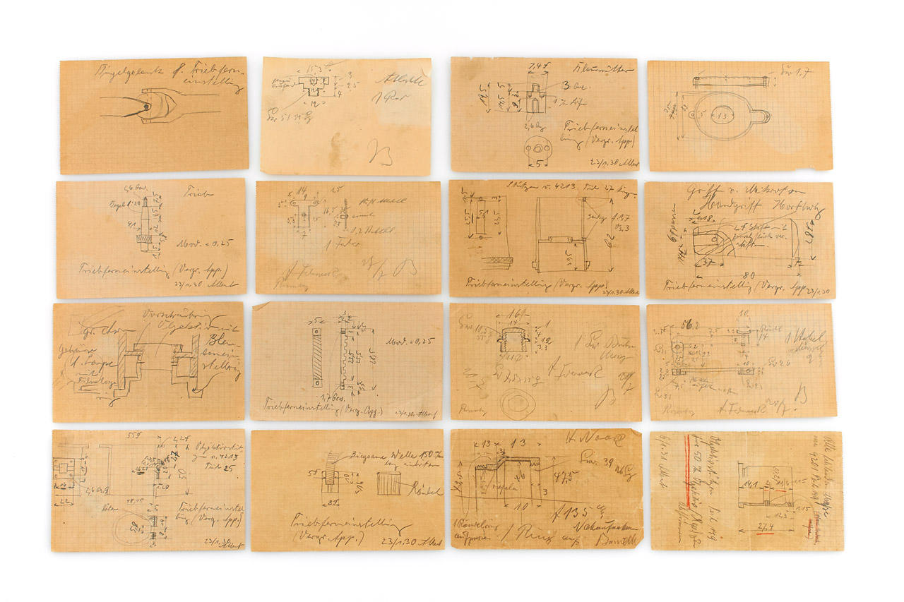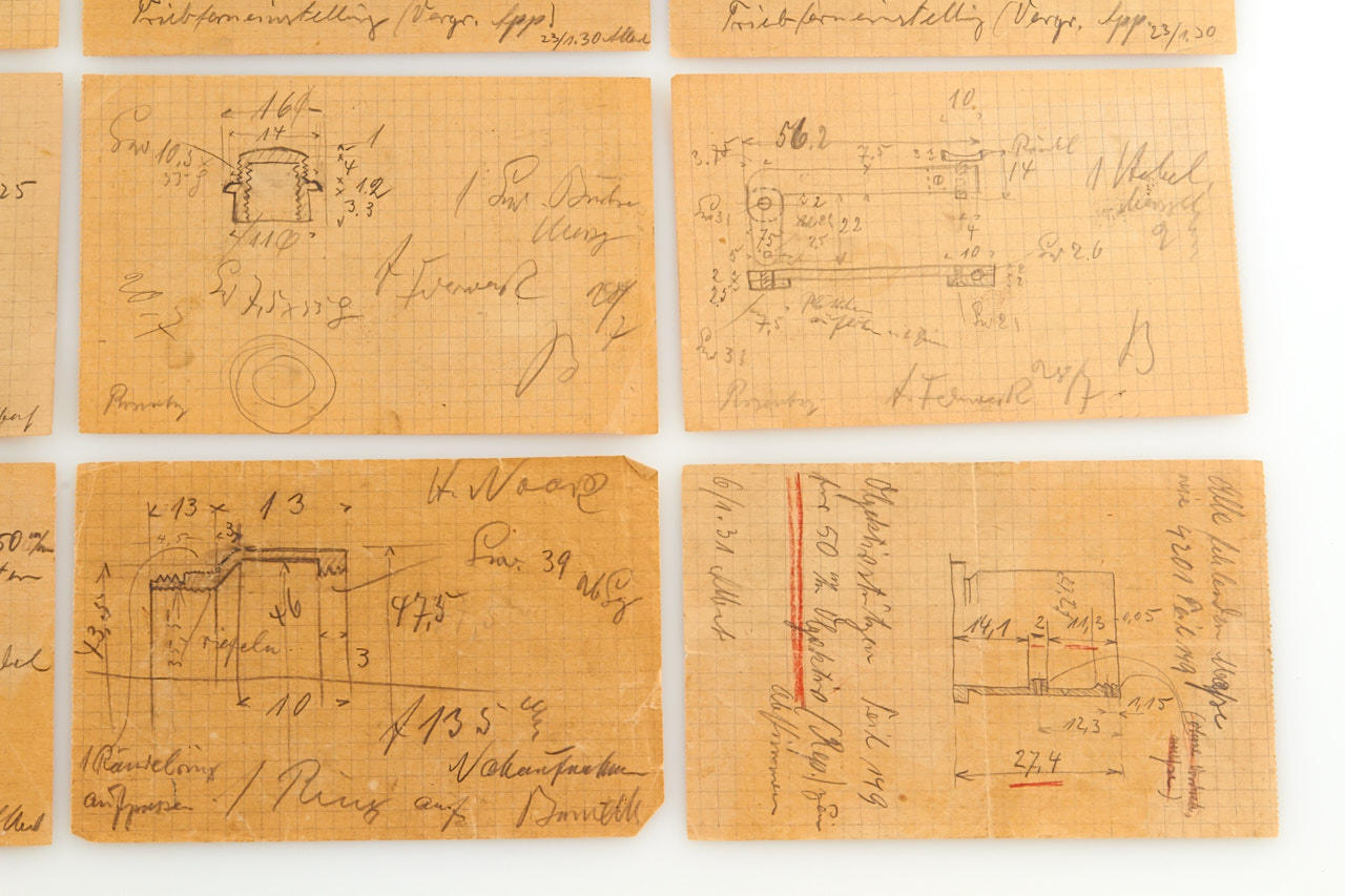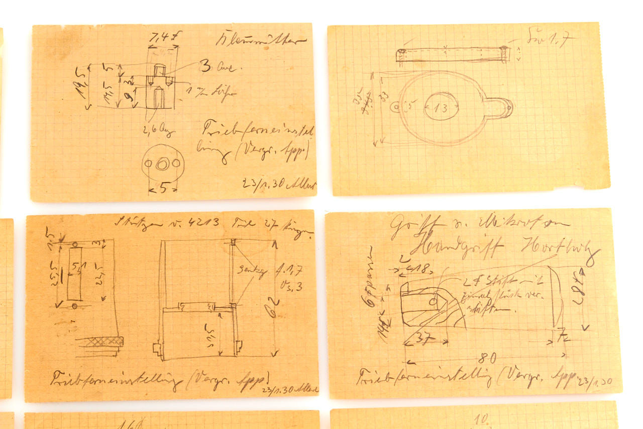 collection of 17 original 10x15cm construction drawings of Leitz cameras and accessories, 7 signed by Wilhelm Albert, 5 signed by Oskar Barnack