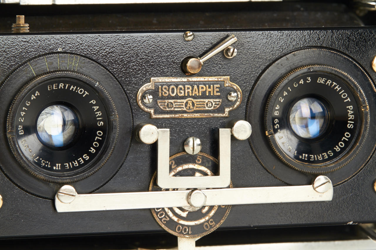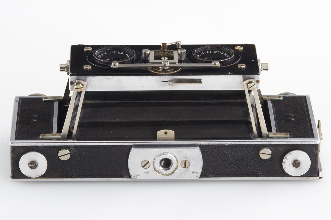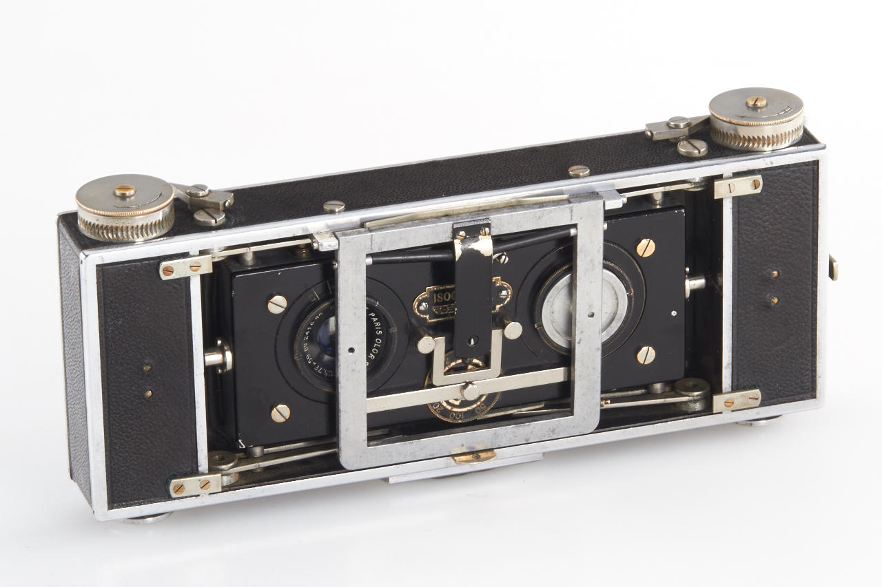 extremely rare folding-strut stereo camera for paired 6x6cm exposures on 620 roll film, the only version we've seen with wide angle Berthiot Paris Olor Serie IIa 5,7/59mm lenses no.241643 and no.241644 in 1-200 shutter (one lens cap missing)