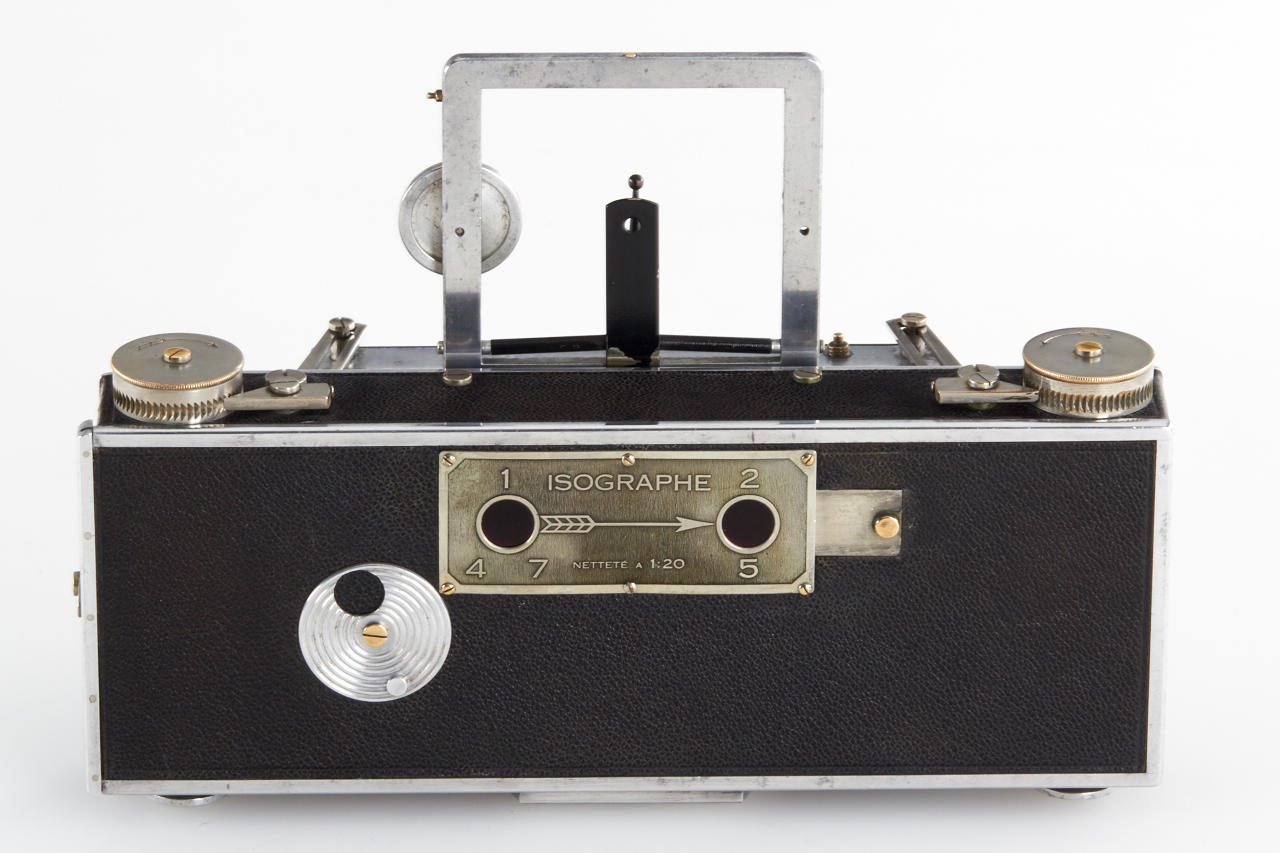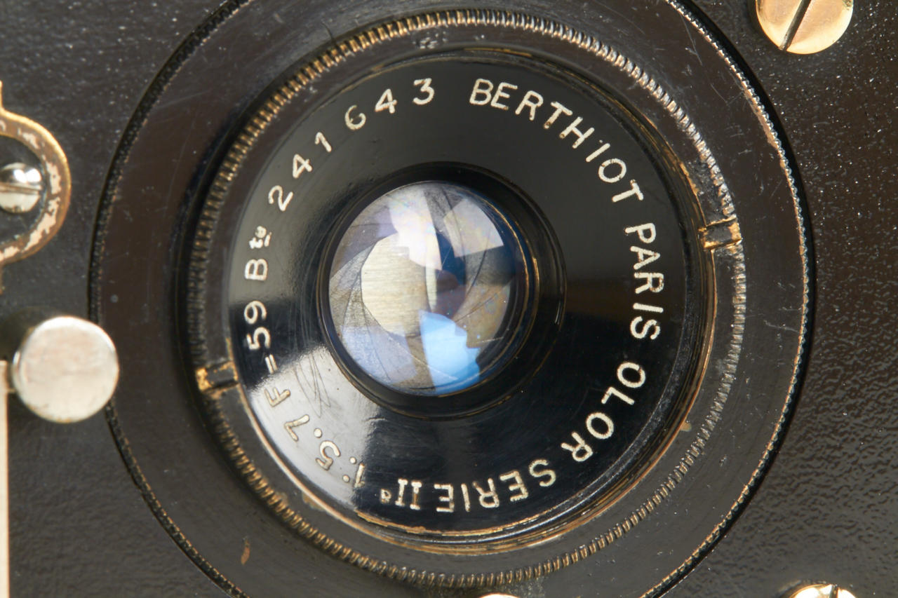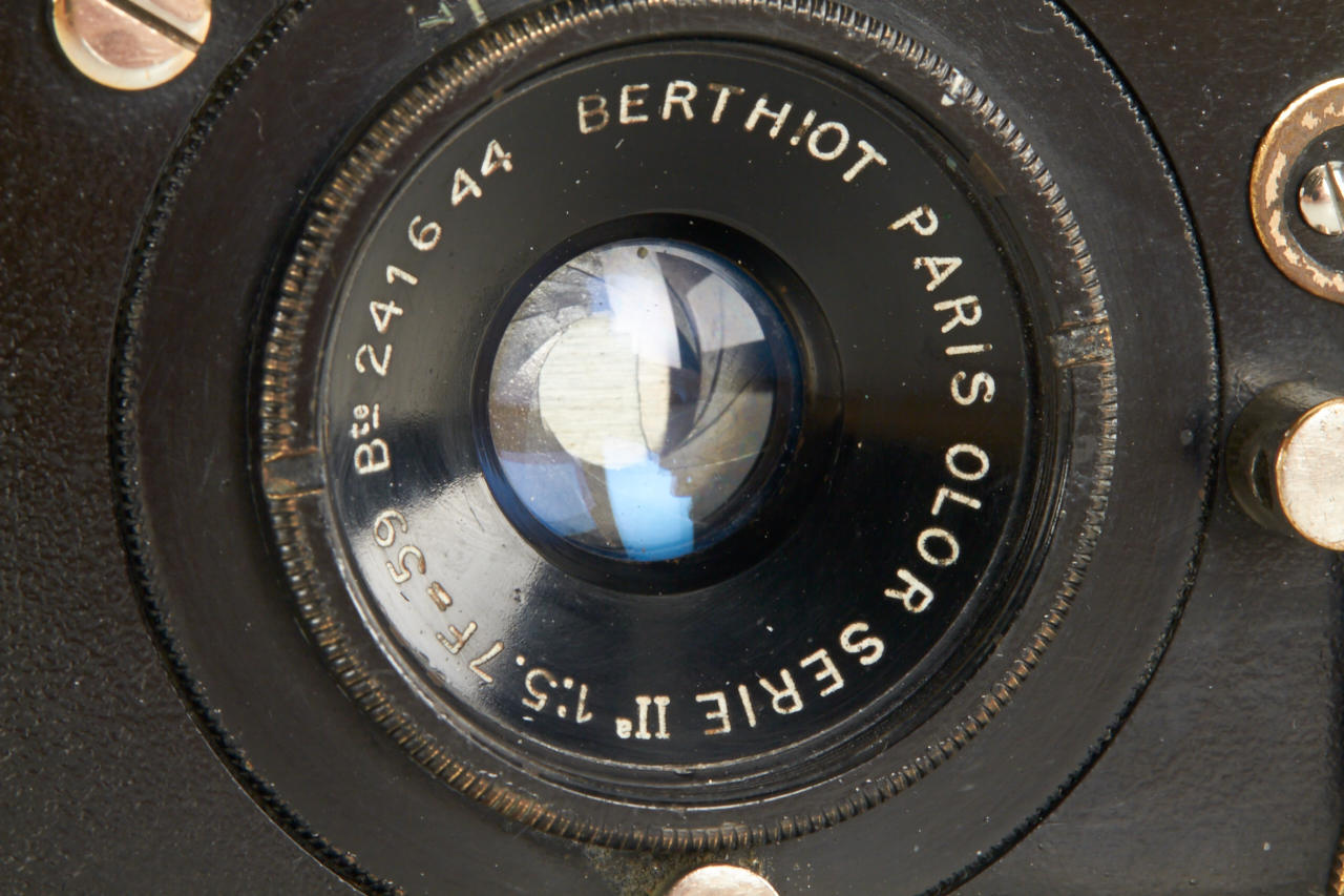 extremely rare folding-strut stereo camera for paired 6x6cm exposures on 620 roll film, the only version we've seen with wide angle Berthiot Paris Olor Serie IIa 5,7/59mm lenses no.241643 and no.241644 in 1-200 shutter (one lens cap missing)