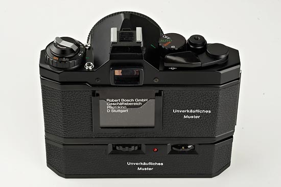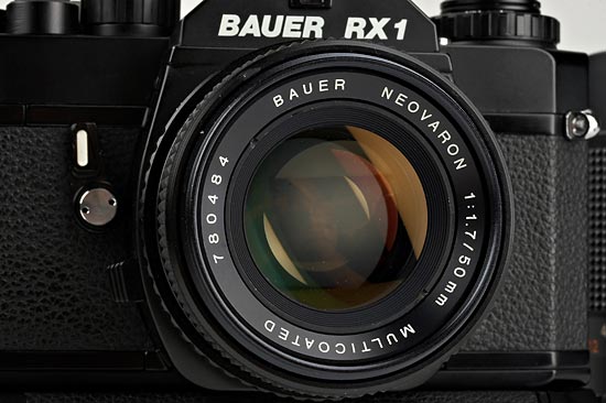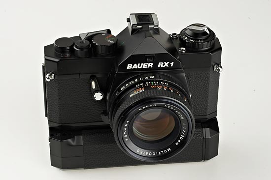 very rare camera (produced by Cosina for the 1978 Photokina), black version with Bauer winder the RX1 no.82800170 (both labelled "Unverkäufliches Muster" - sample, not for sale), complete with 5 lenses in mint condition (Neovaron 1.7/50mm no.780484, Neovaron 2.8/28mm no.00793, Neovaron 2.8/40mm no.780323, Neovaron 2.8/135mm no.780264, Neovaron 3.5/200mm no.780307) - all lenses with cases, caps - the Bauer RX1 camera was never sold officially and less than 100 units were produced, such a complete set is extremely hard to find!