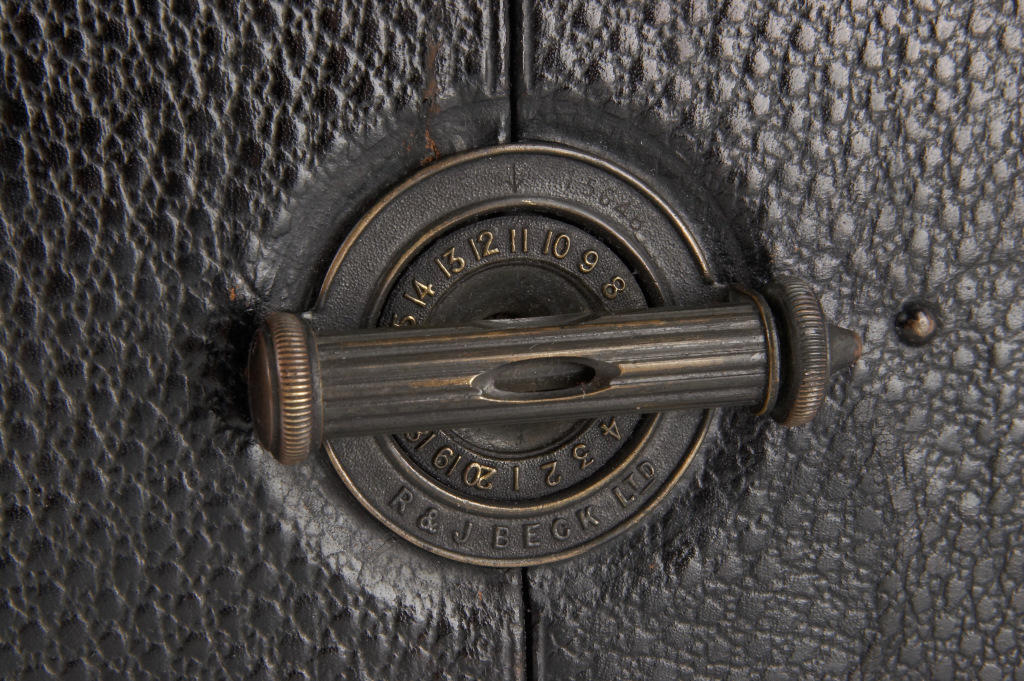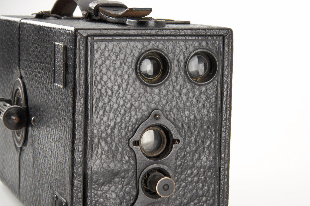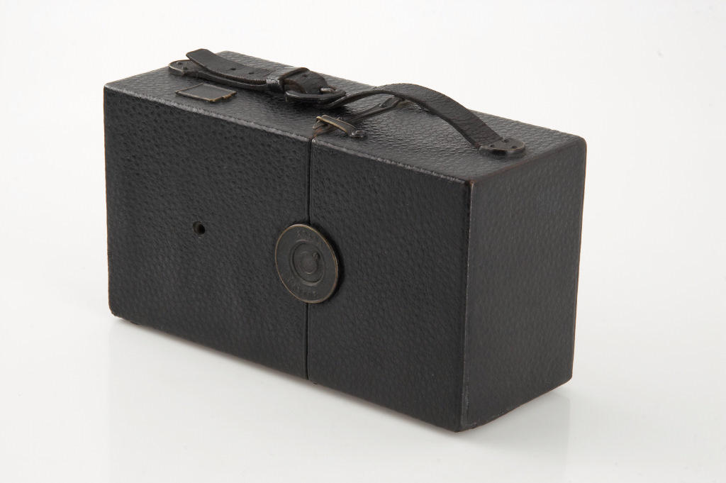 magazine camera, leather-covered wooden body, for exposures 2 5/8x3.5' on the specially grooved sheet film, with original carrying loop