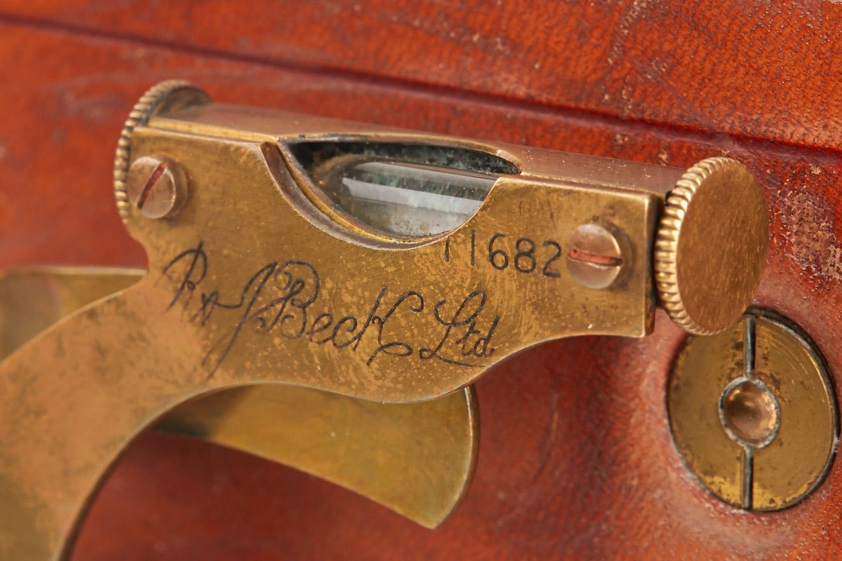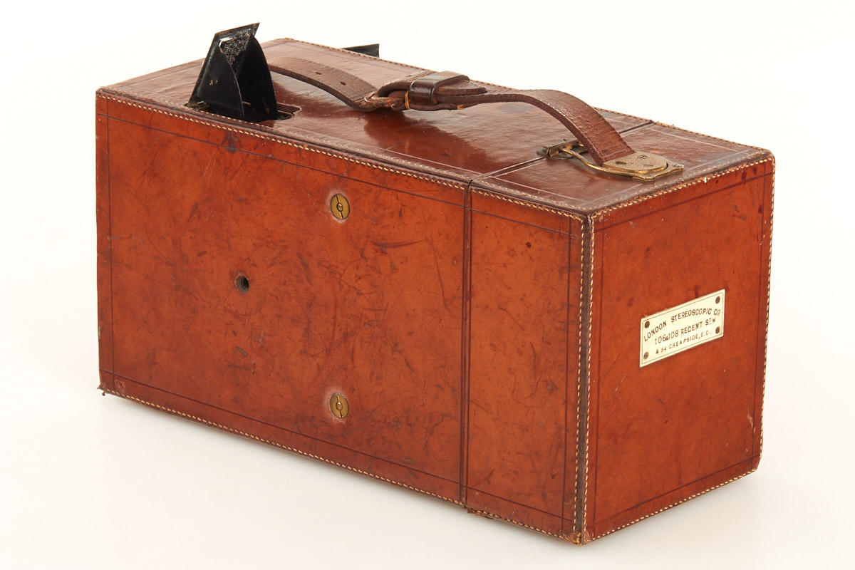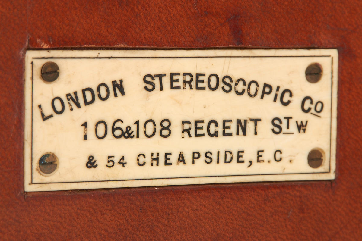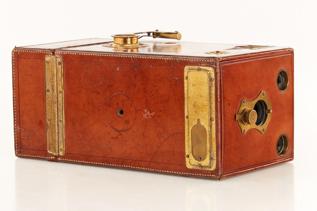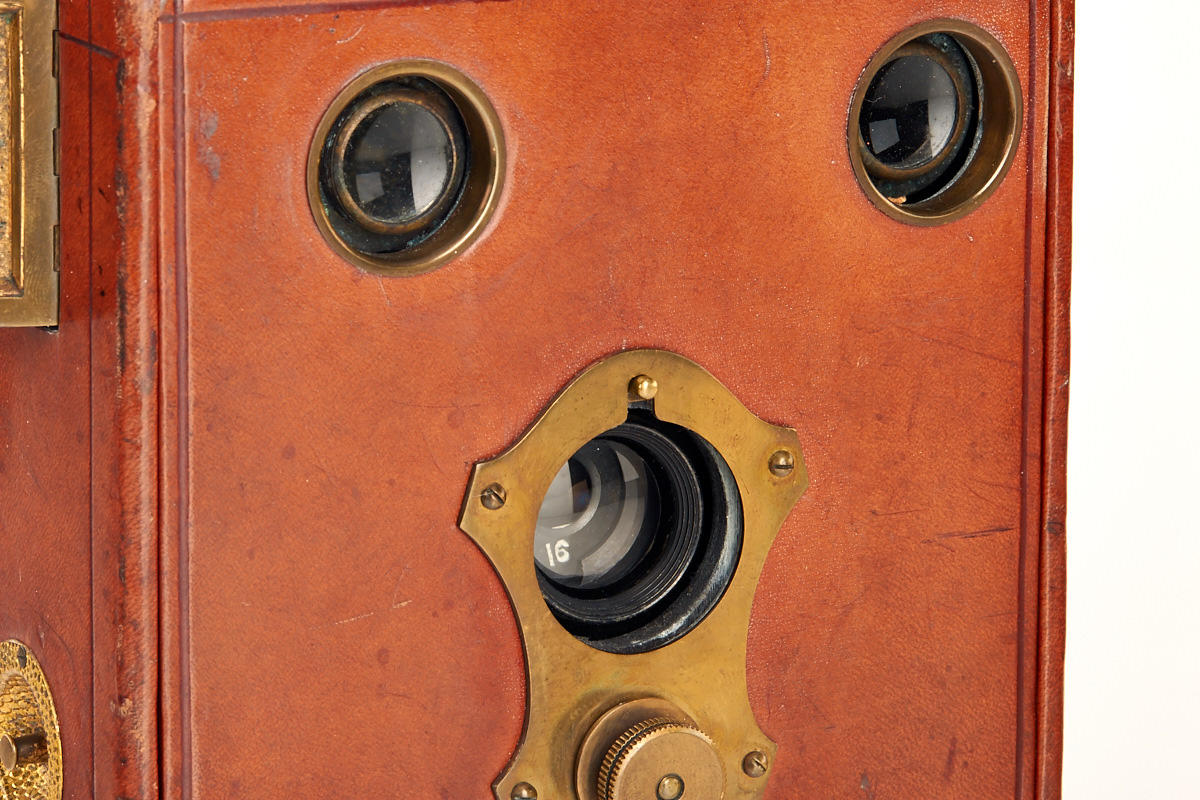 Deluxe version of the Frena, half-plate, brown calves leather-covered body, gilt brass fittings, swan-neck changing handle with built in spirit level, Rapid Rectilinear lens and carrying strap. According to McKeown's Price Guide, 'The camera could be tilted slightly and the film plumbed with the handle to create the same effect as a tilt back', dealers plaque 'LONDON STEREOSCOPIC Co.', rare camera in fine condition