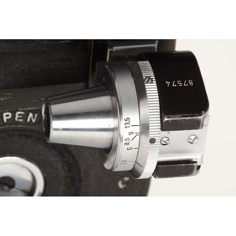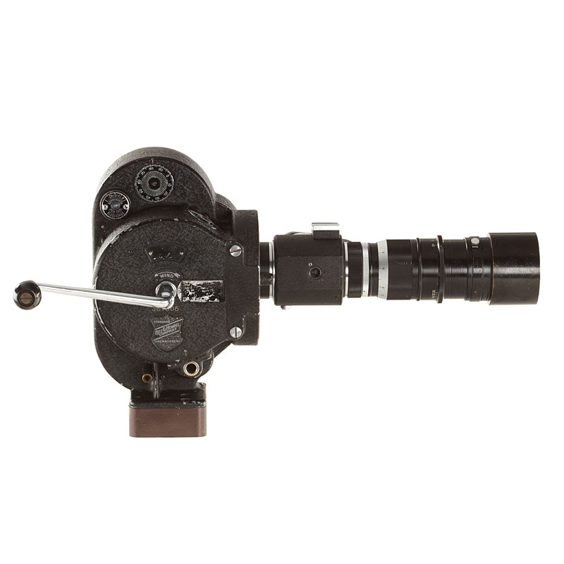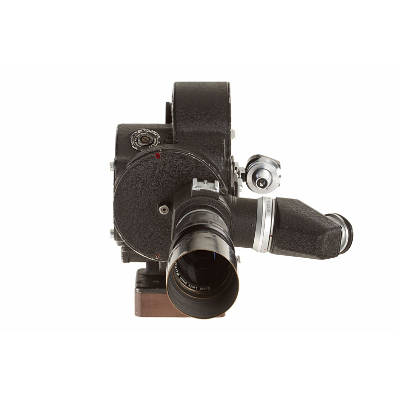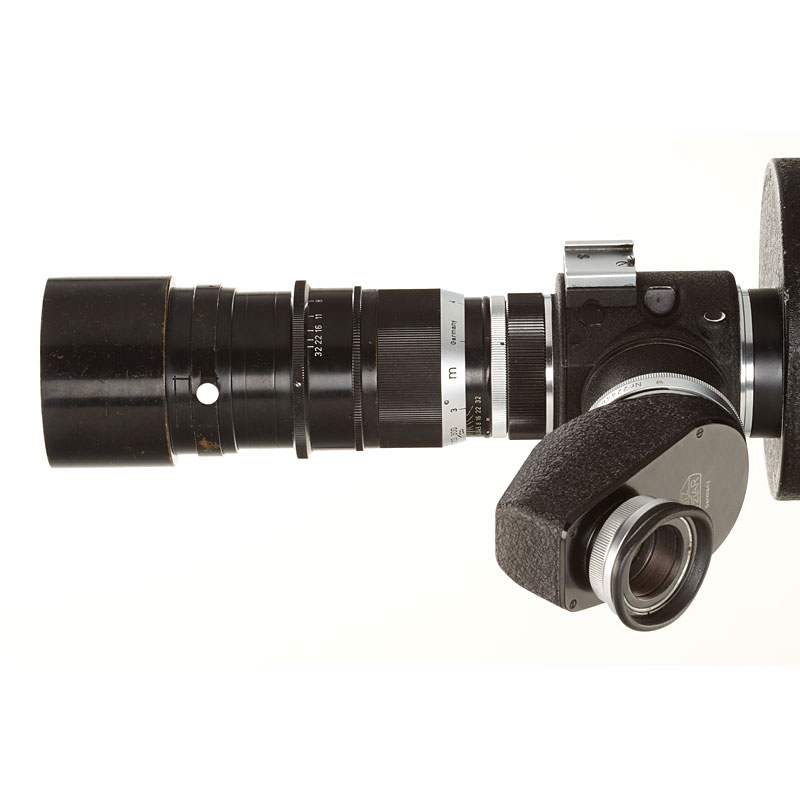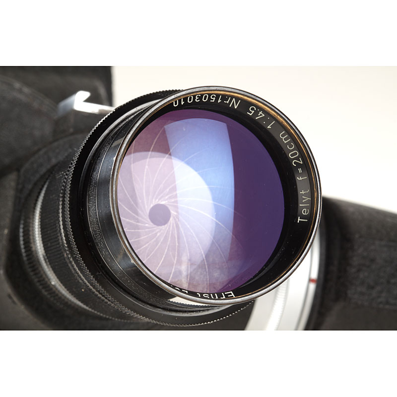 almost similar 35mm camera to the previous lot, converted for Leica M39 screw mount with unique by Leitz built 18x24mm Visoflex I (no.22446) with semi-reflecting mirror for simultaneously scoping and filming and Telyt 4.5/20cm no.1503010 (hood), VIOOH universal finder no.87574 (with strap, used as directors viewfinder), metal case.