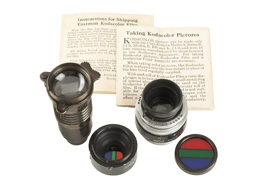 Bell & Howell 16mm Filmo 3-Color Kodacolor Outfit, c.1930, comprising a Taylor-Hobson Cooke Filmo Special 1.8/1" lens, no.172085, with 3-color Kodacolor filter with instructions in original boxes and a matching Model G projector lens with 3-color filter in original box. Together with a Filmo 57C 16mm projector with take-up reel in fitted case and a Filmo Auto Load 16mm movie camera (c.1940) with Cooke Kinic 1.5/1" lens, no.266383, Dallmeyer 4" Telephoto lens no.116957 in fitted case - very rare outfit, the Kodacolor accessories are in perfect condition