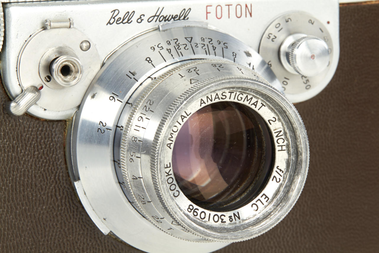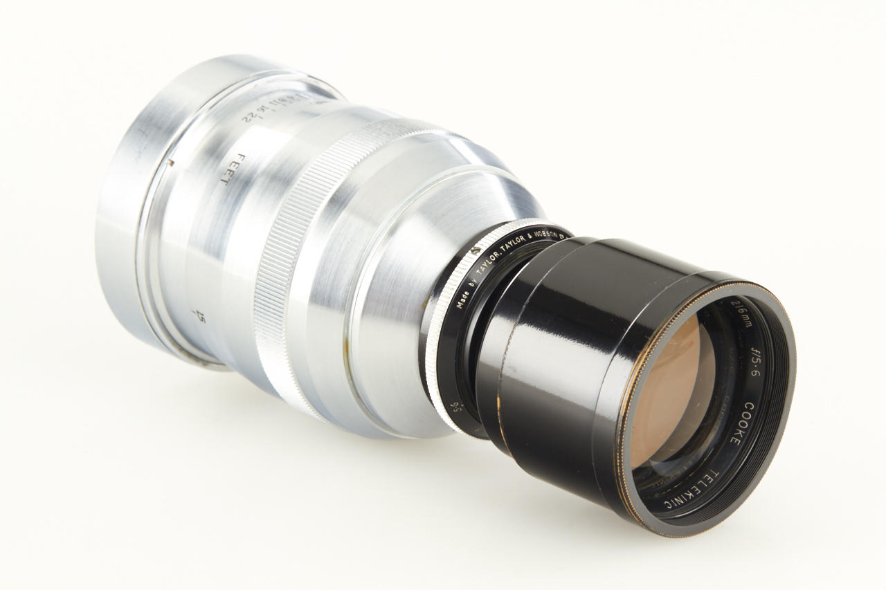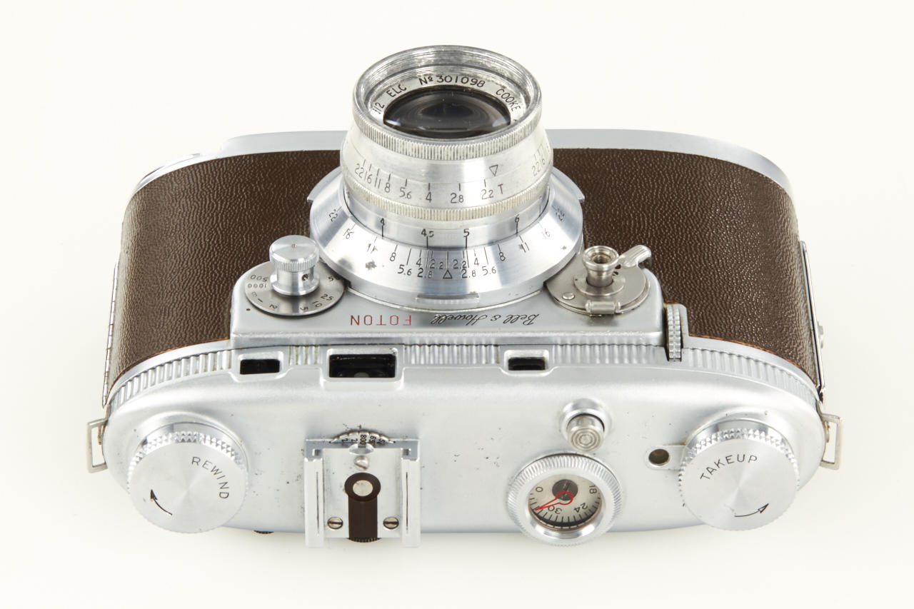 spring-driven 35mm rangefinder camera in very good working condition, with Taylor Hobson Cooke Amotal 2/2" no.301098 and very rare clean Cooke Telekinic Anastigmat 5.6/216mm no.459059, inclusive Foton Finder, Foton Flash Unit, original instructions and everready case
