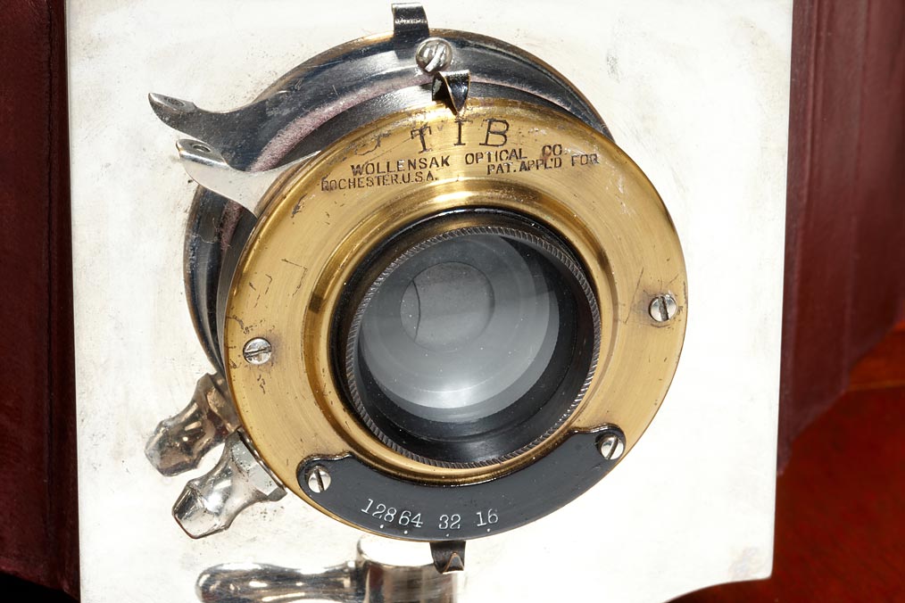 rare panoramic camera in which either the lens swings, pivots or moves, for 5 exposures 3 1/4 x 11 1/2 on 122 rollfilm, Wollensak lens in rotary shutter, in very good original condition