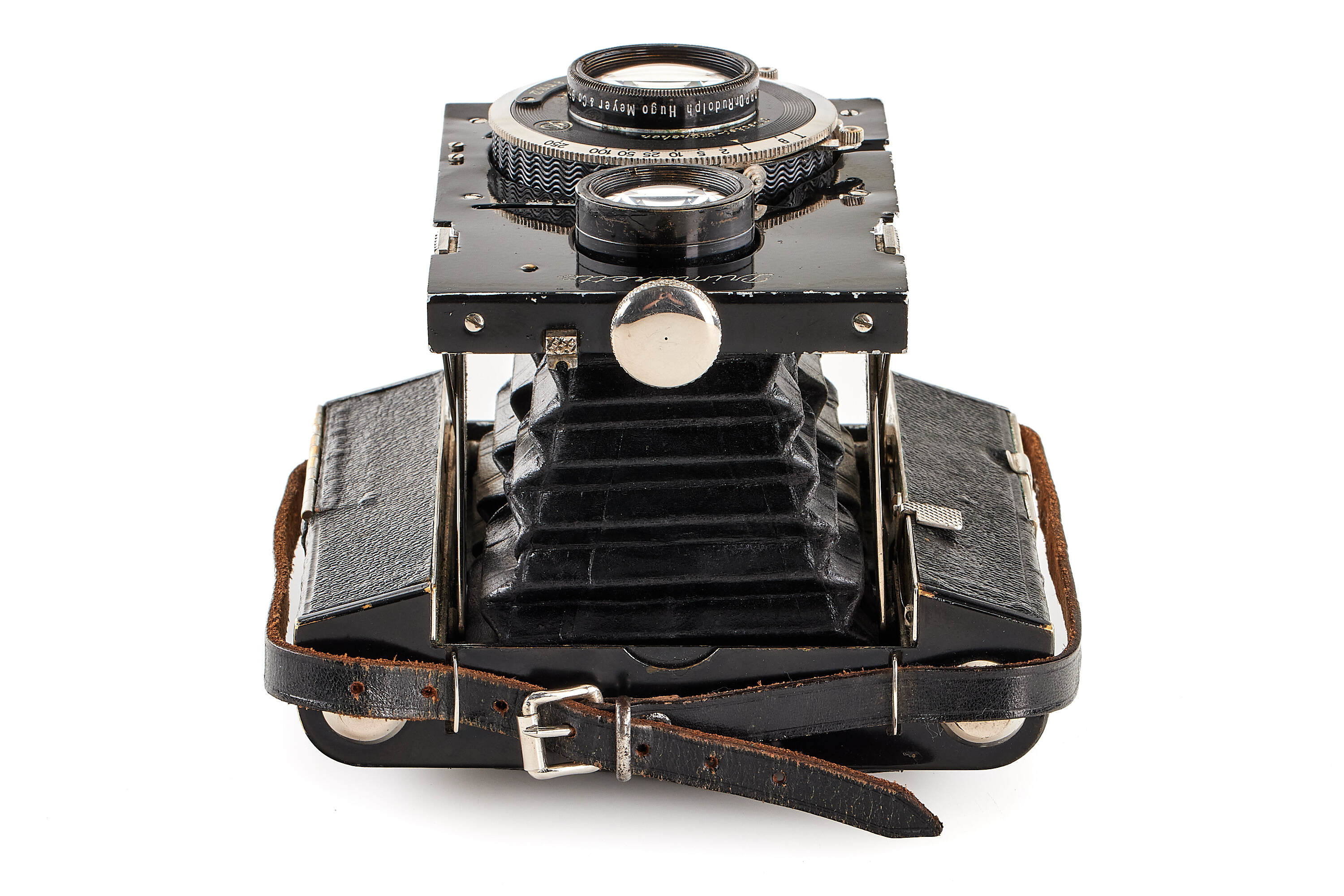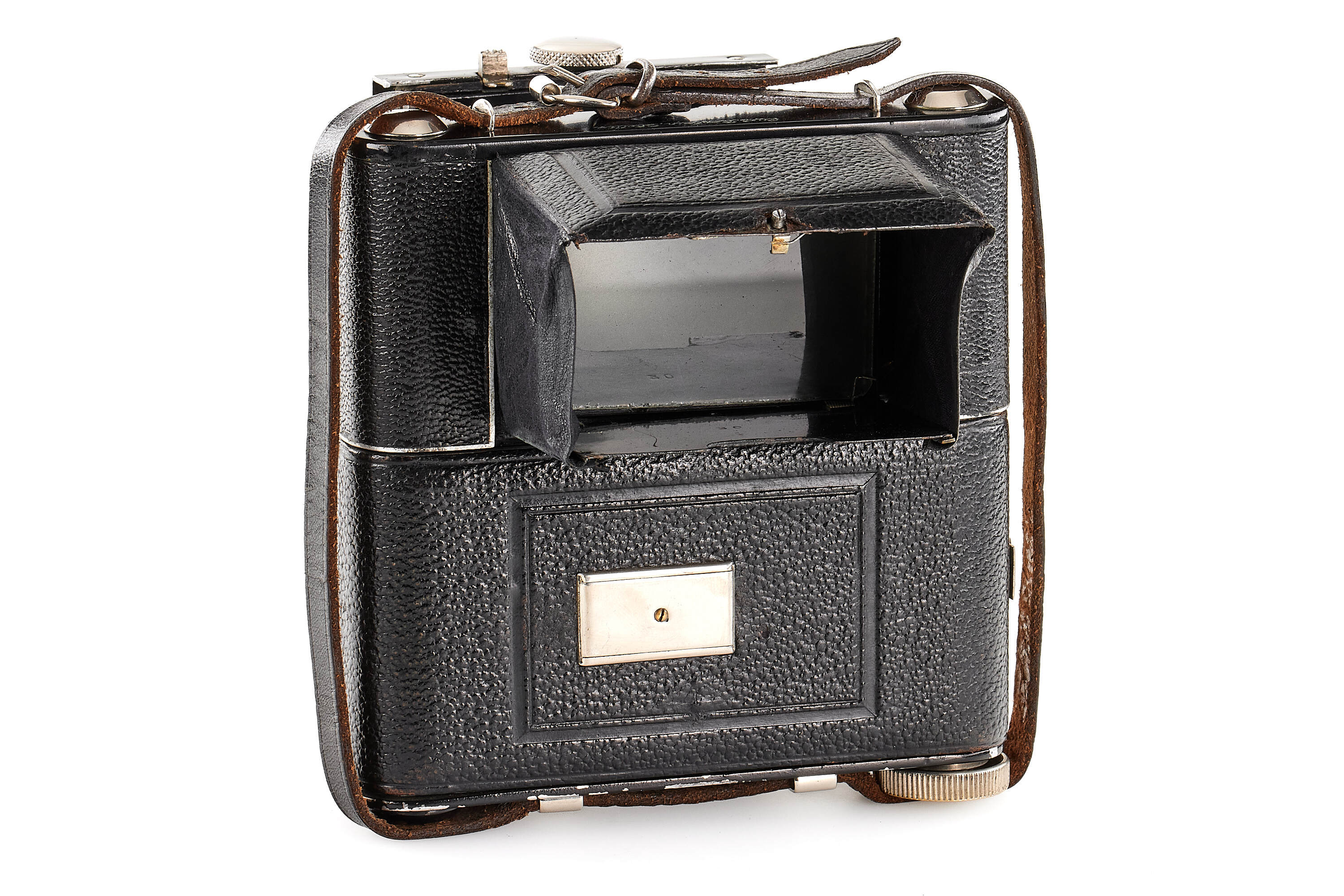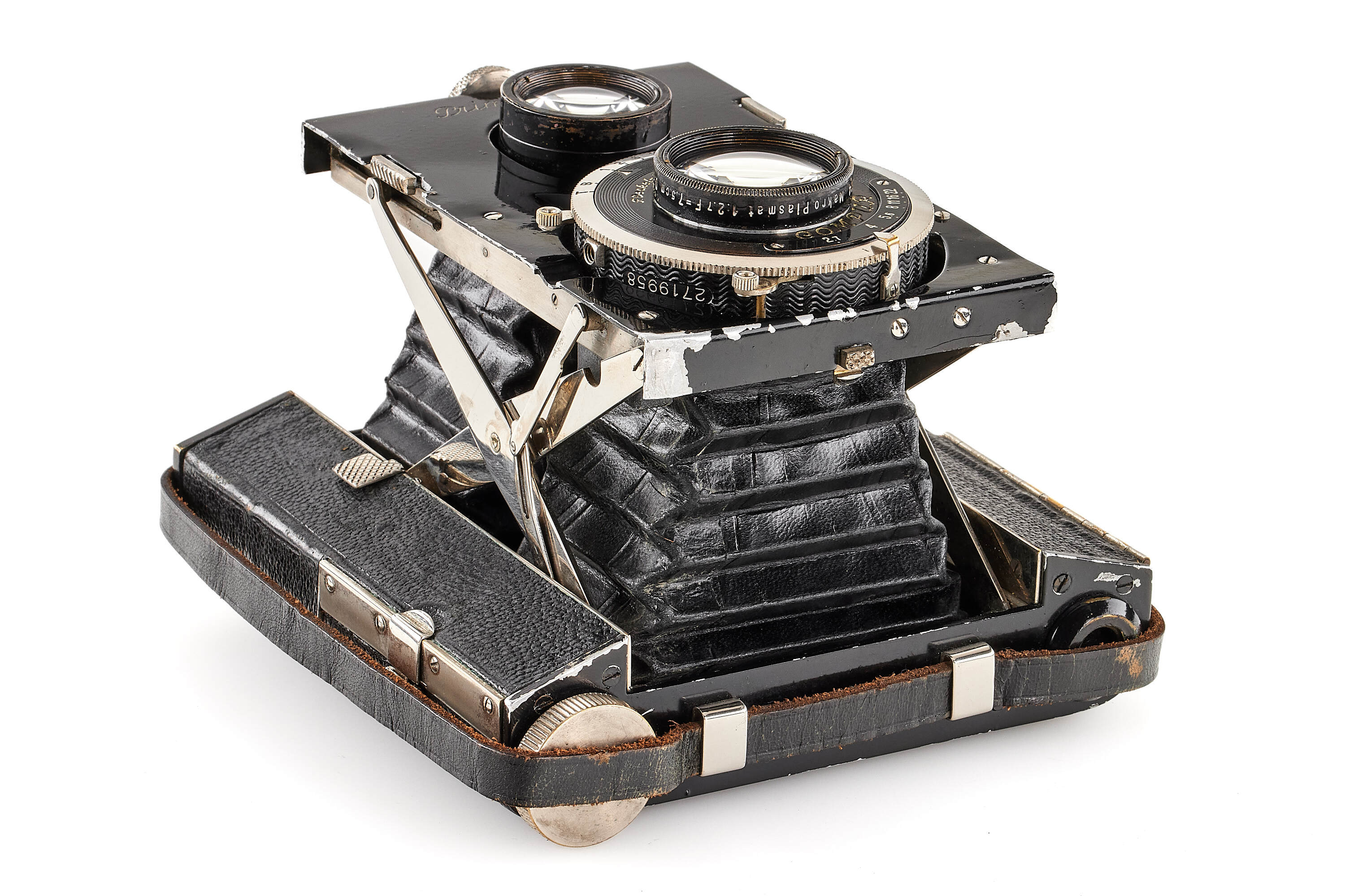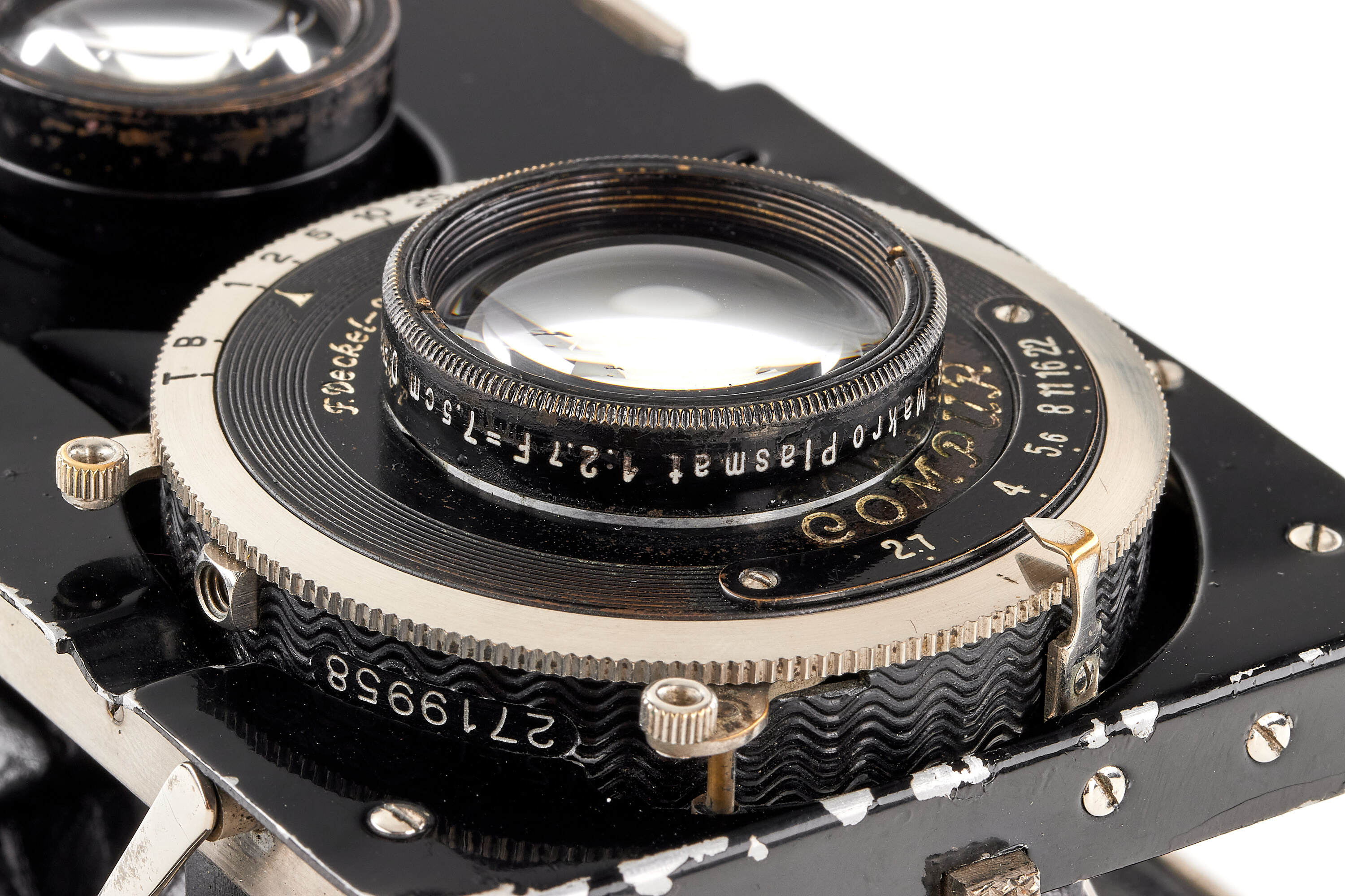 Rare twin-lens folding camera (not a reflex camera!) for 8 exposures 4x6.5cm on 127 film, separate bellows for taking and viewing lens, early version with front shutter release, in good condition, with sought-after Makro Plasmat 2.7/7.5cm no.581504 mounted in Compur shutter, good optics, note the automatic parallax correction, with rare original leather case.