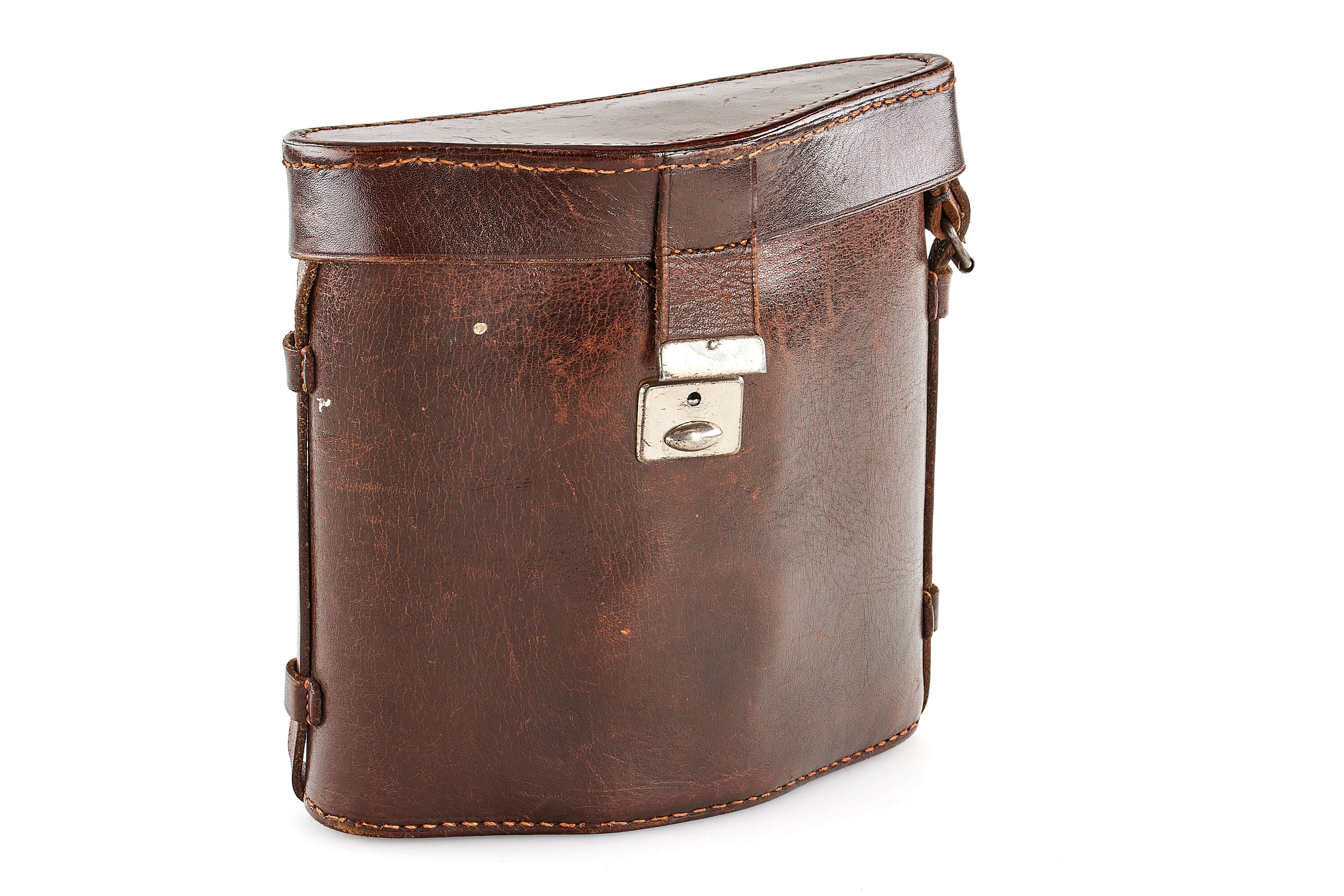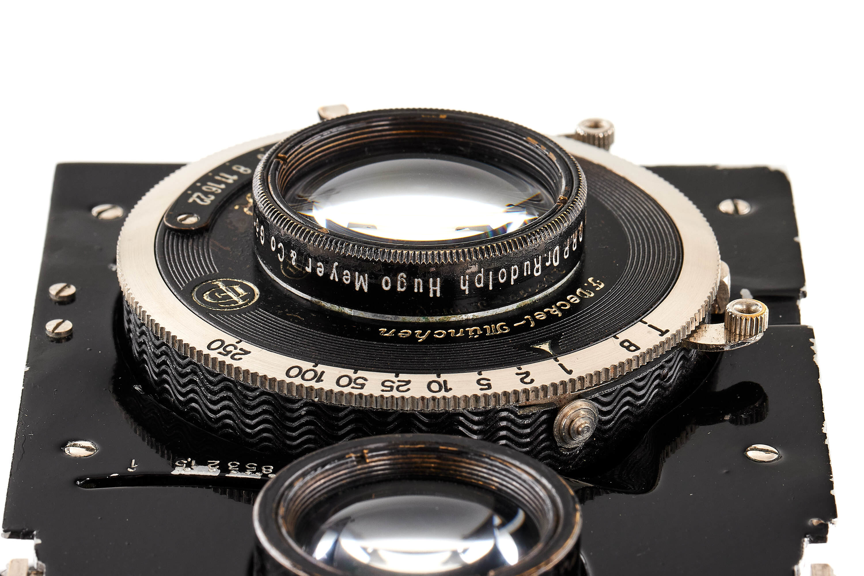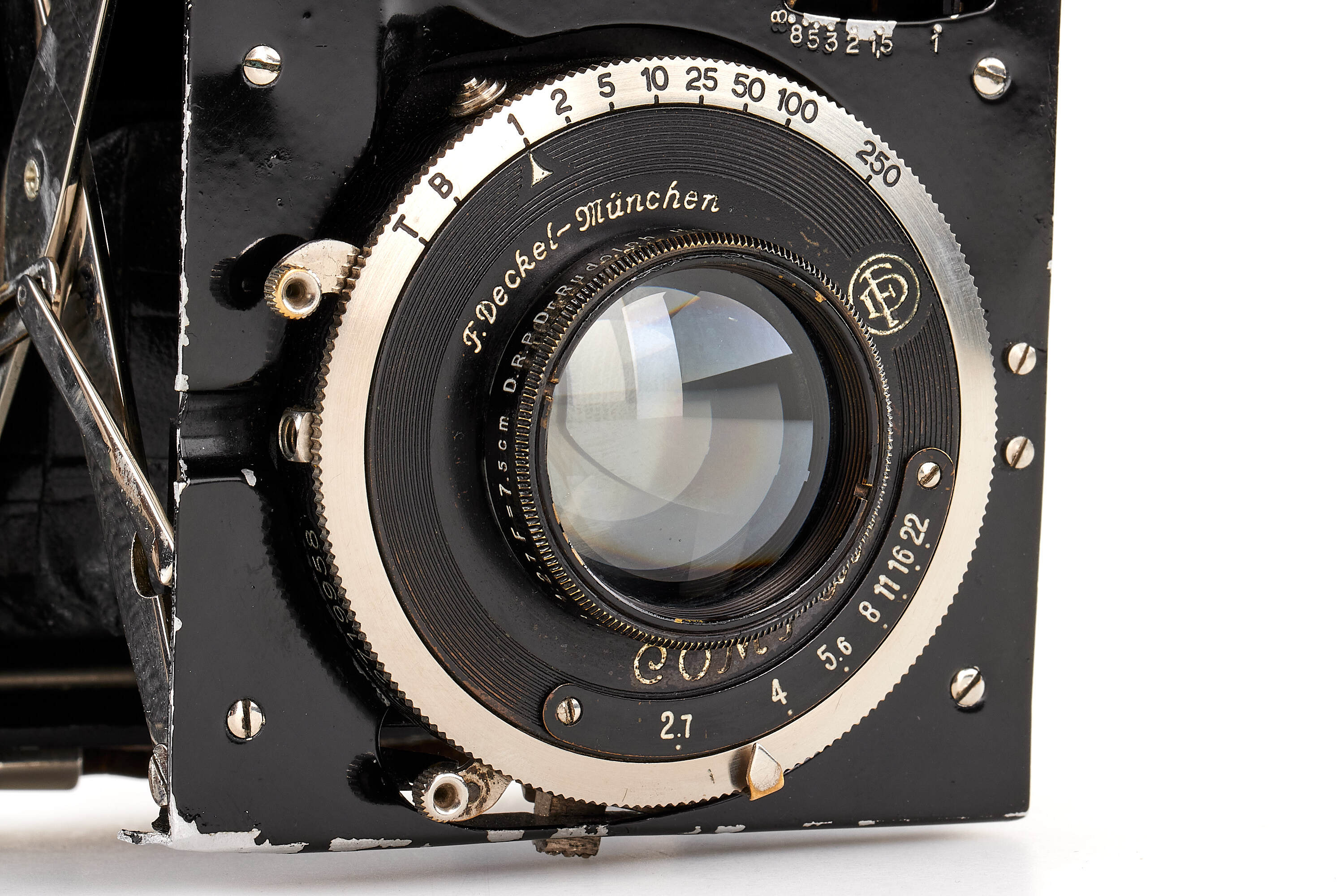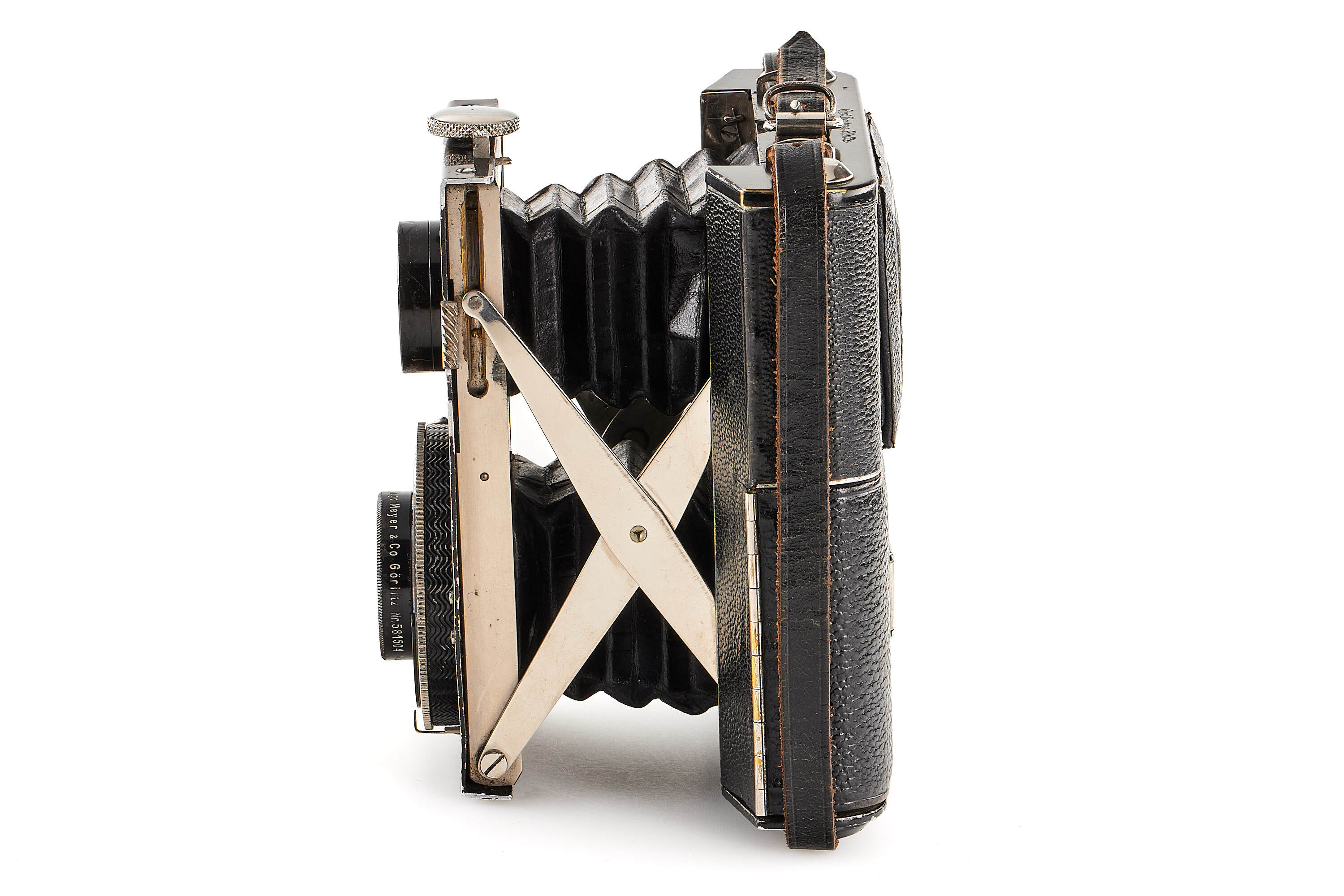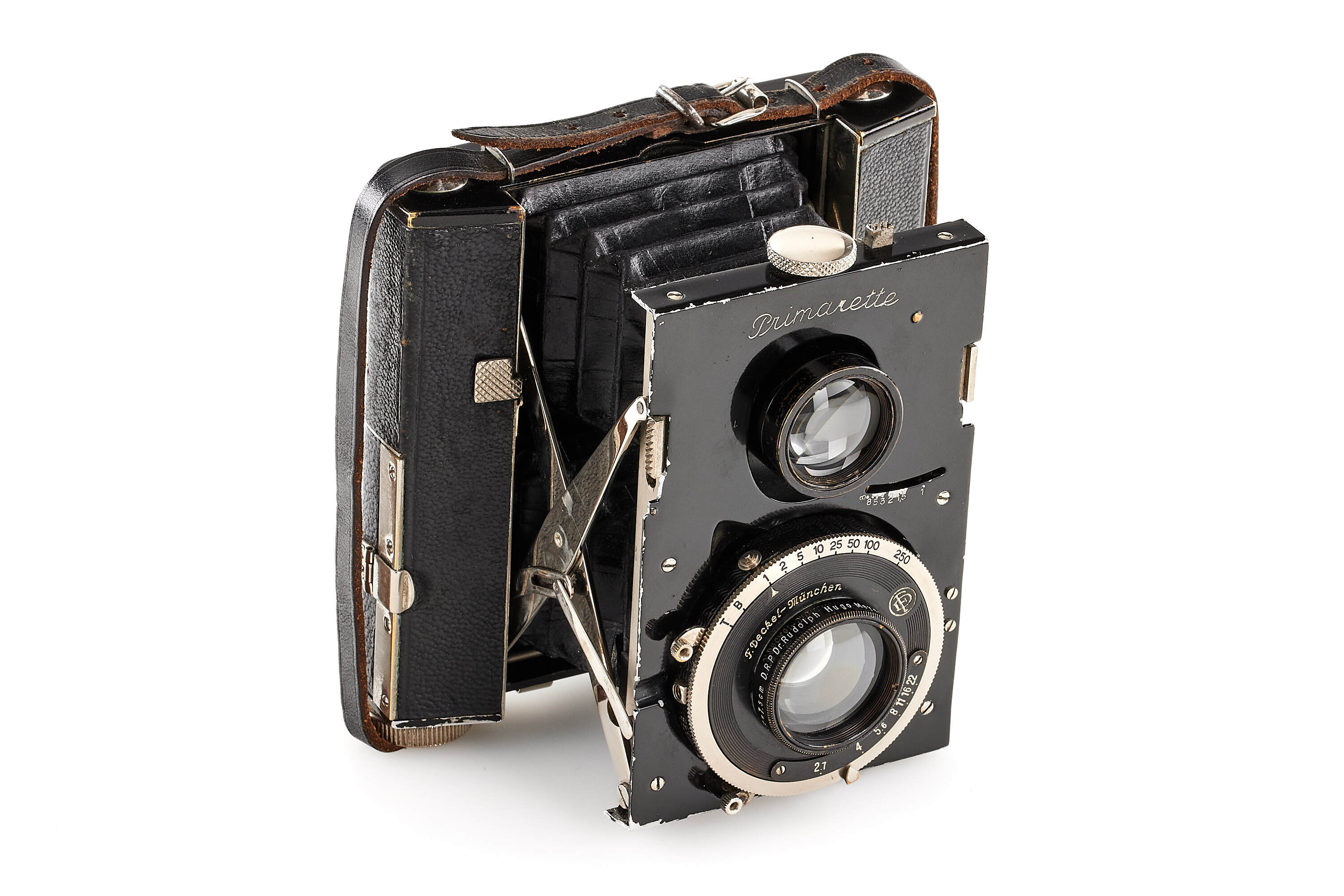 Rare twin-lens folding camera (not a reflex camera!) for 8 exposures 4x6.5cm on 127 film, separate bellows for taking and viewing lens, early version with front shutter release, in good condition, with sought-after Makro Plasmat 2.7/7.5cm no.581504 mounted in Compur shutter, good optics, note the automatic parallax correction, with rare original leather case.