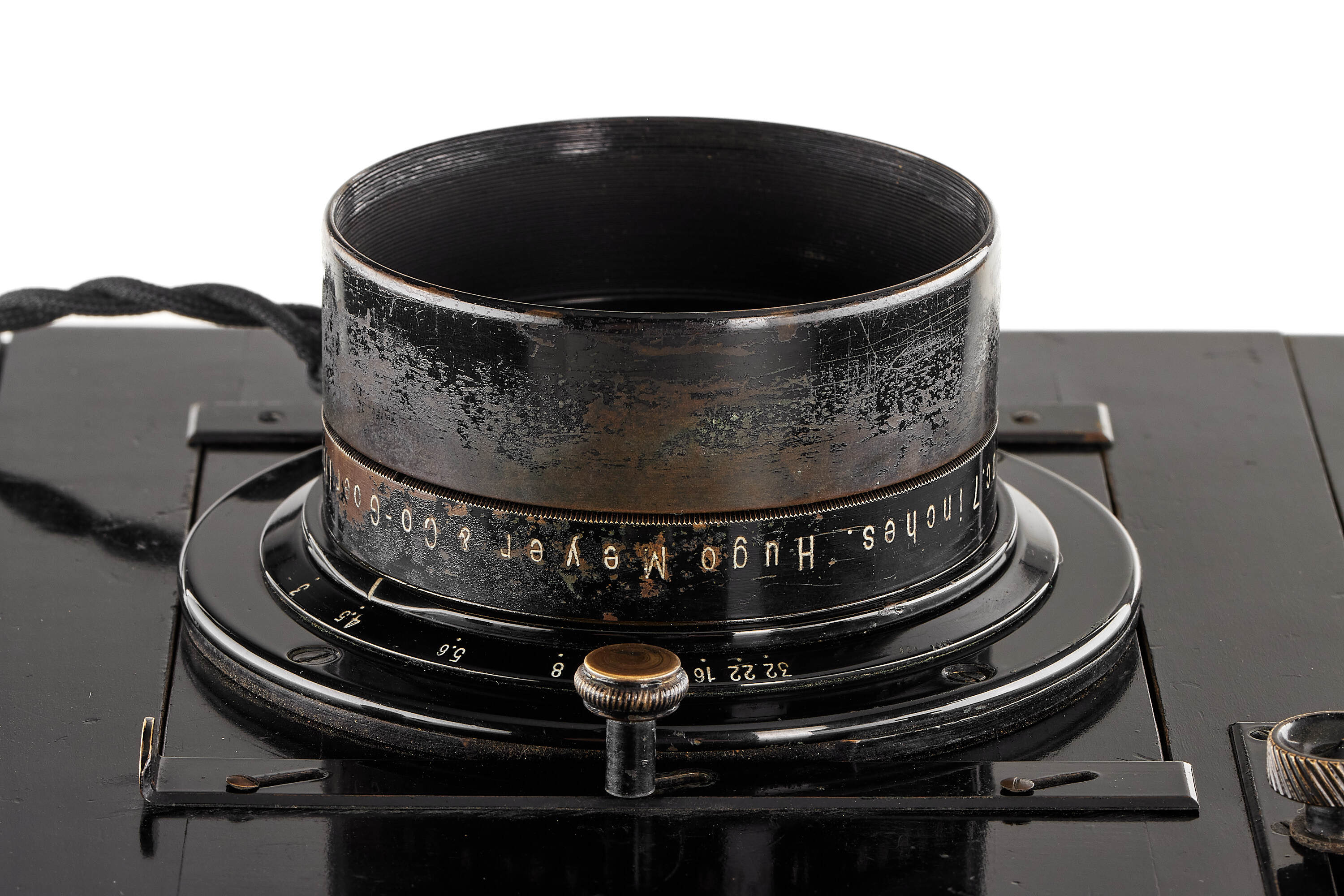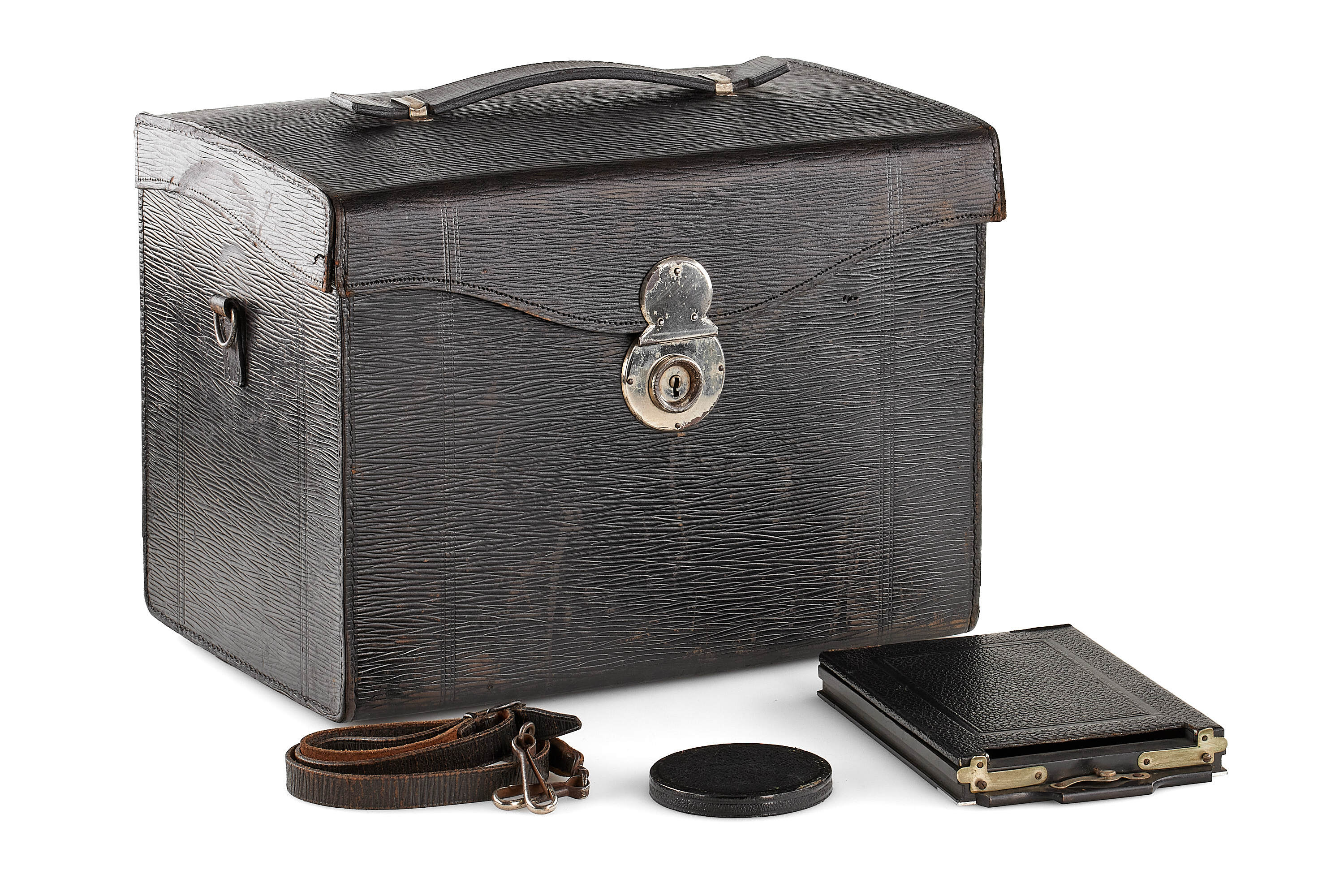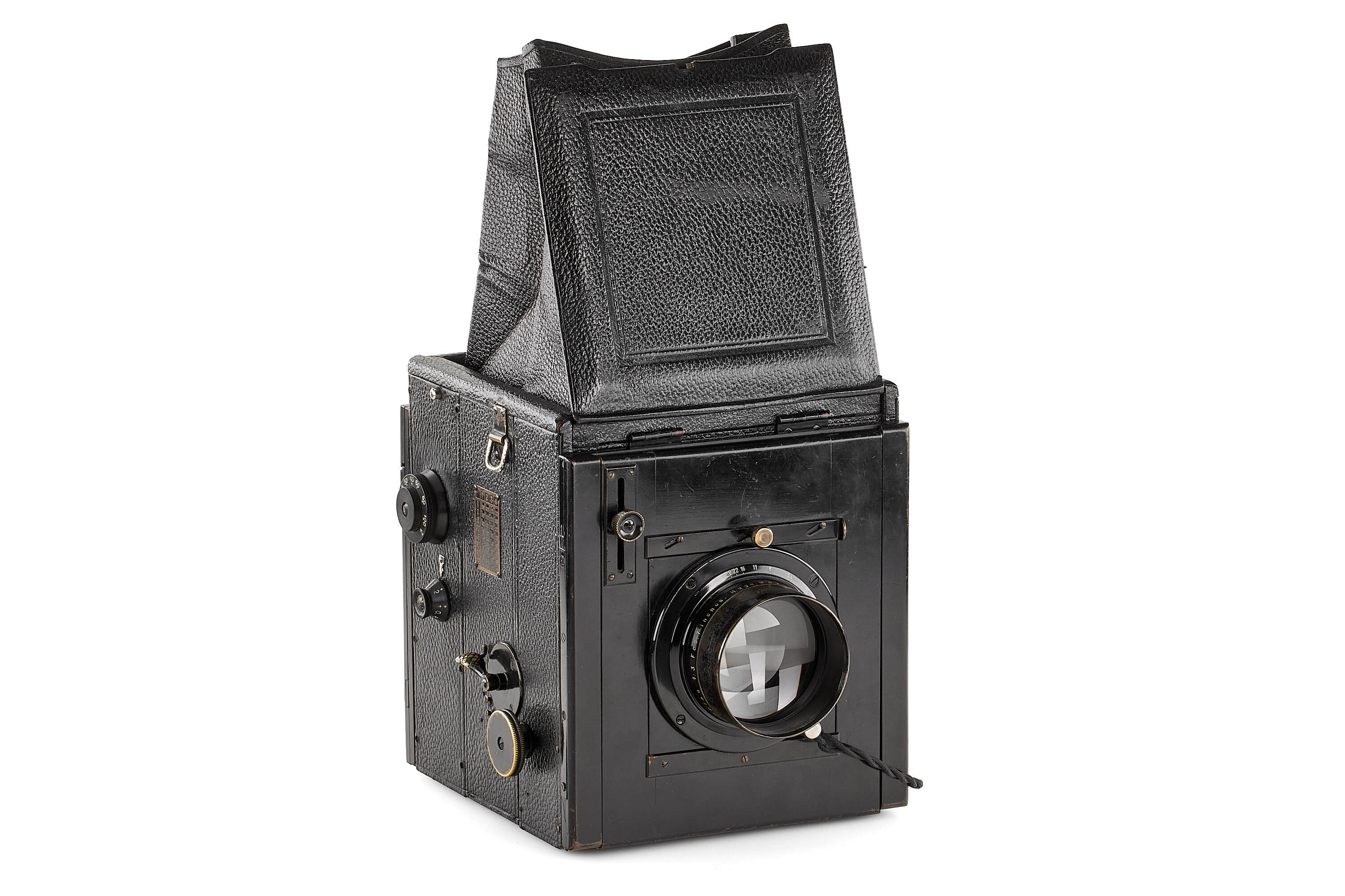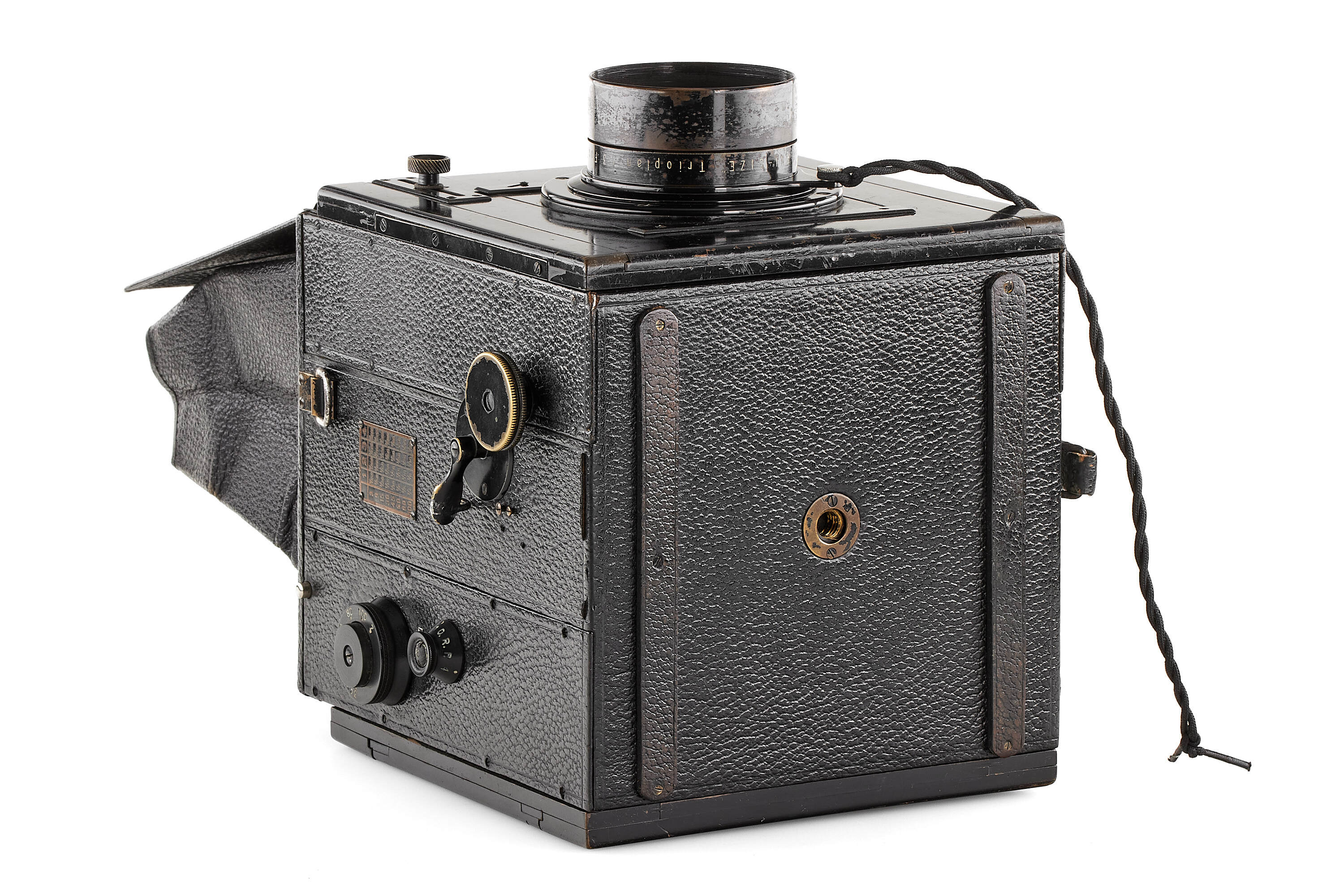 Quite early SLR for 9x12cm, focal plane shutter to 1/100sec, with unusual Meyer-Goerlitz 'Ani-Size' Trioplan 3/7" no.493438, in very good condition, shutter needs attention, with front lens cap, original hood, leather strap, film magazine holder and leather case.