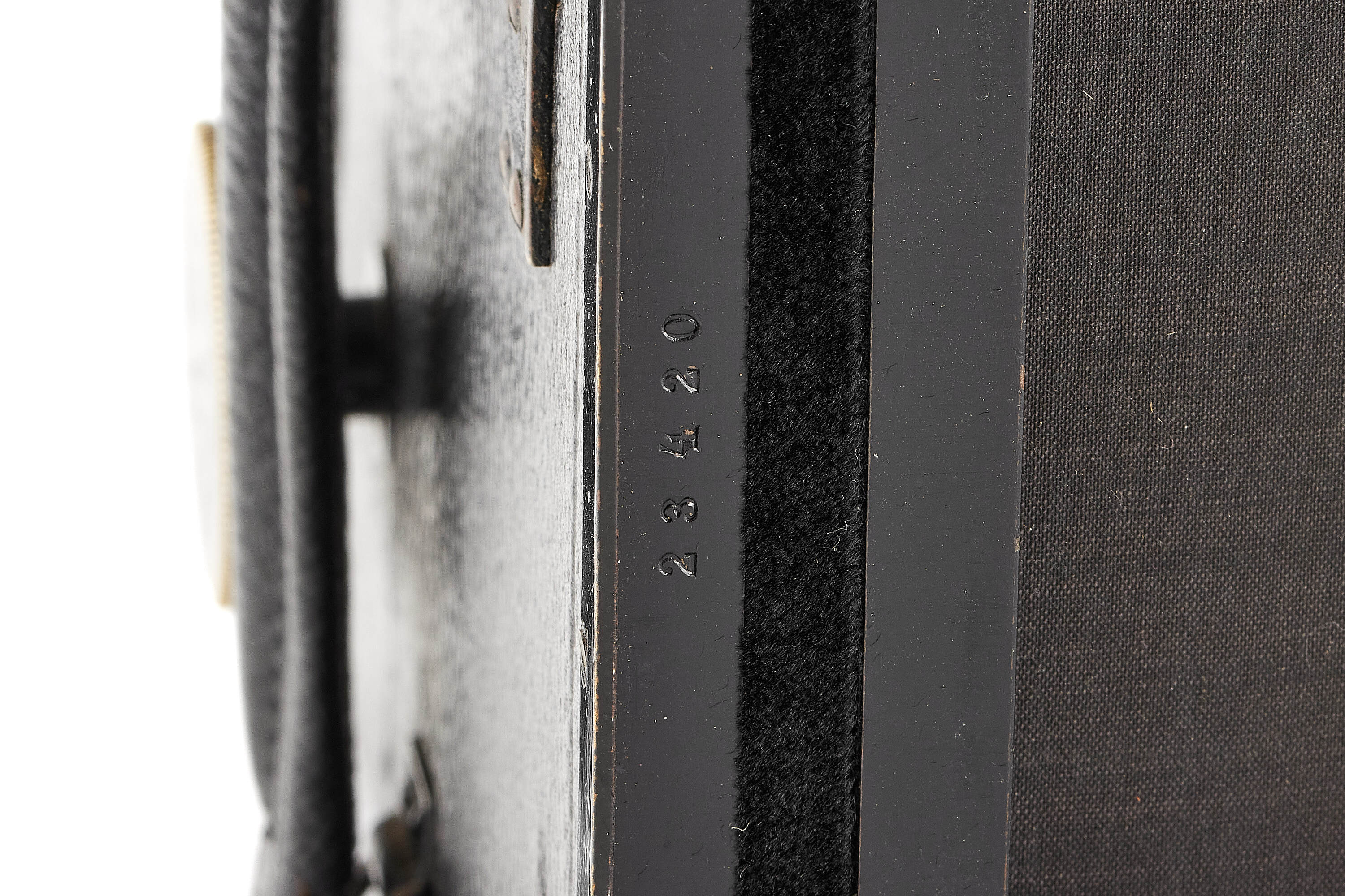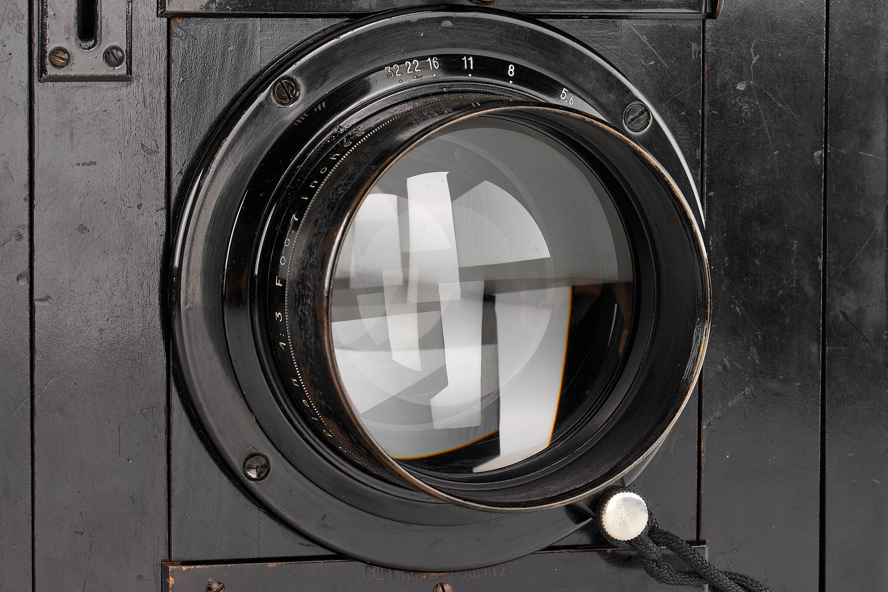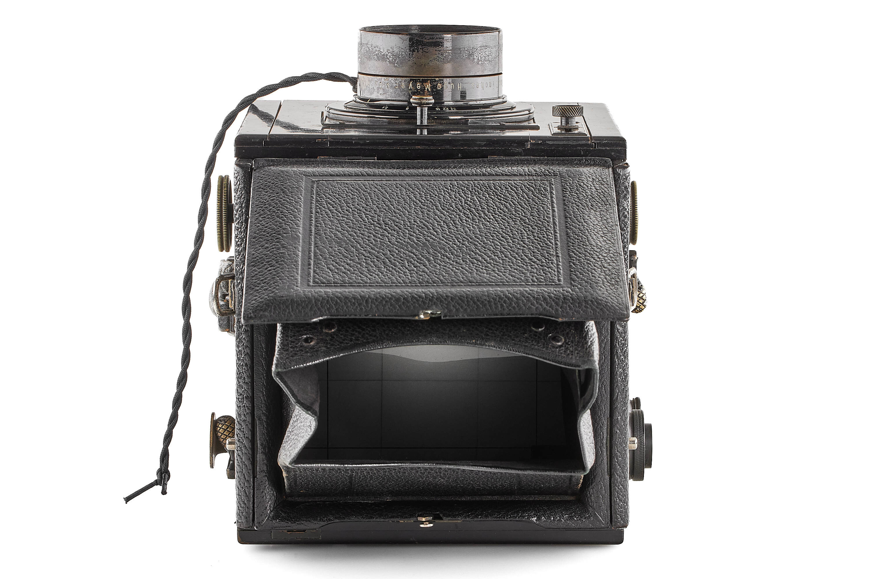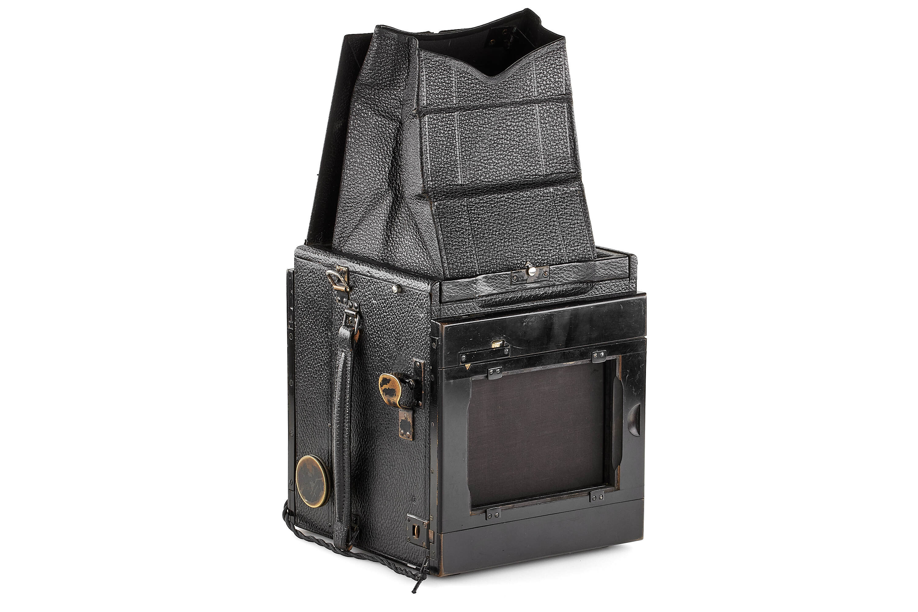 Quite early SLR for 9x12cm, focal plane shutter to 1/100sec, with unusual Meyer-Goerlitz 'Ani-Size' Trioplan 3/7" no.493438, in very good condition, shutter needs attention, with front lens cap, original hood, leather strap, film magazine holder and leather case.