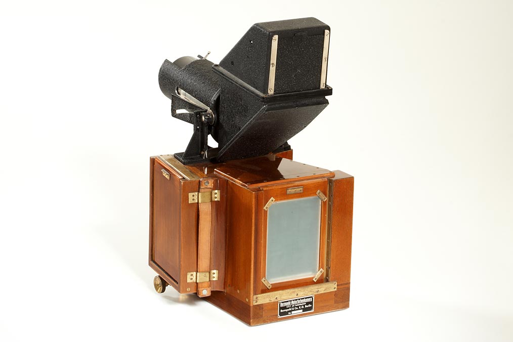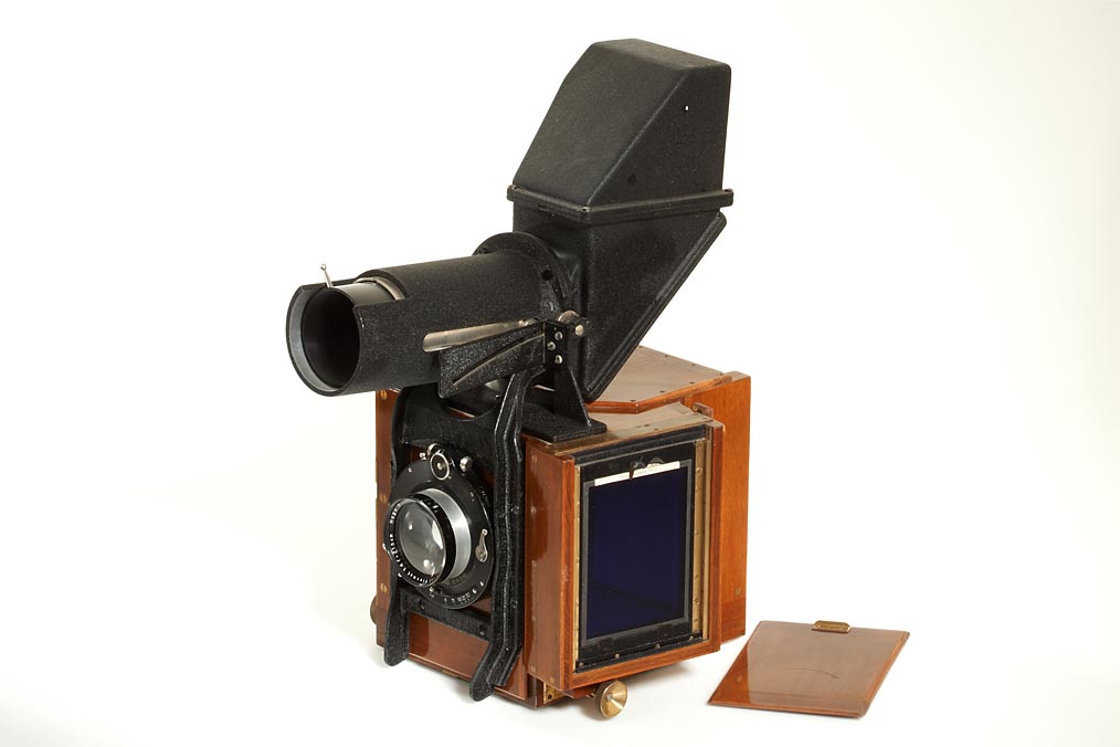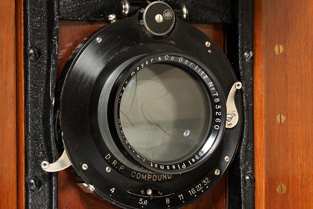 9 x12cm, rare tri-color camera, teak body with brass fittings, in perfect original condition with Meyer Doppel Plasmat 4/21.5cm no.783260 in Compound shutter (cap), with rare parallax-correcting reflex finder (Trioplan 4.5/210mm no.1069826), maker's plaque engraved: Bermpohl-Naturfarbenkamera Bermpohl & Co K.G. Berlin, this type of 3-colour camera uses mirrors to split light in order to expose plates simultaneously, with original instruction book and six spare filters