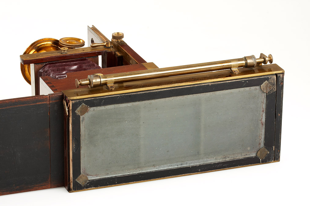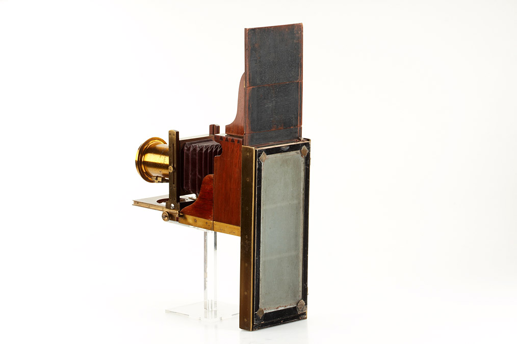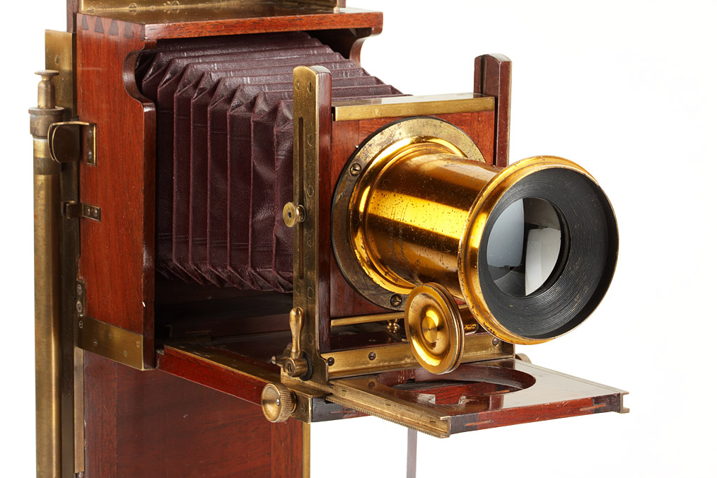 for three 7.5x8.5cm colour separations, the folding mahogany body with brass fittings and red bellows, original Schulze&Bartels Rathenow lens engraved: Dr.Miethe's Teleobjective, (red, green, and blue filters missing), two double plate holders, a rare and early 3-color camera, see Guide M.Auer, pict.2405