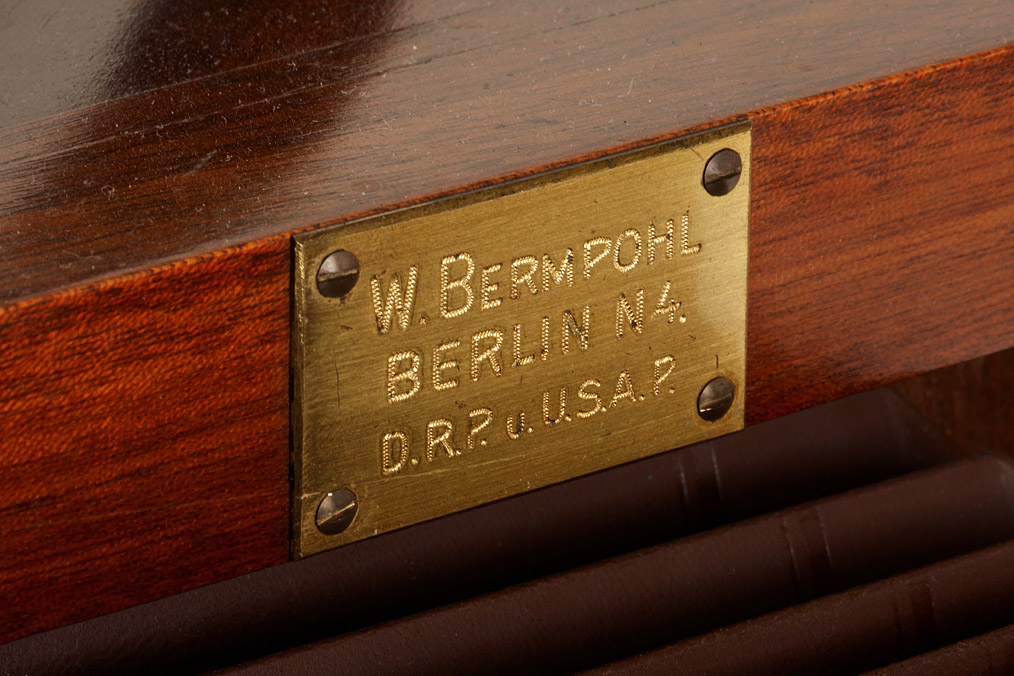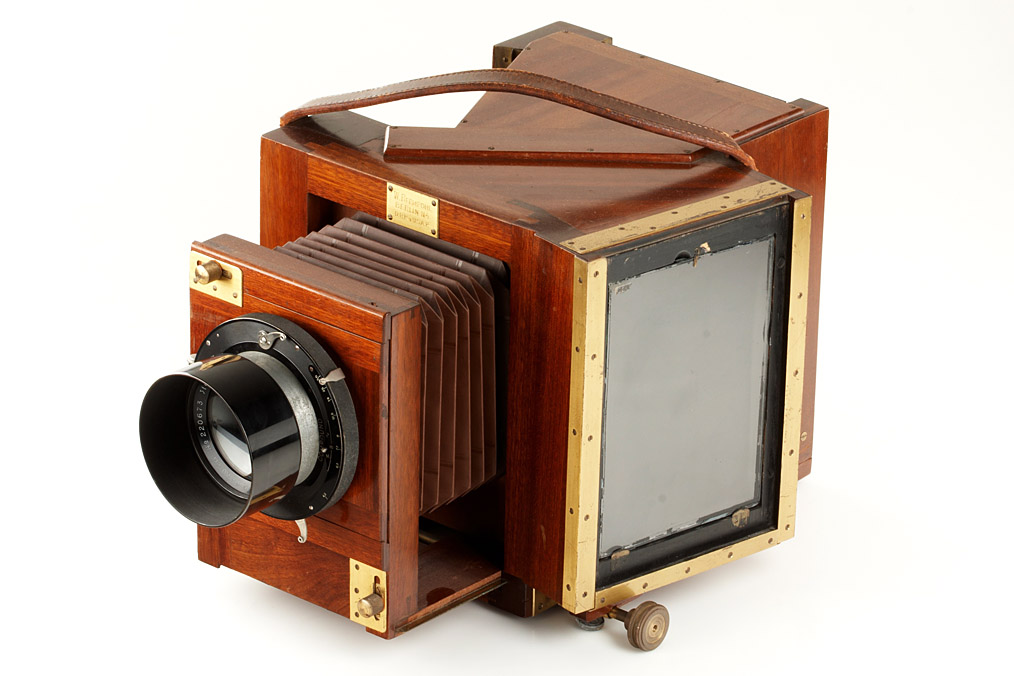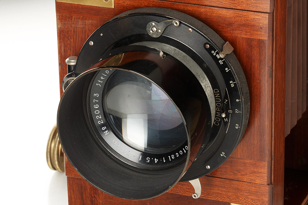 13x18cm, quality mahogany construction, Steinheil Doppelanastigmat Unofocal 4.5/30cm no.220673 in Compound shutter, brown leather bellows, maker's plaque stamped: W.BERMPOHL BERLIN N4 D.R.P.u.U.S.A. P., in excellent condition with all filters, focussing screen adapter, this type of 3-colour camera uses mirrors to split light in order to expose plates simultaneously
