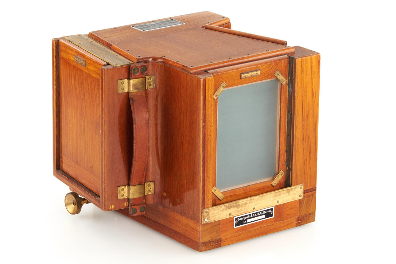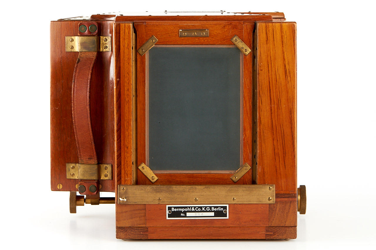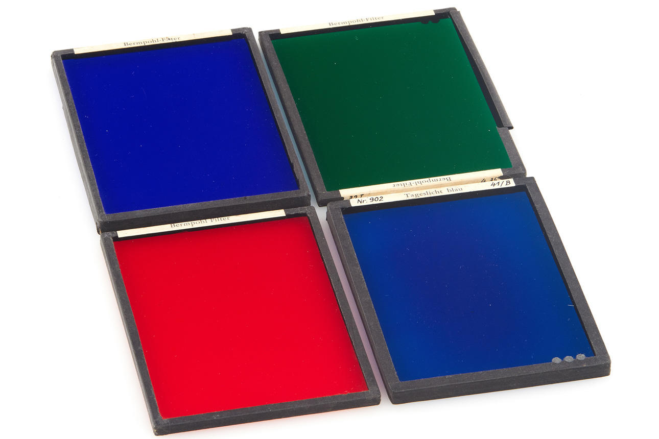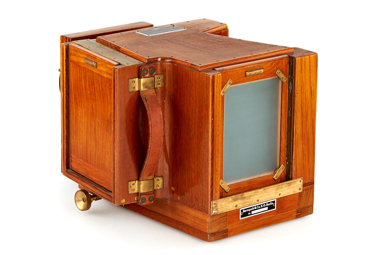 9x12cm, quality teak construction, Meyer Doppel Plasmat 4/21cm no.780912 (clean lenses) in Compound shutter, maker's metal plaque 'BERMPOHL NATURFARBENKAMERA BERMPOHL & Co. KG BERLIN', complete with all filters, exchange filters, three original double film holders - all in beautiful original and perfect working condition, this type of 3-colour camera uses mirrors to split light in order to expose plates simultaneously