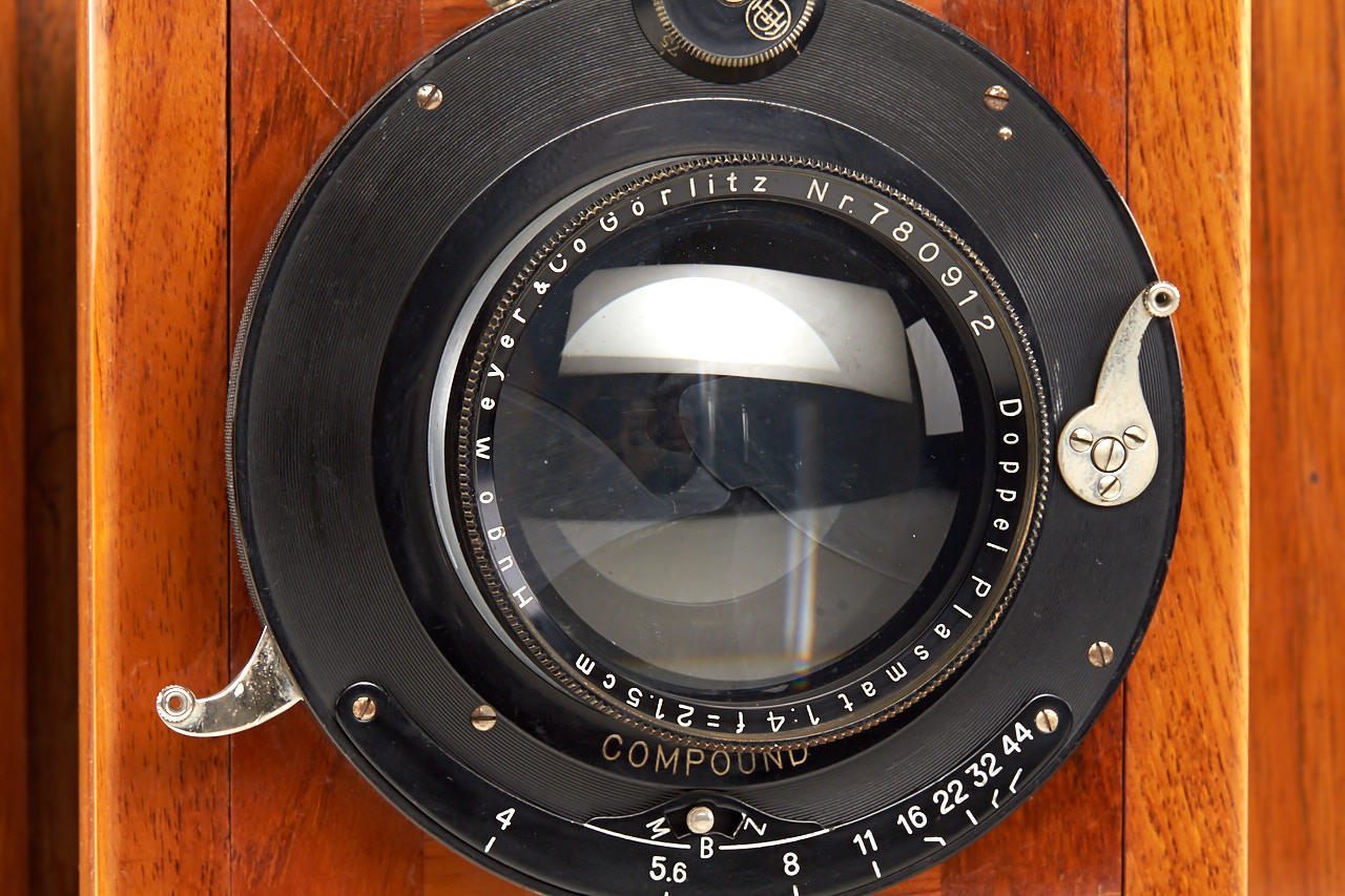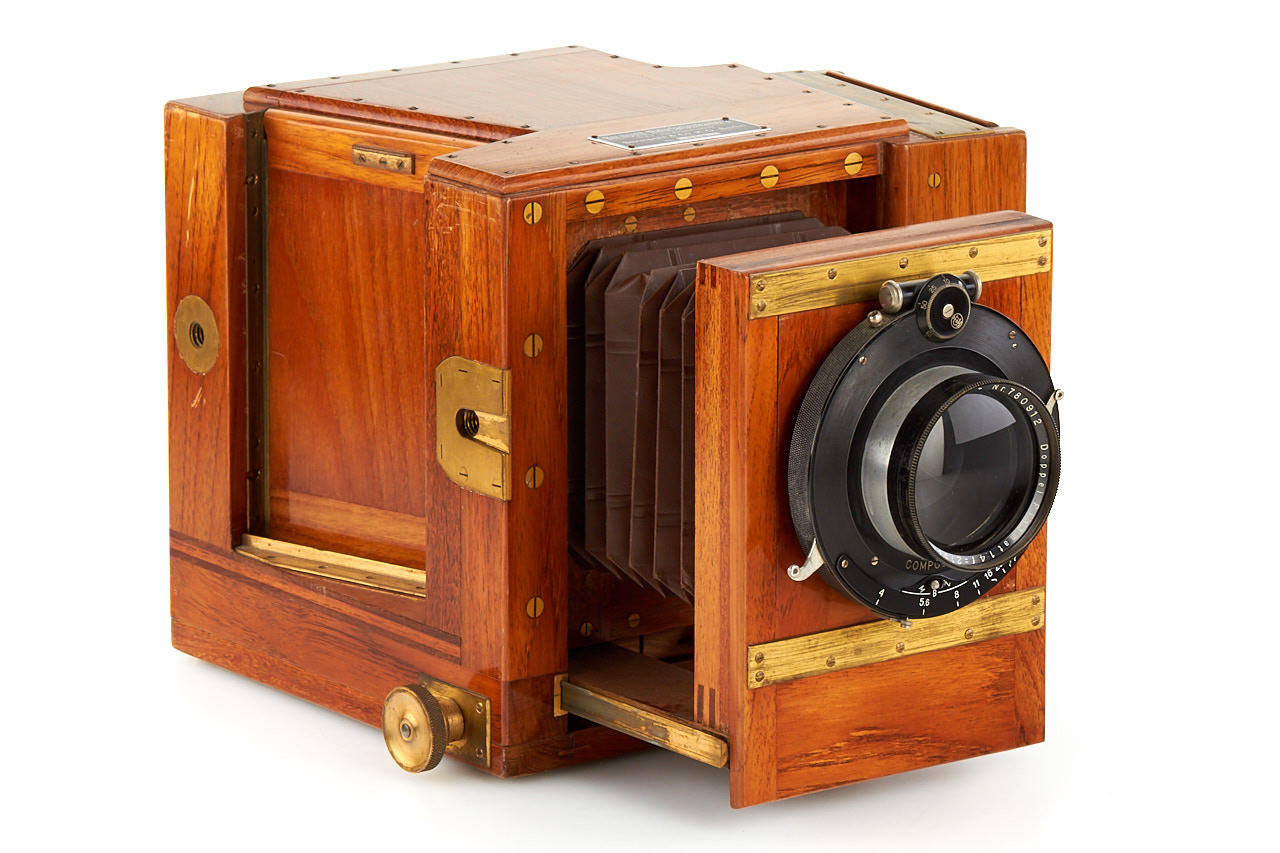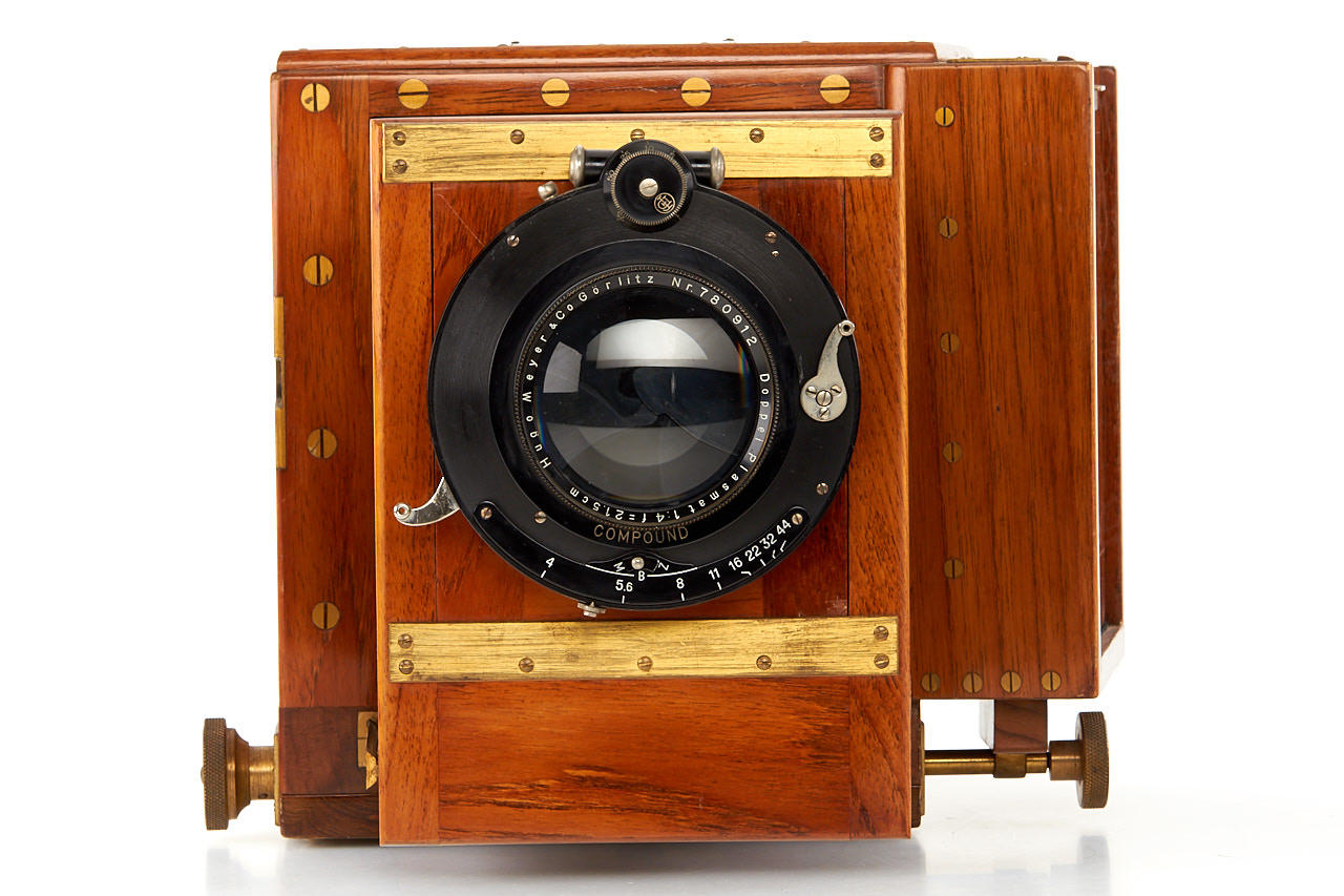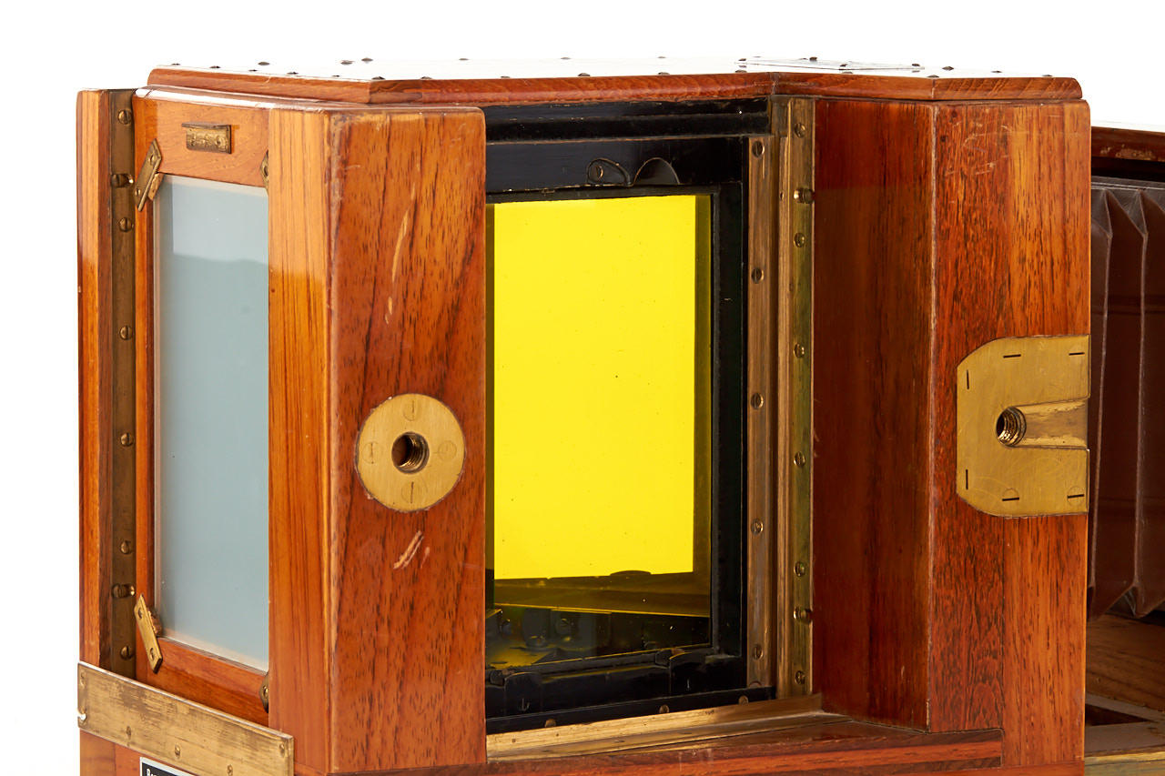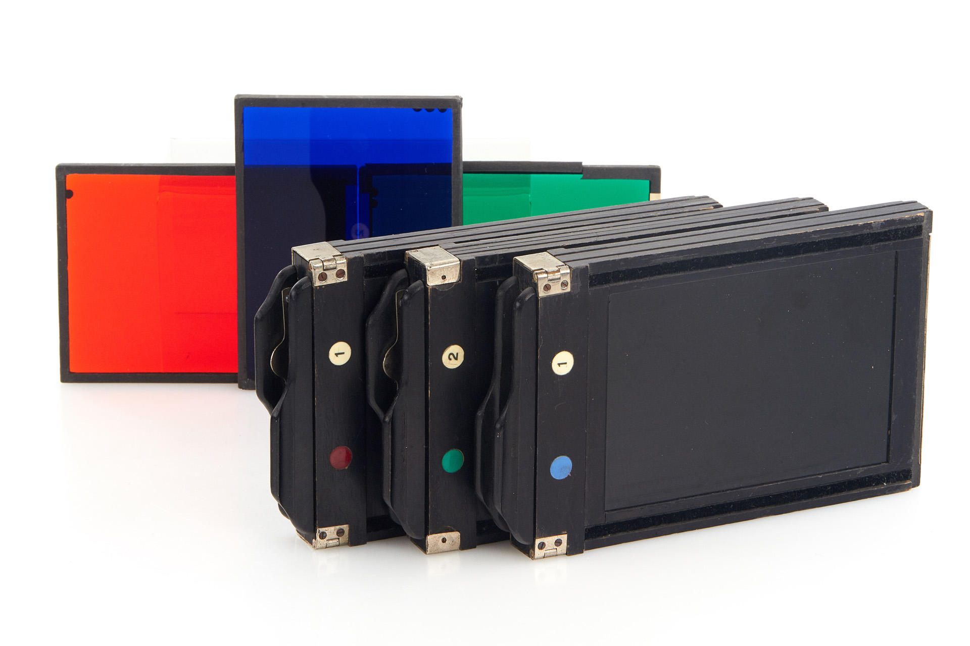 9x12cm, quality teak construction, Meyer Doppel Plasmat 4/21cm no.780912 (clean lenses) in Compound shutter, maker's metal plaque 'BERMPOHL NATURFARBENKAMERA BERMPOHL & Co. KG BERLIN', complete with all filters, exchange filters, three original double film holders - all in beautiful original and perfect working condition, this type of 3-colour camera uses mirrors to split light in order to expose plates simultaneously