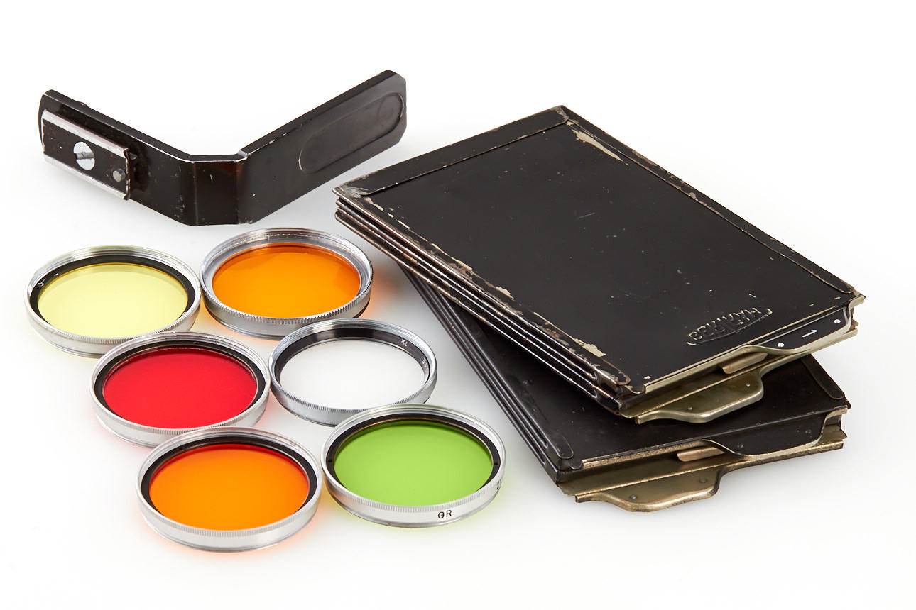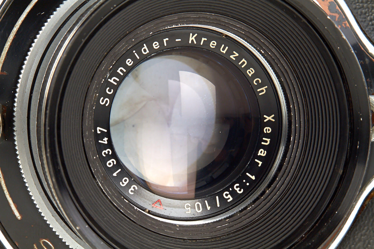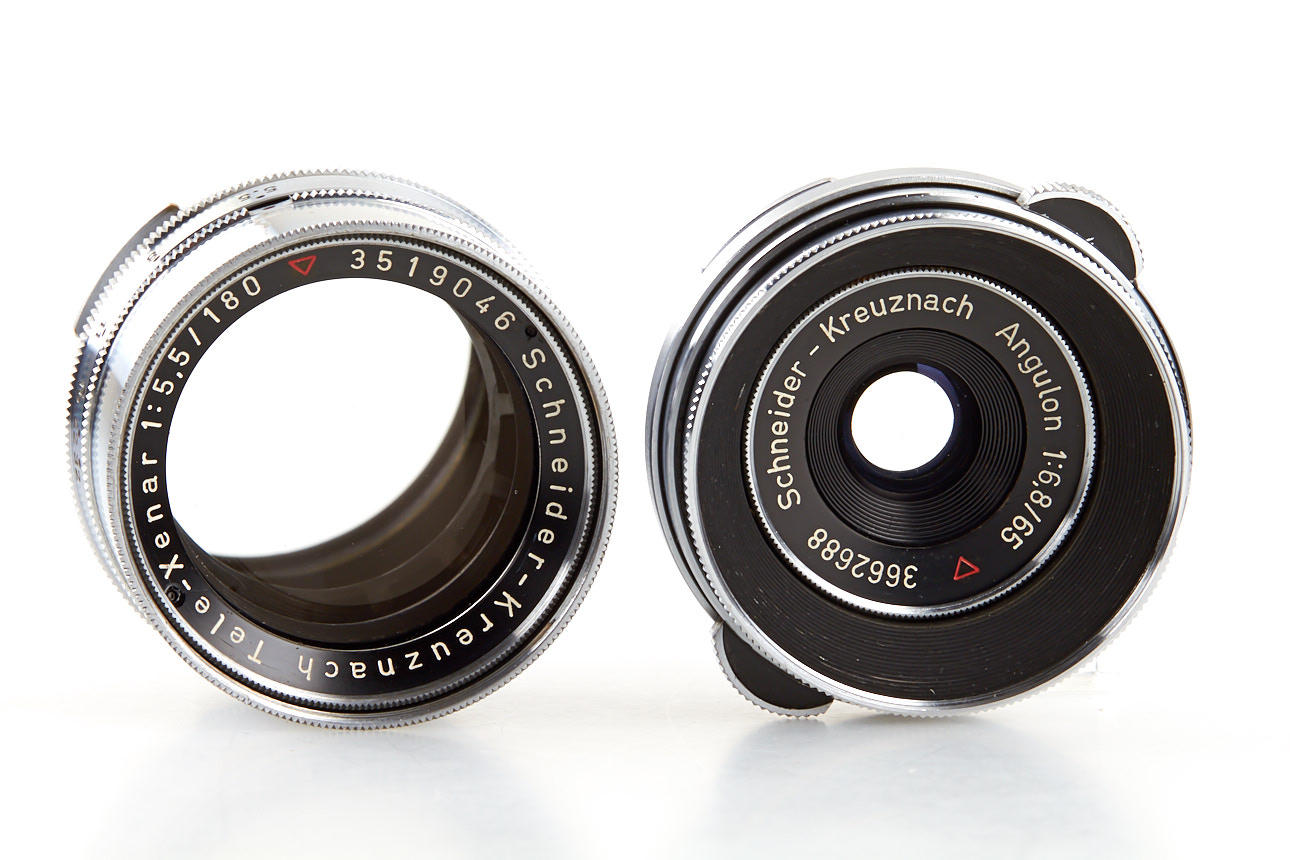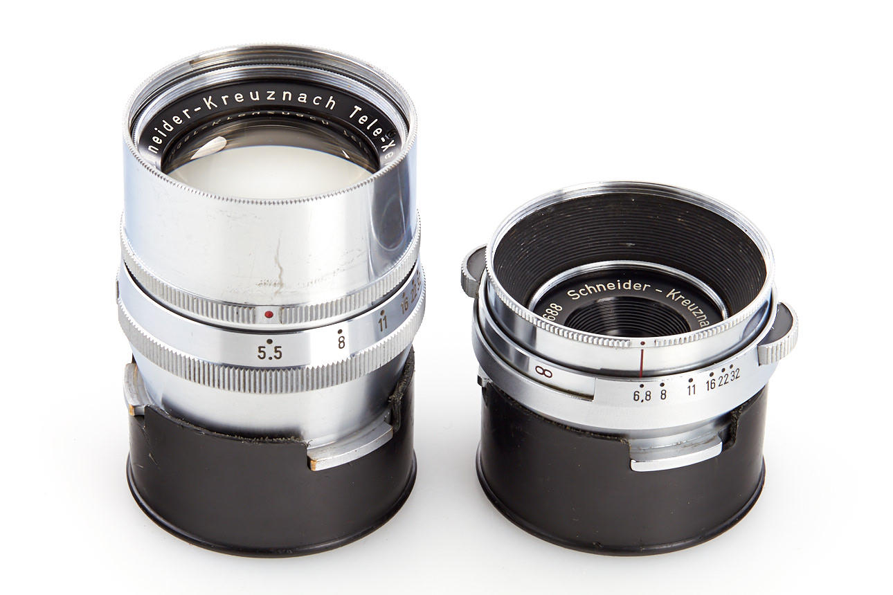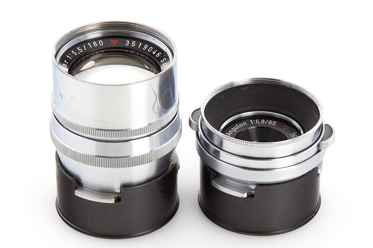 6x9cm camera outfit in good condition with Xenar 3.5/105mm no.3619347, Tele-Xenar 5.5/180mm no.3519046, Angulon 6.8/65mm no.3662688, sports-finder, two double plate holders, grip, accessory holder, strap, 8 filters, copy of instruction book, all in original outfit case