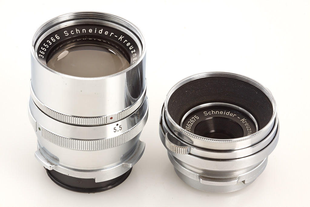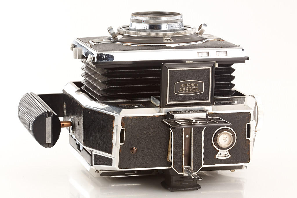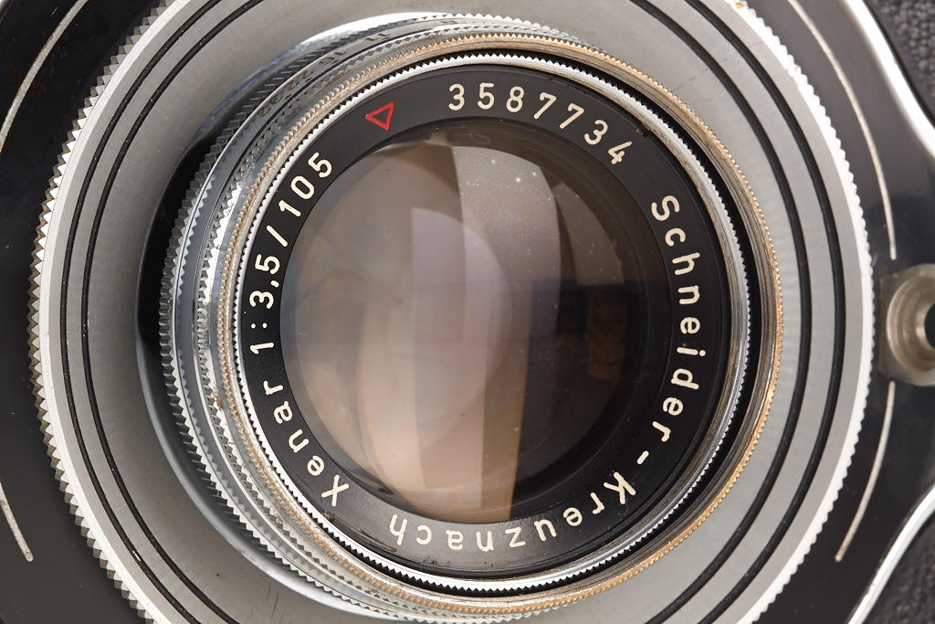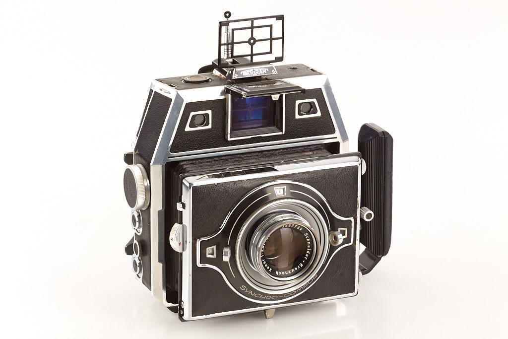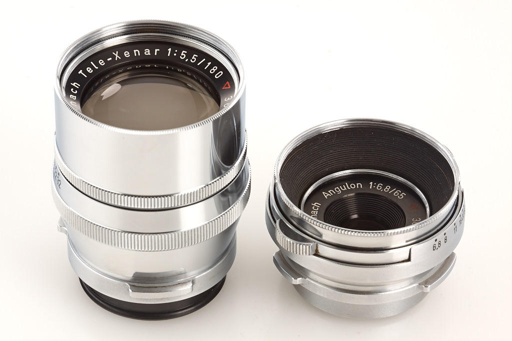 Bertram Press camera outfit in beautiful condition with Xenar 3.5/105mm no.3587734, Tele-Xenar 5.5/180mm no.3655366 (caps), Angulon 6.8/65mm no.3662675 (caps), sports-finder, instruction book, 2 plate film holders