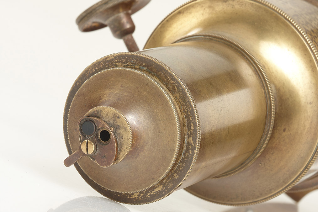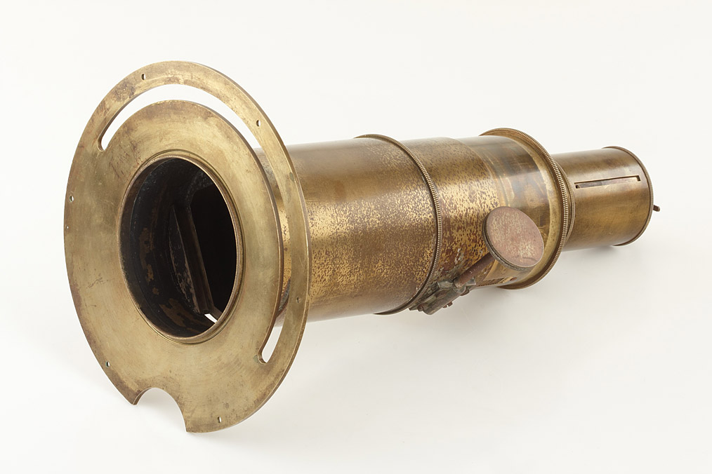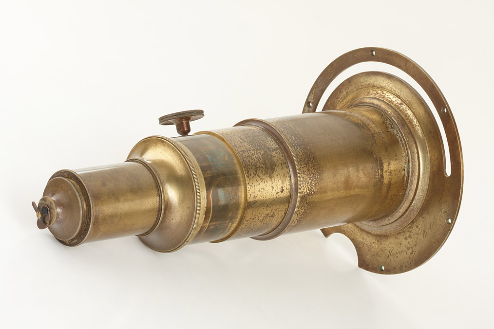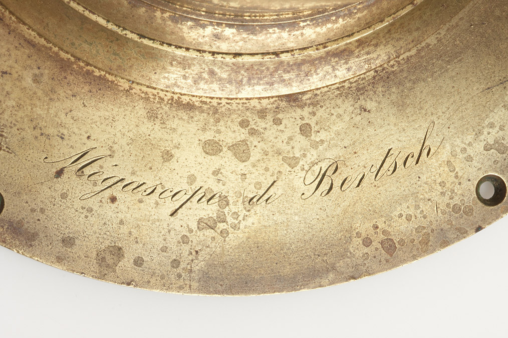 brass projection lens for the Bertsch Megascope (Solarscope) 'enlarger' with rack and pinion focusing. Adolph Bertsch is best known for his Chambre Automatique, an all-metal wet-collodion camera which he demonstrated to the Société Francaise de Photographie in 1860. In order to enlarge the quite small negatives he designed the Magnascope solar enlarger in the same year.