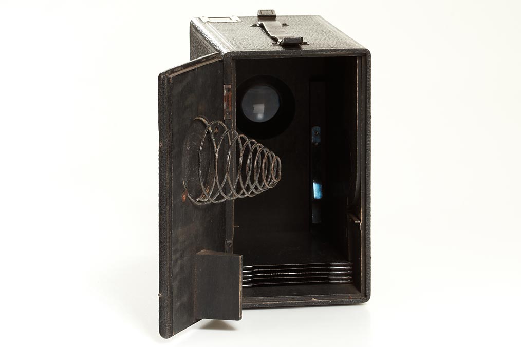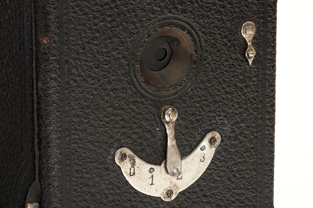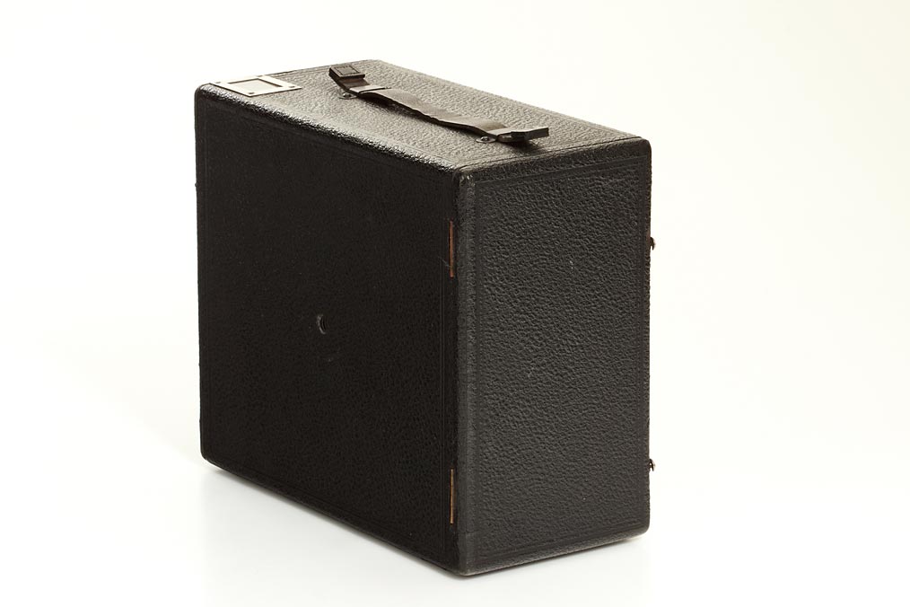 9x12cm, rare German falling plate type box for 12 plates, wooden, leather covered body, nickel fittings, in very good original condition with five special platefilm holders
