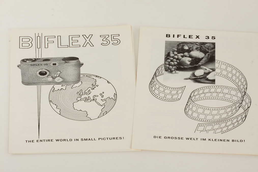 two original metal design prototypes of the famous and rare Swiss subminiature, two original Biflex 35 advertisings (size 22.5x22.5cm), Biflex everready case, papers and spare parts