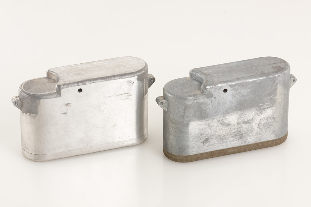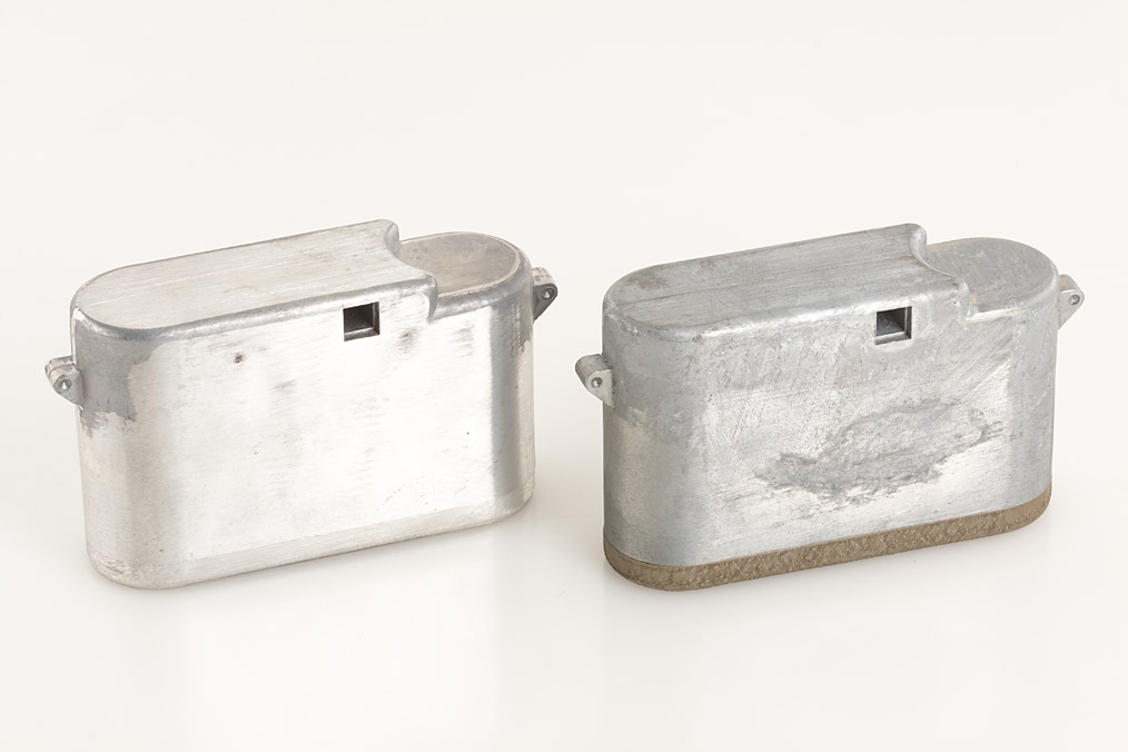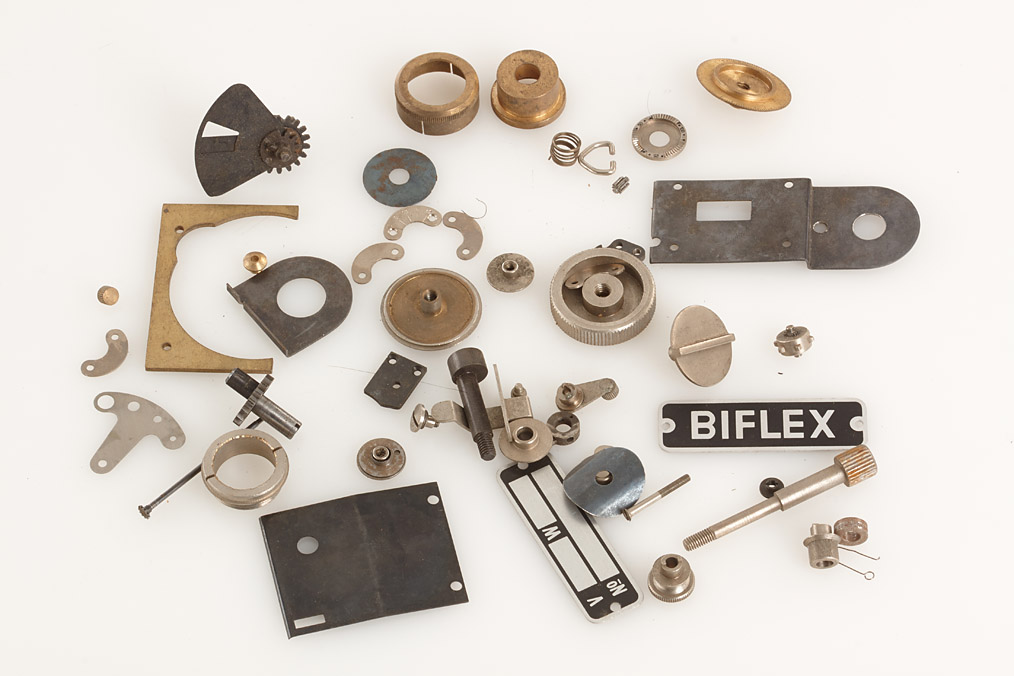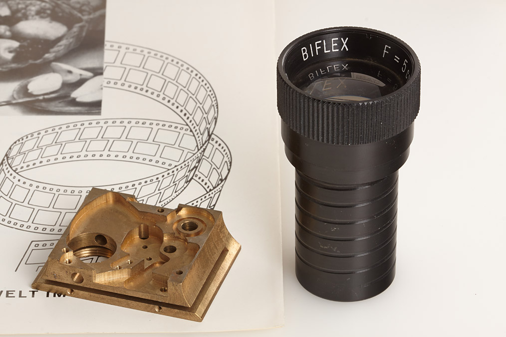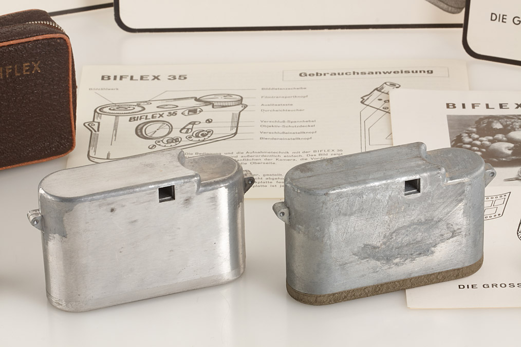 two original metal design prototypes of the famous and rare Swiss subminiature, three original Biflex 35 advertisings (size 22.5x22.5cm), Biflex everready case, film spool, projection lens 1.6/5cm, papers and spare parts