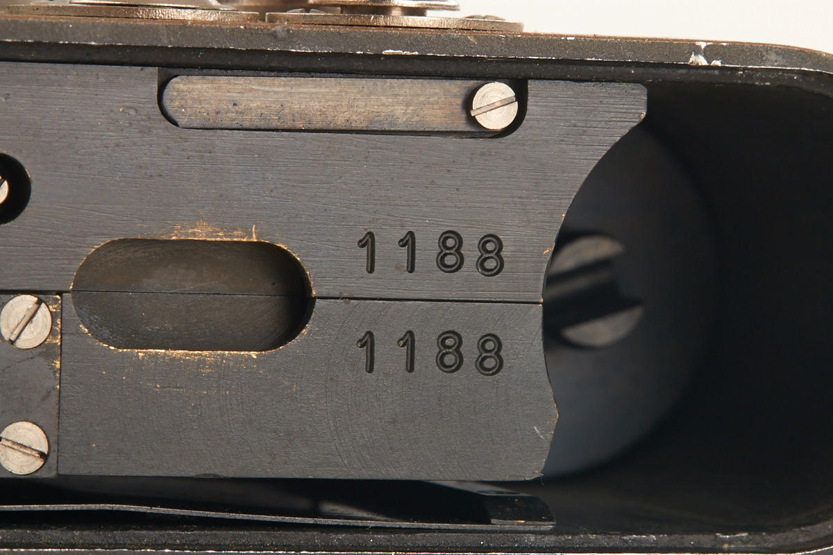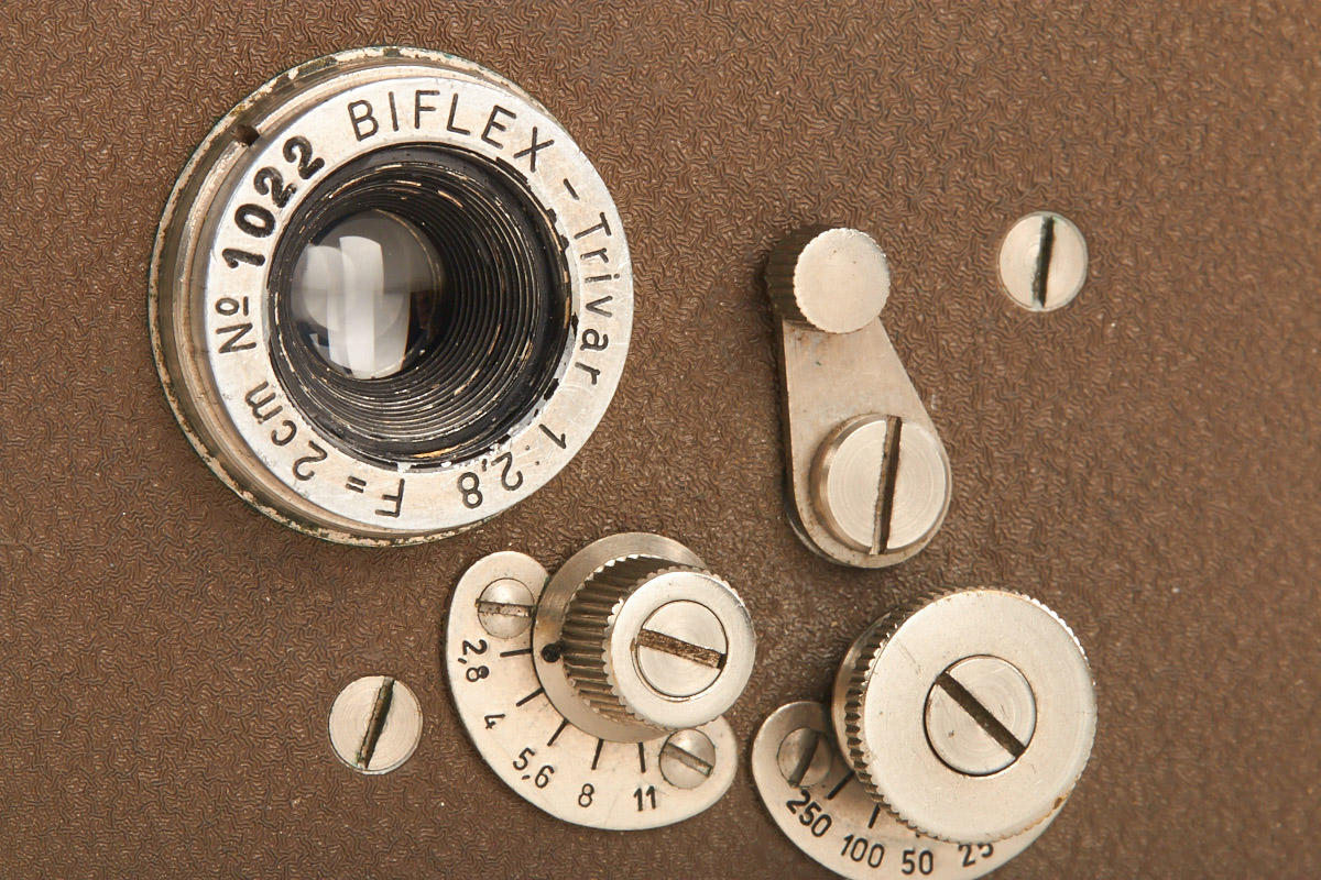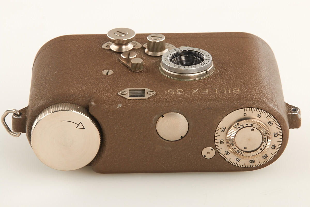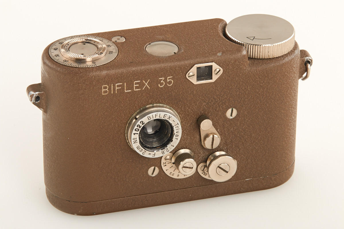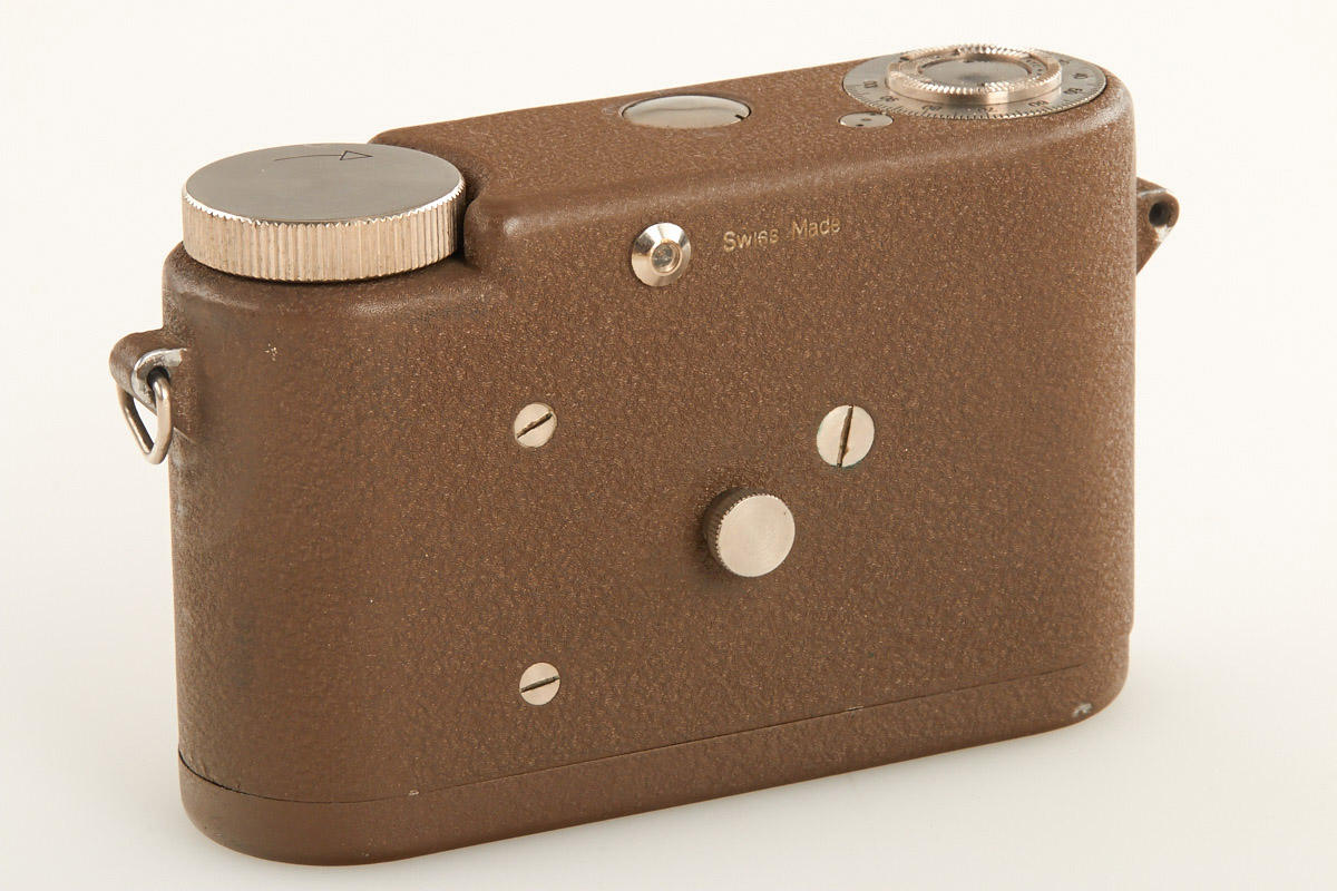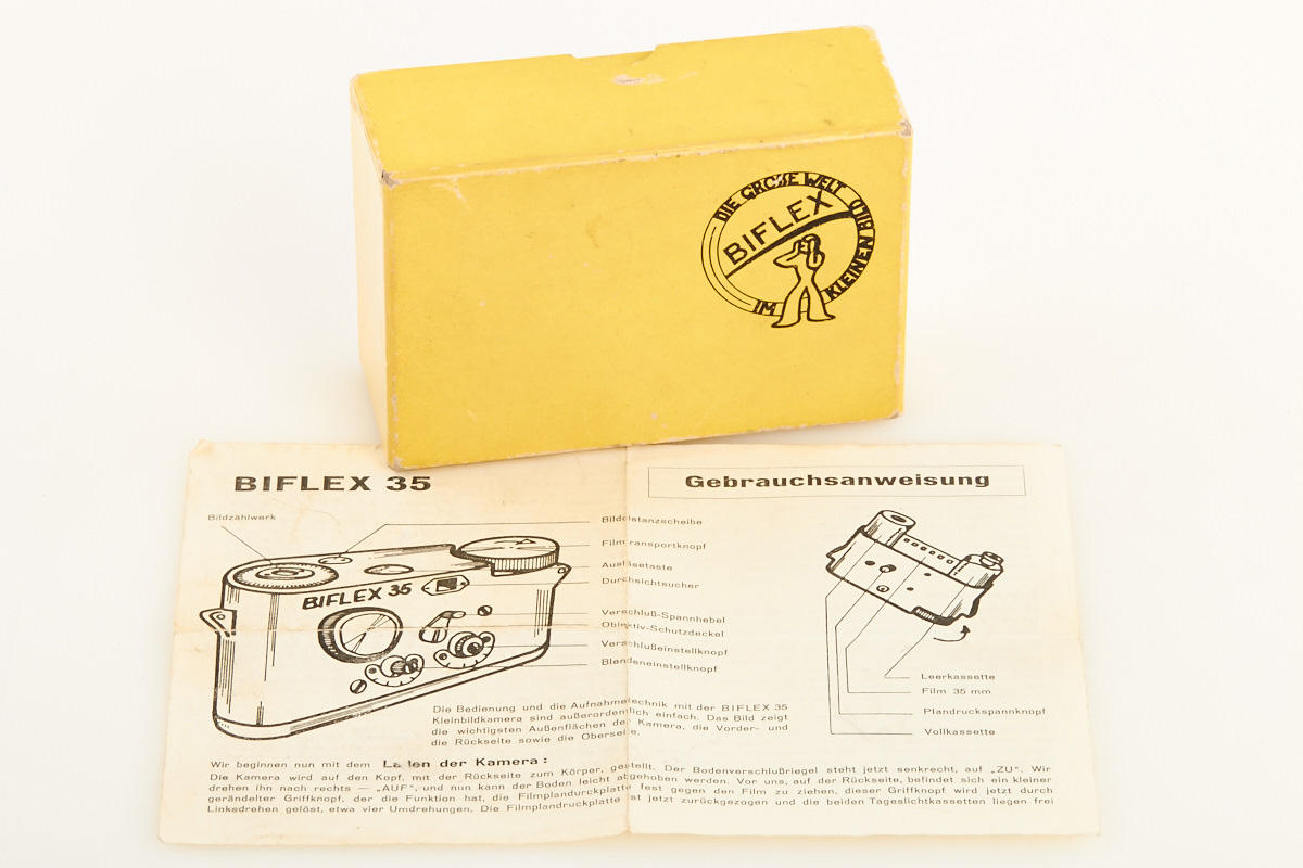 very rare and unusual Swiss made subminiature camera for 11x11mm exposures, internal number 1188, Biflex-Trivar 2.8/2cm with original cap, in near mint condition with chain, instructions, hand written notices and original maker's box with matching number
