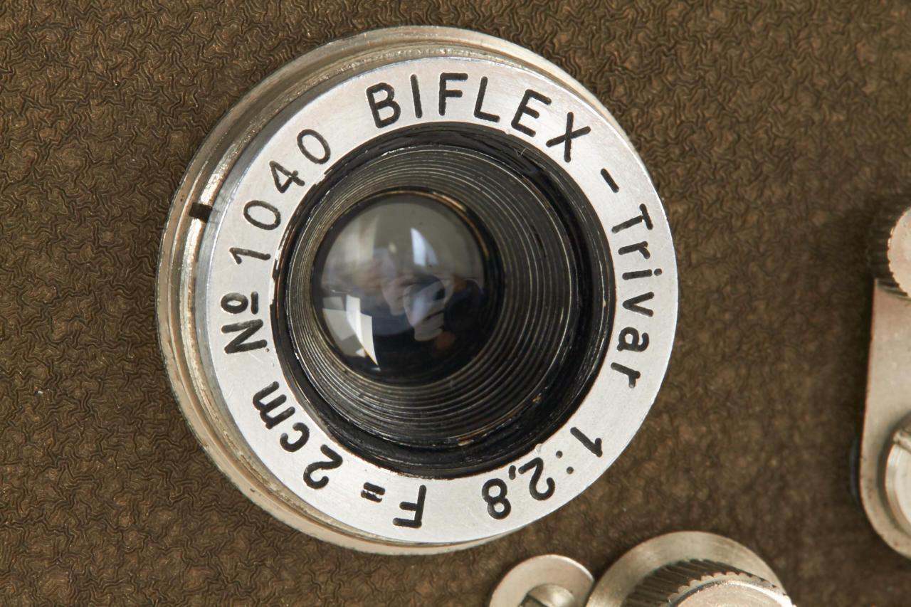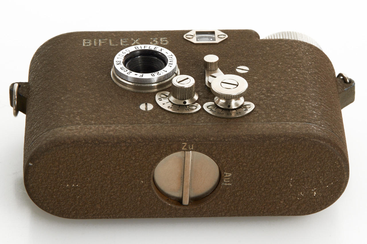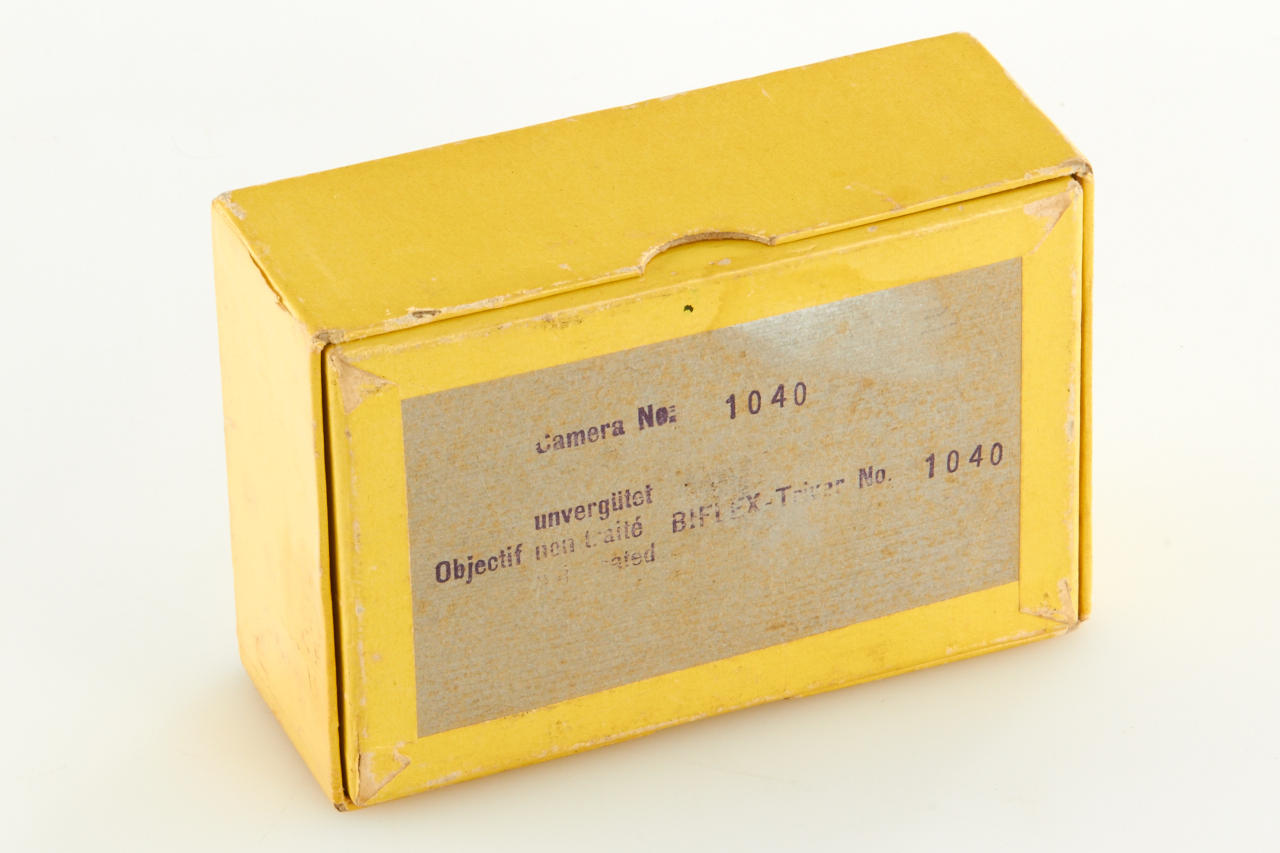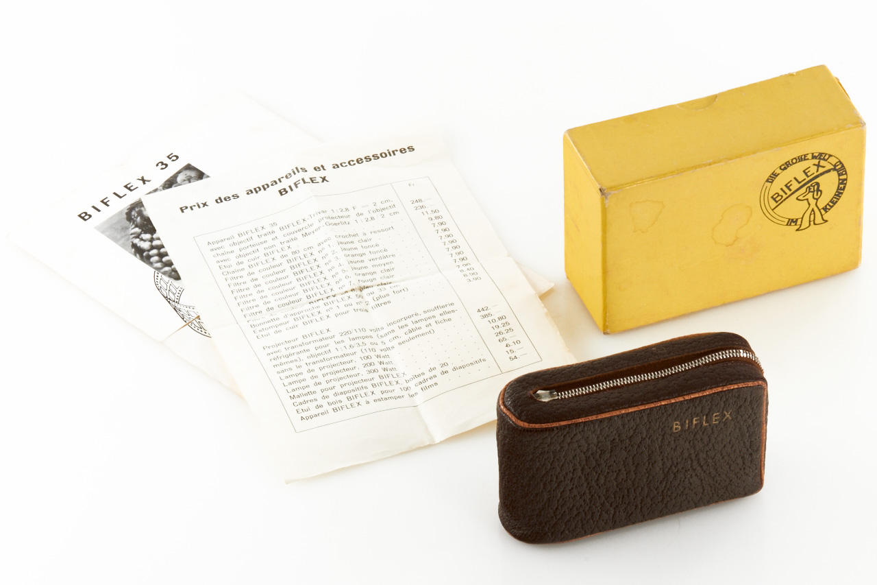very rare and unusual Swiss made subminiature camera for 11x11mm exposures on standard 35mm film, matching number 1040 of the camera and lens, Biflex-Trivar 2.8/2cm, in very good condition with everready case and maker's box with stamped matching serial number