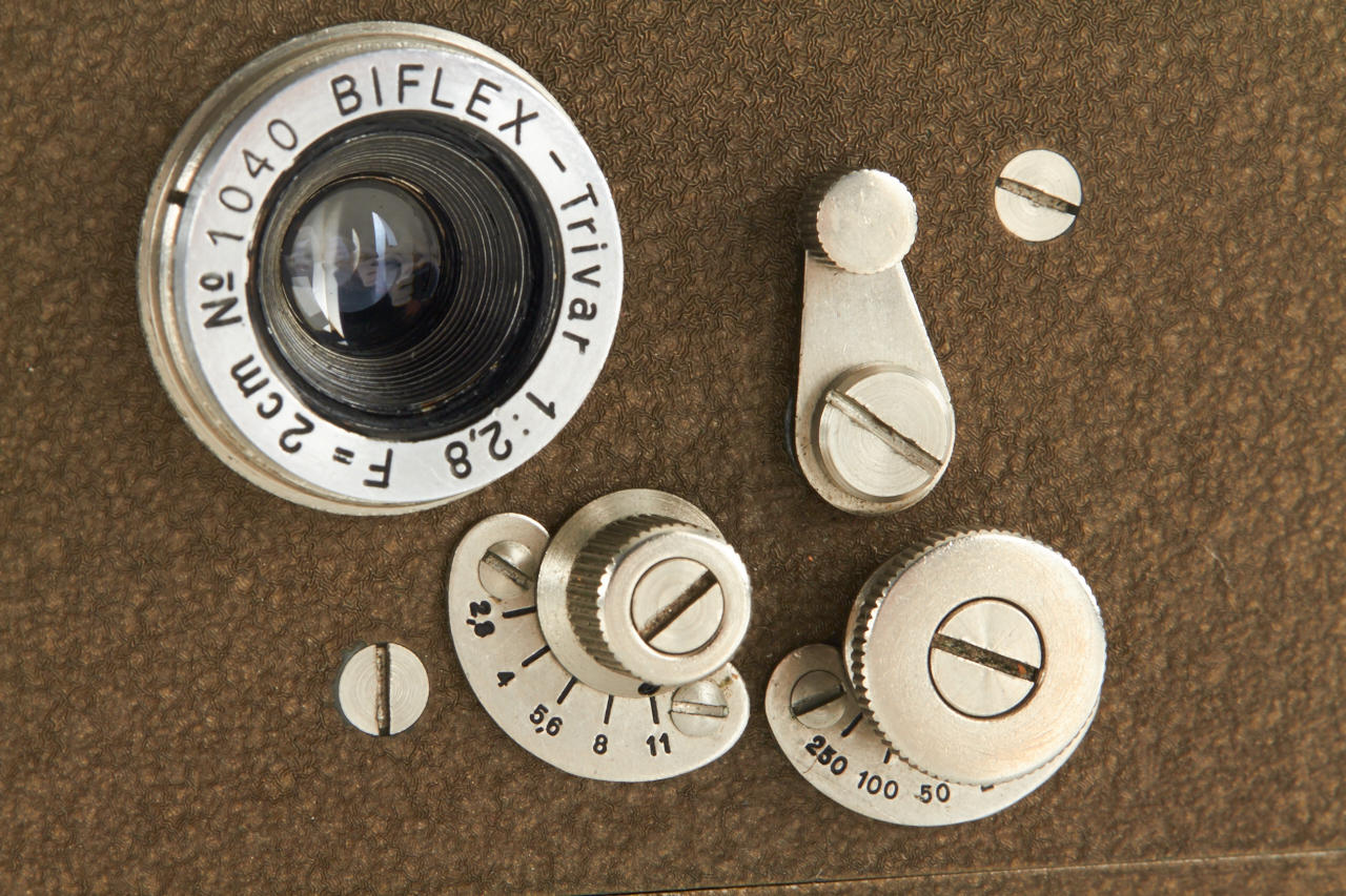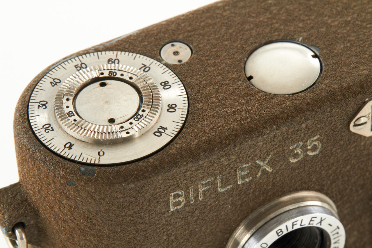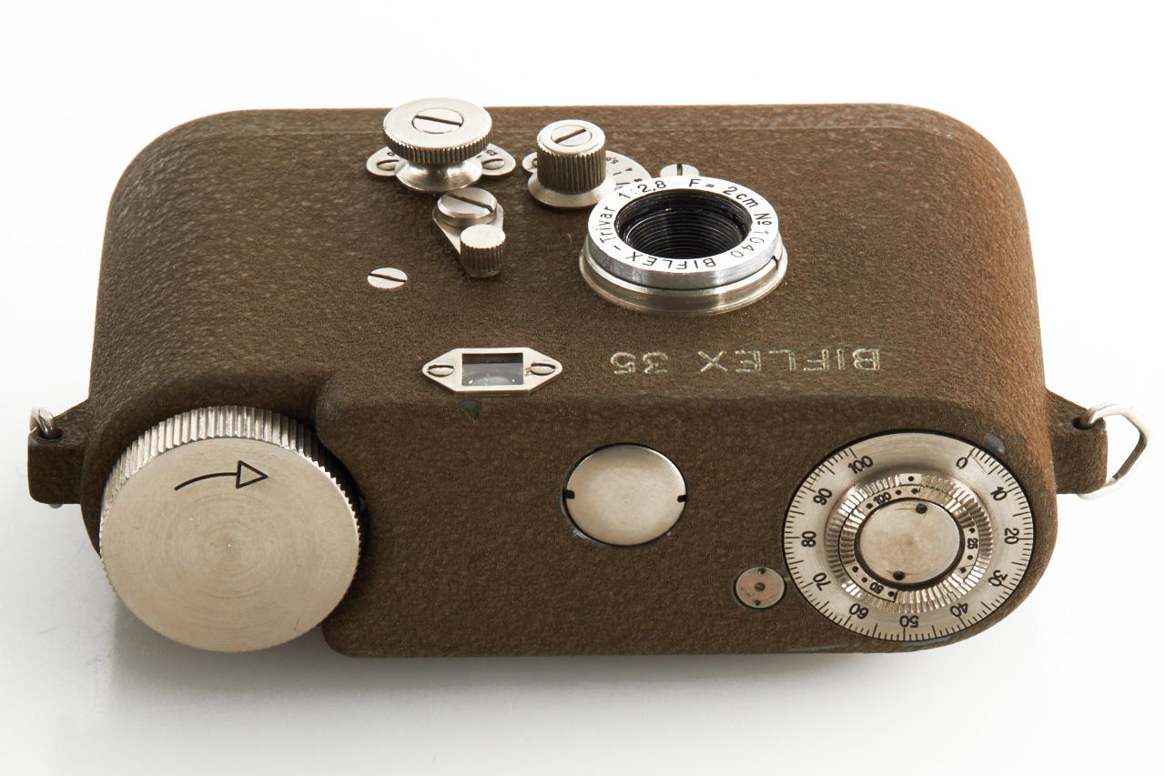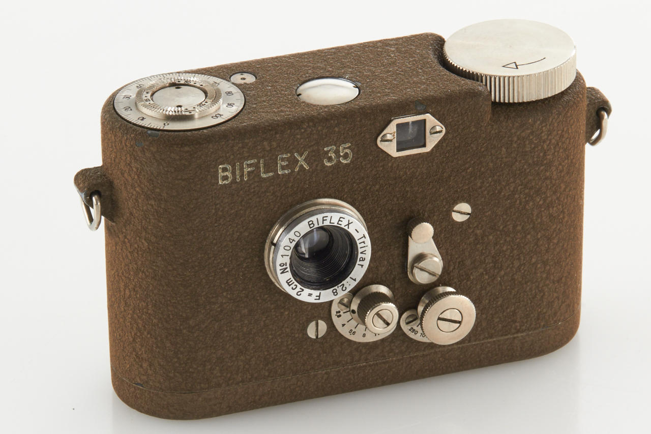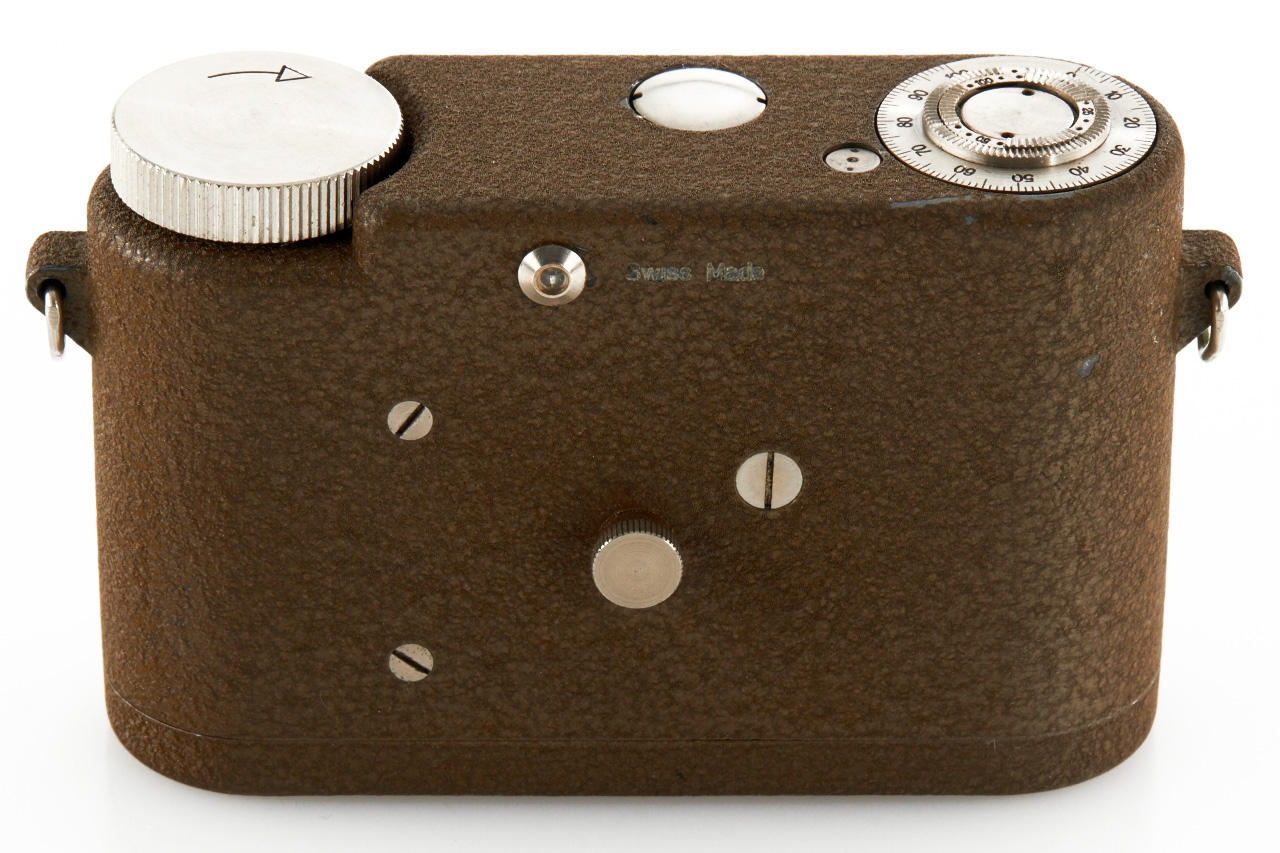very rare and unusual Swiss made subminiature camera for 11x11mm exposures on standard 35mm film, matching number 1040 of the camera and lens, Biflex-Trivar 2.8/2cm, in very good condition with everready case and maker's box with stamped matching serial number