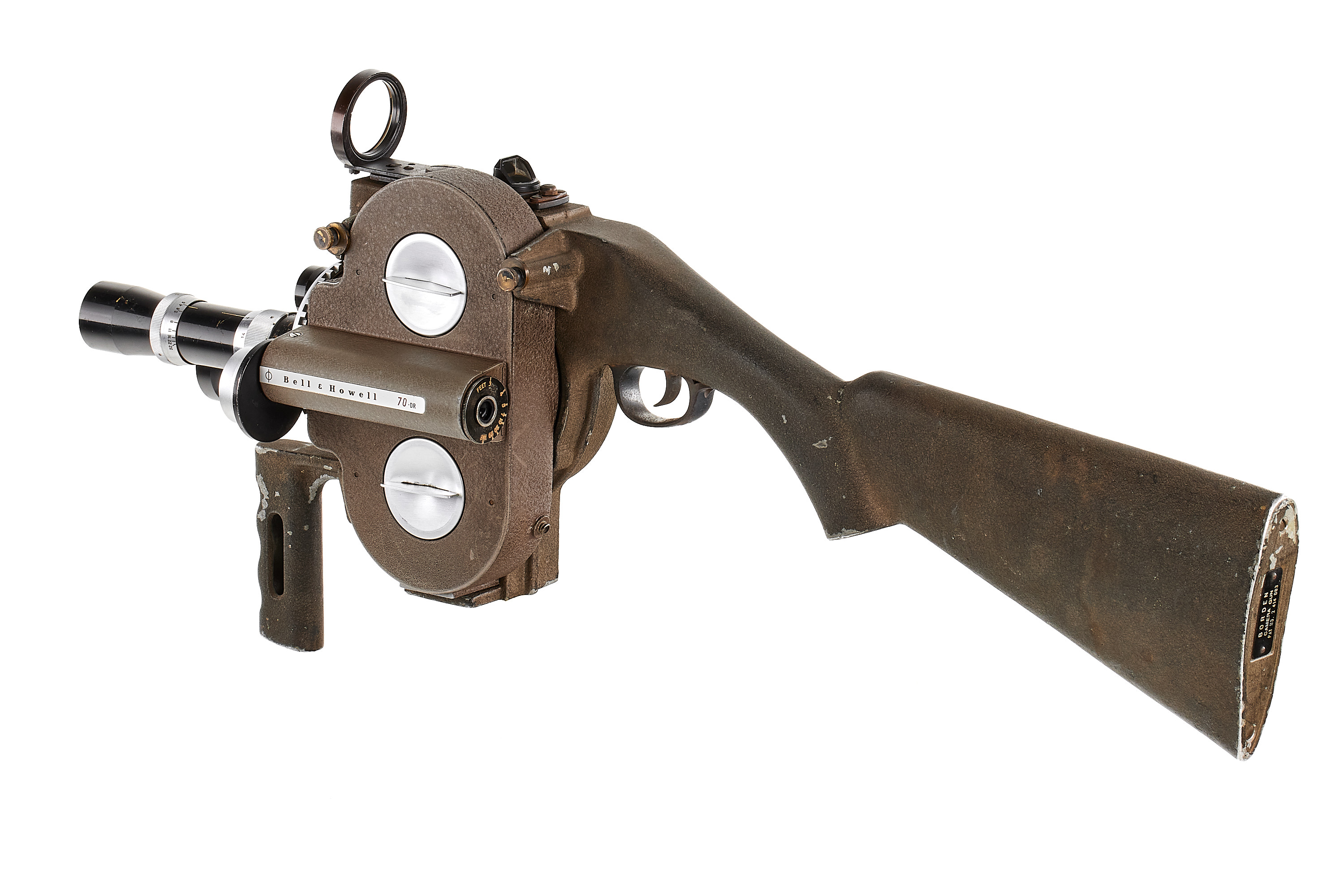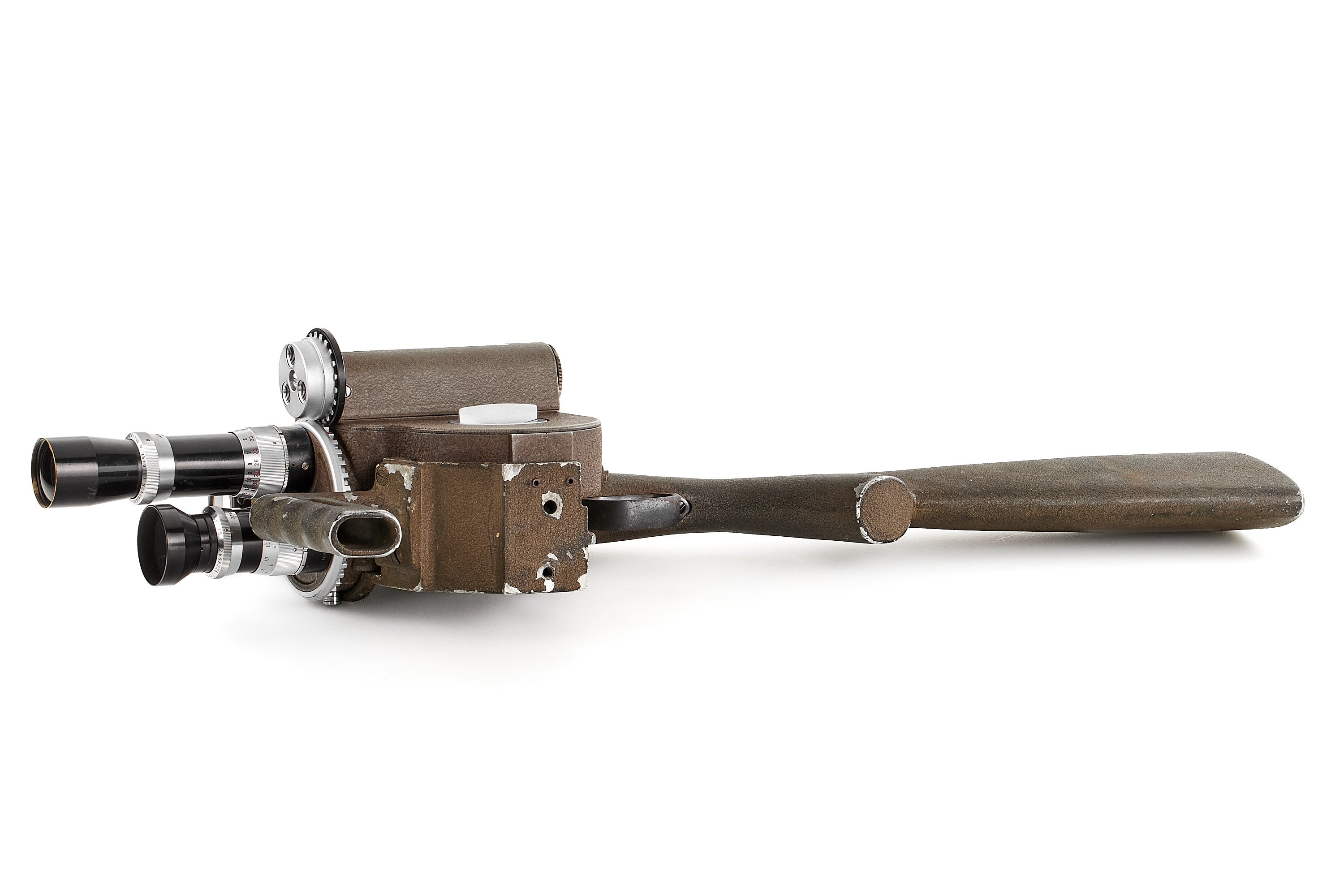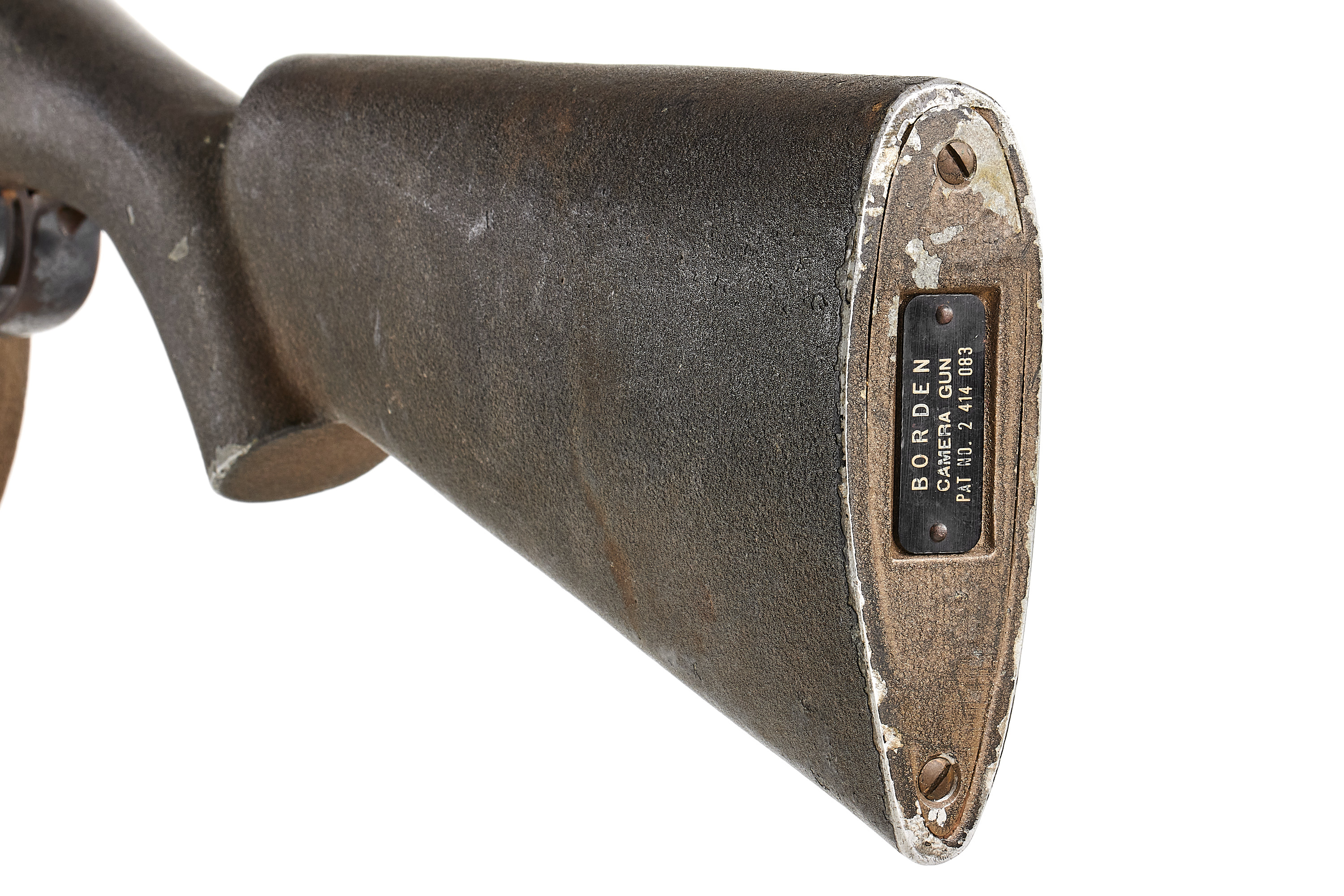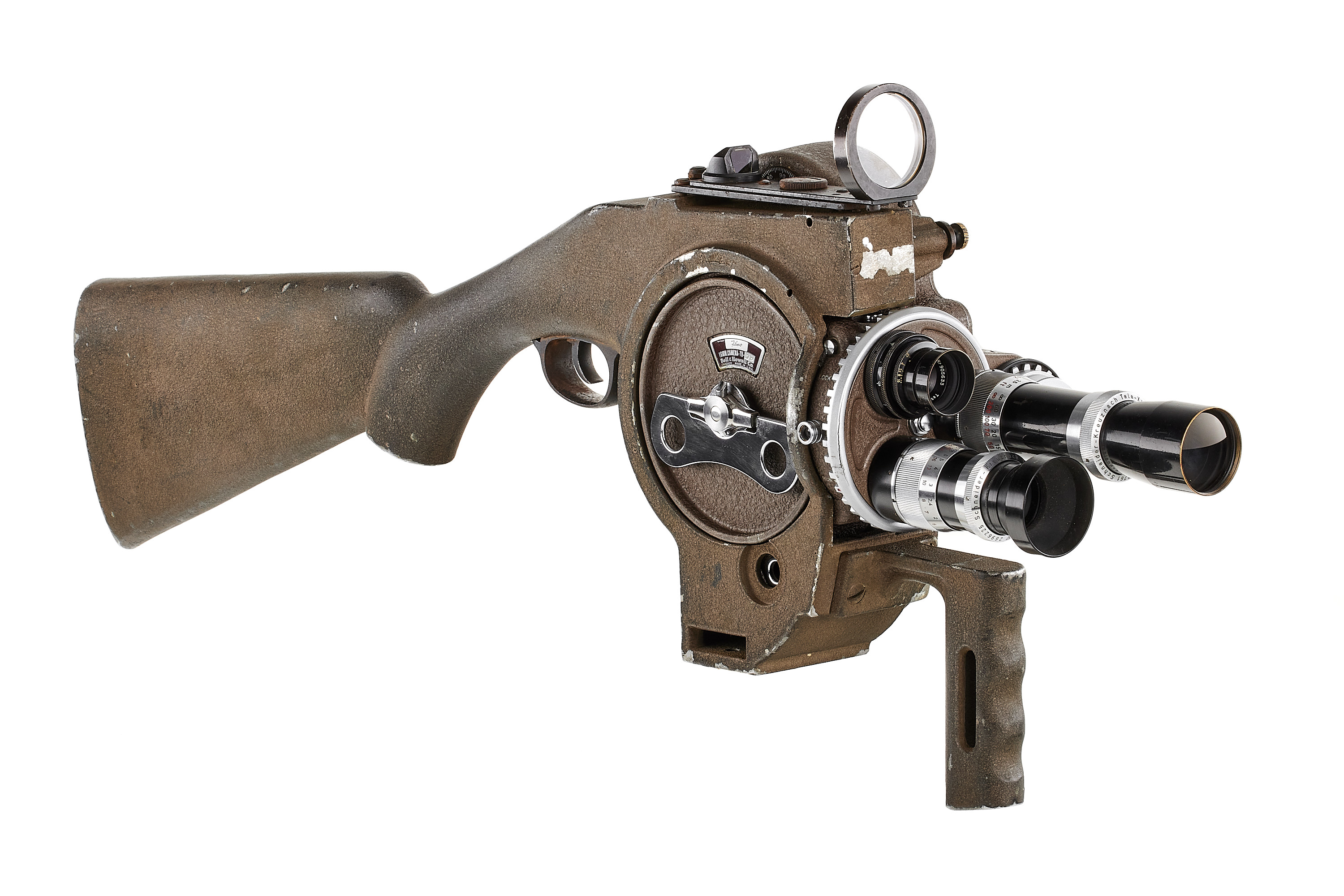 An extremely rare, US-made gun stock to use with Bell & Howell motion picture cameras. In fine, working condition, including a special Nydar sight, and a B&H 70 DR camera equipped with three lenses: Tessar 2.7/2.5cm no.905633, Tele-Xenar 3.8/75mm no.2696225 and Tele-Xenar 4.5/150mm no.2510761, as well as a copy of an advertisement from the late 1940s. This is the only example of the Borden Camera Gun we have seen!