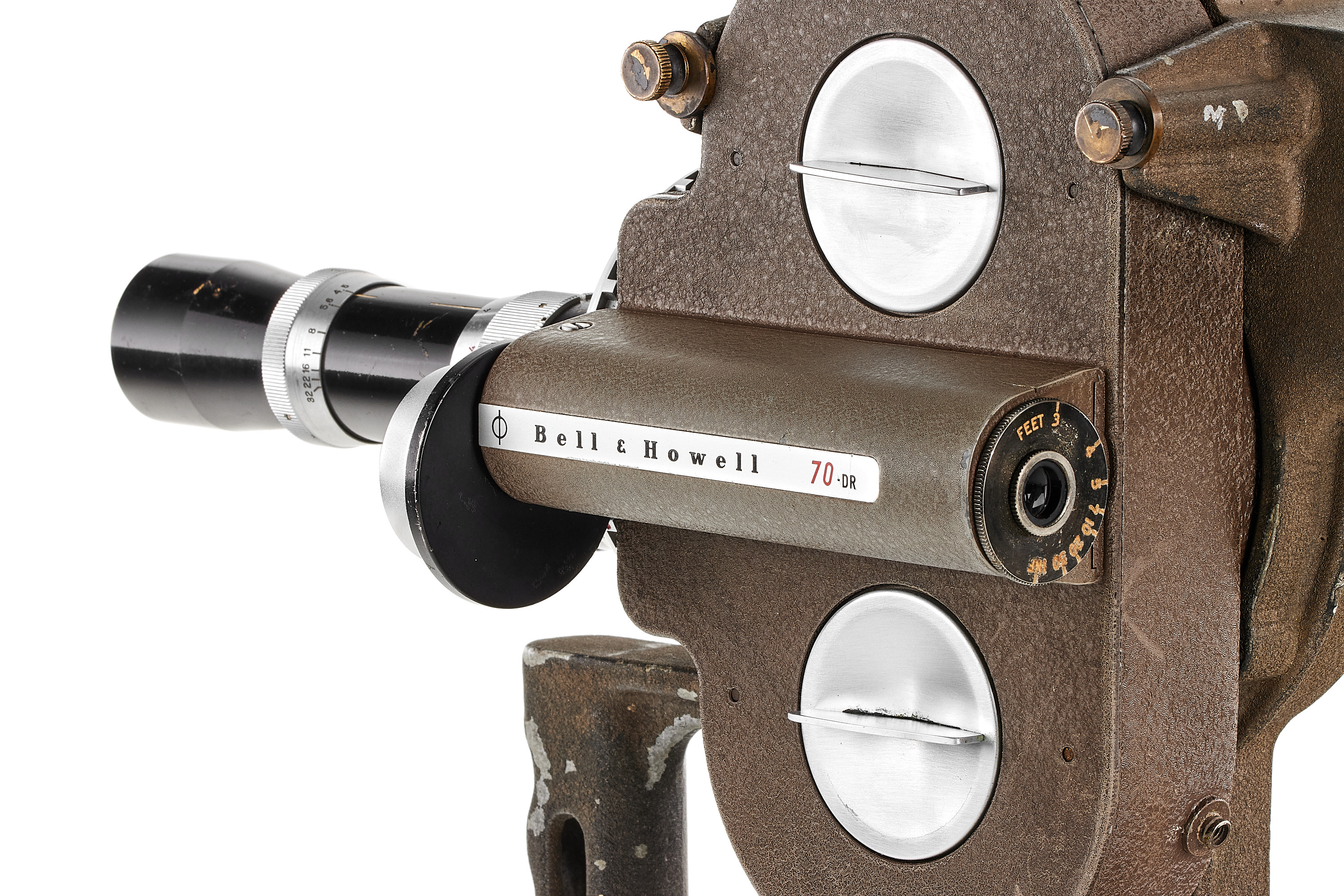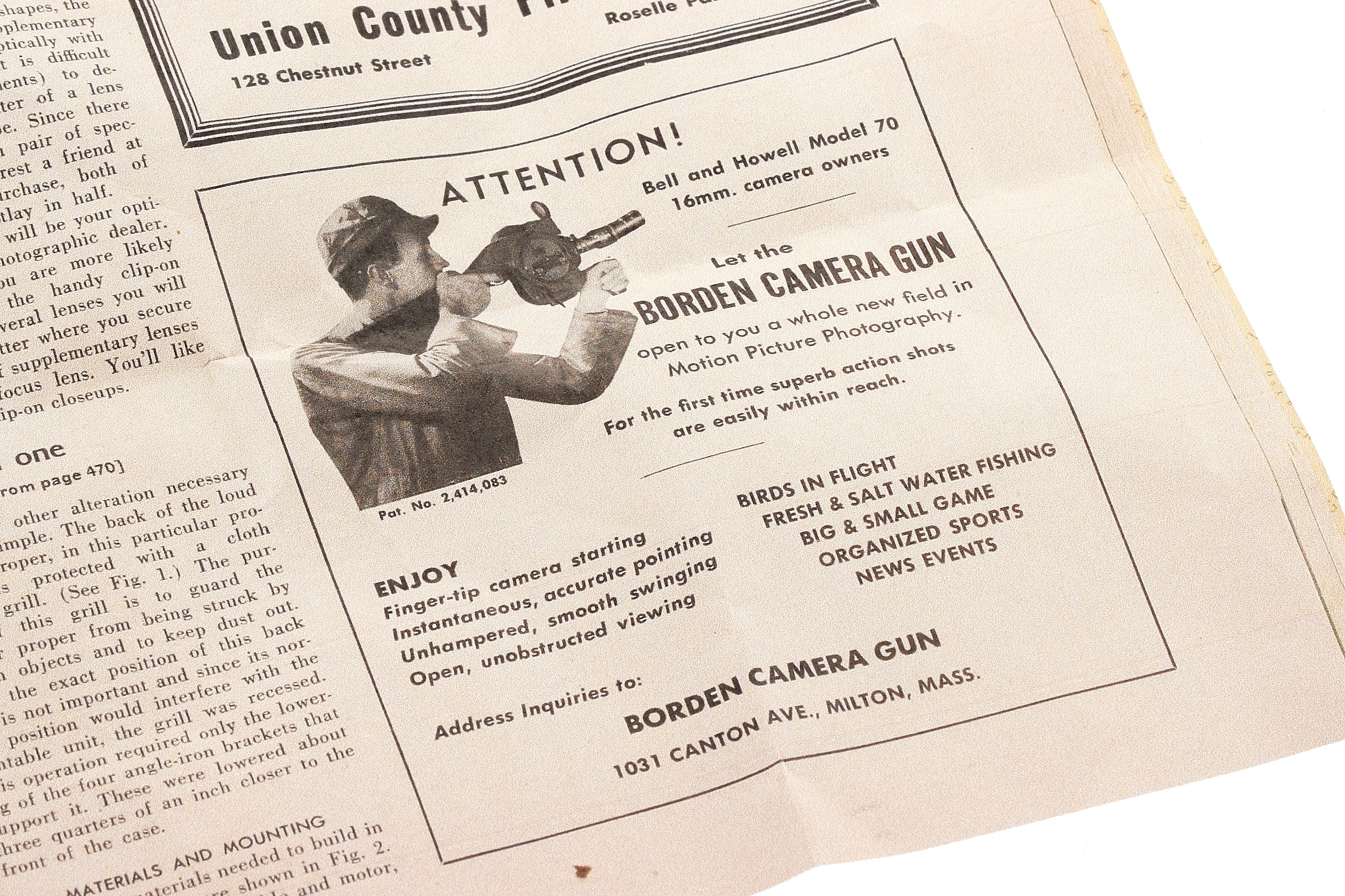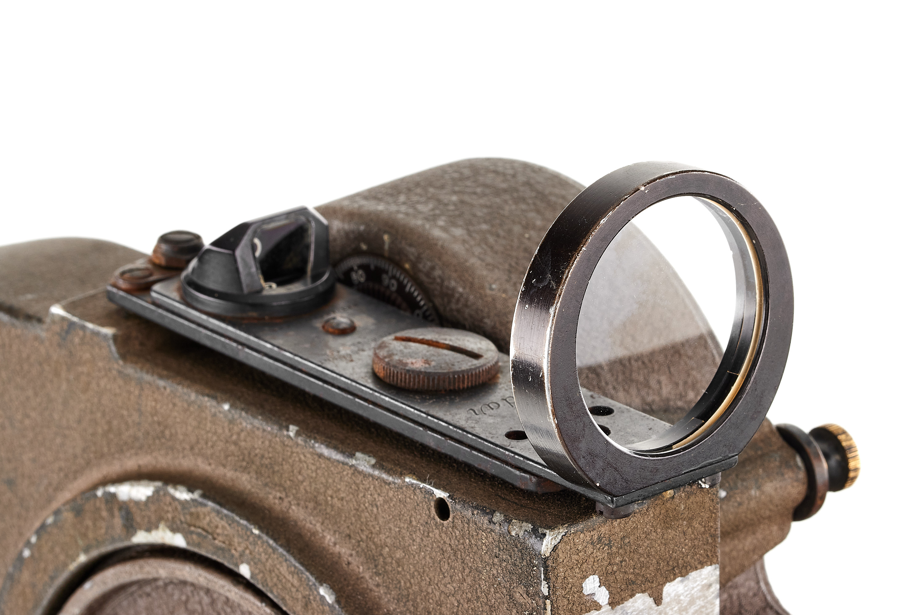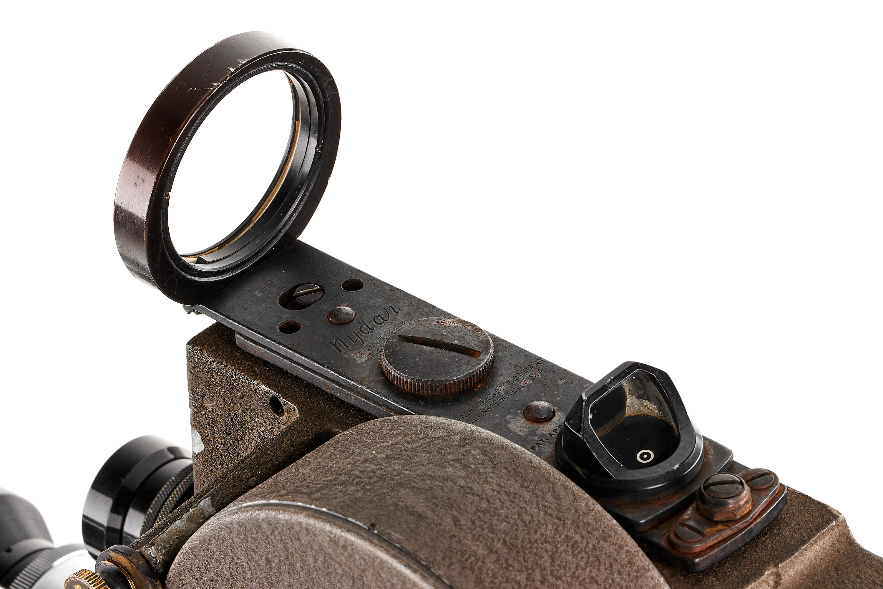 An extremely rare, US-made gun stock to use with Bell & Howell motion picture cameras. In fine, working condition, including a special Nydar sight, and a B&H 70 DR camera equipped with three lenses: Tessar 2.7/2.5cm no.905633, Tele-Xenar 3.8/75mm no.2696225 and Tele-Xenar 4.5/150mm no.2510761, as well as a copy of an advertisement from the late 1940s. This is the only example of the Borden Camera Gun we have seen!