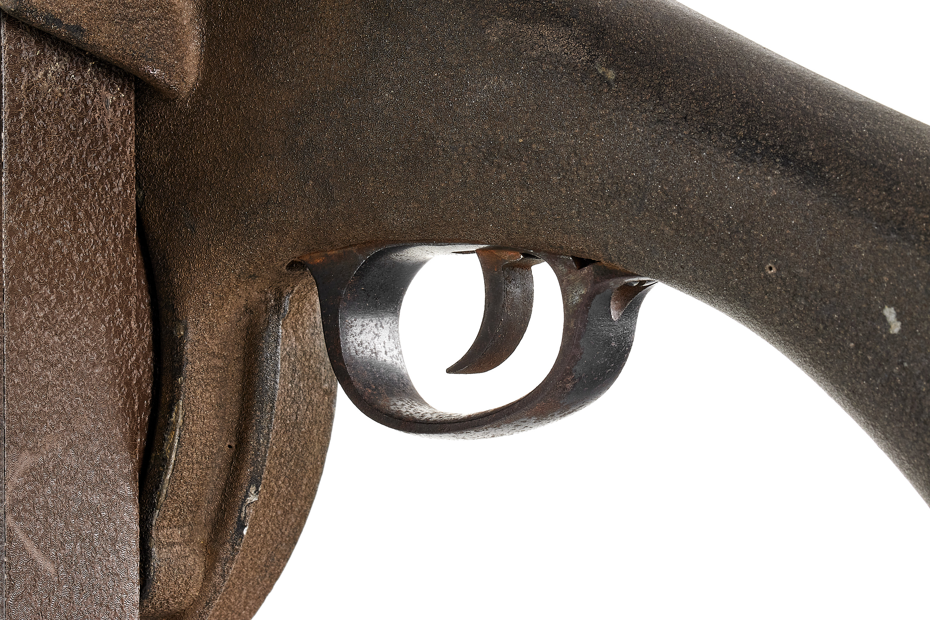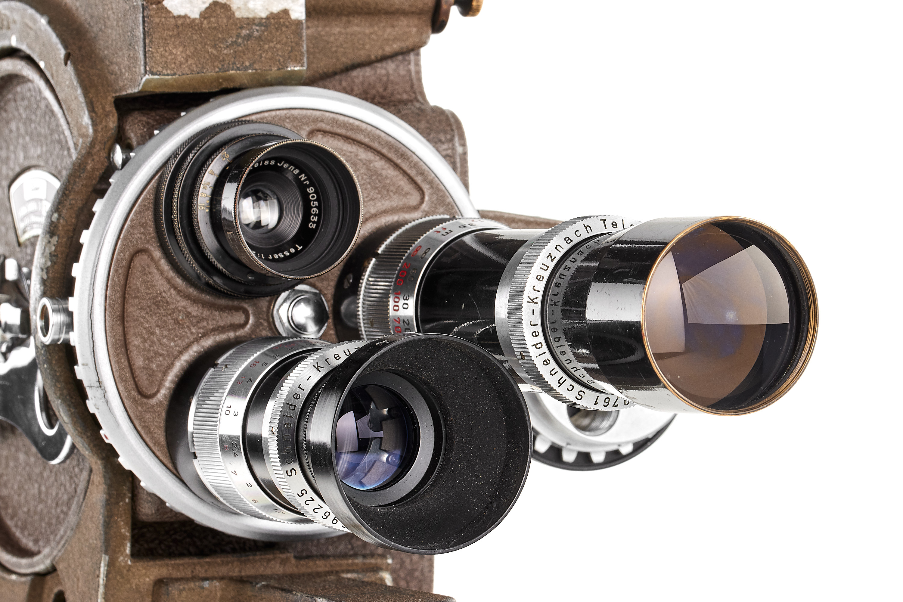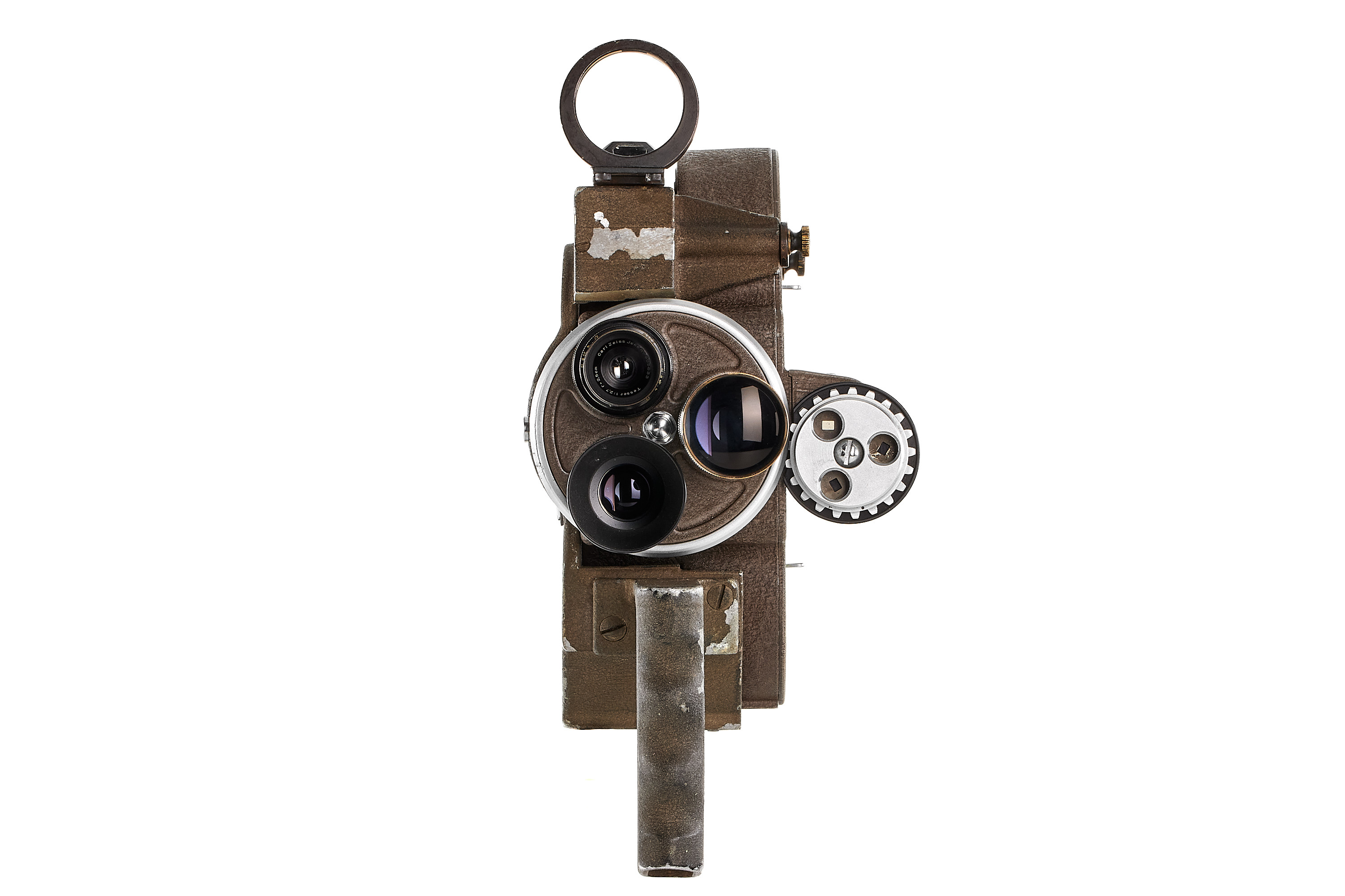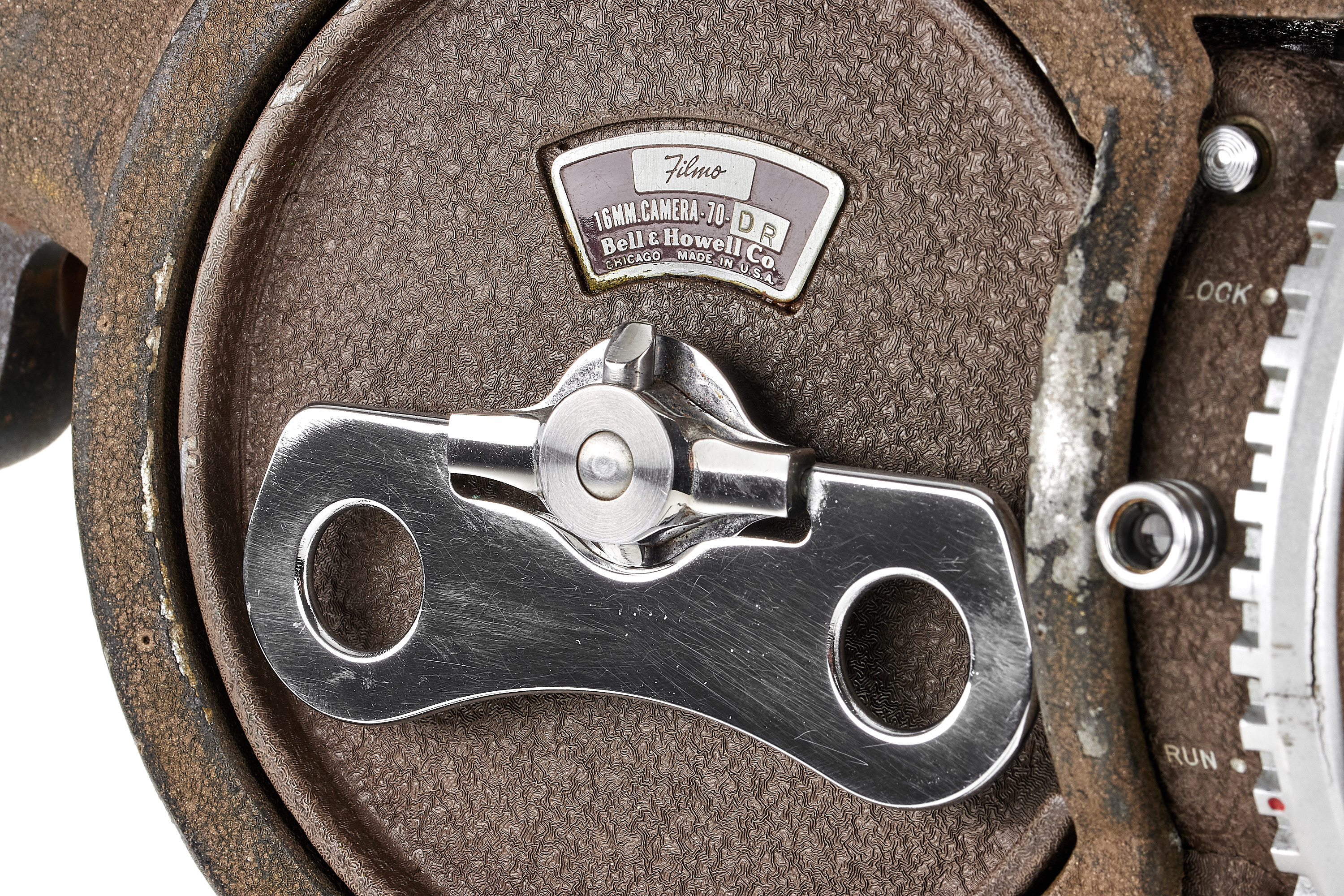 An extremely rare, US-made gun stock to use with Bell & Howell motion picture cameras. In fine, working condition, including a special Nydar sight, and a B&H 70 DR camera equipped with three lenses: Tessar 2.7/2.5cm no.905633, Tele-Xenar 3.8/75mm no.2696225 and Tele-Xenar 4.5/150mm no.2510761, as well as a copy of an advertisement from the late 1940s. This is the only example of the Borden Camera Gun we have seen!