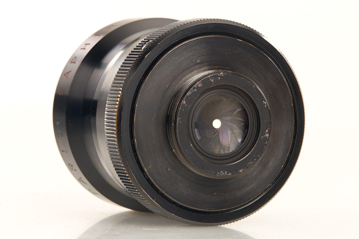 very rare, ultra fast Saphir lens with built-in iris diaphragm to f/8, clean lenses, 30mm rear screw diameter, in almost new condition with original front cap and maker's box