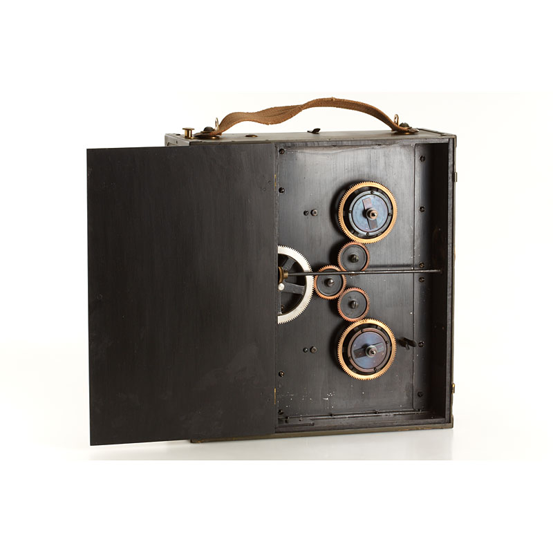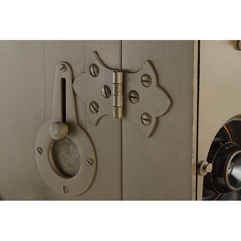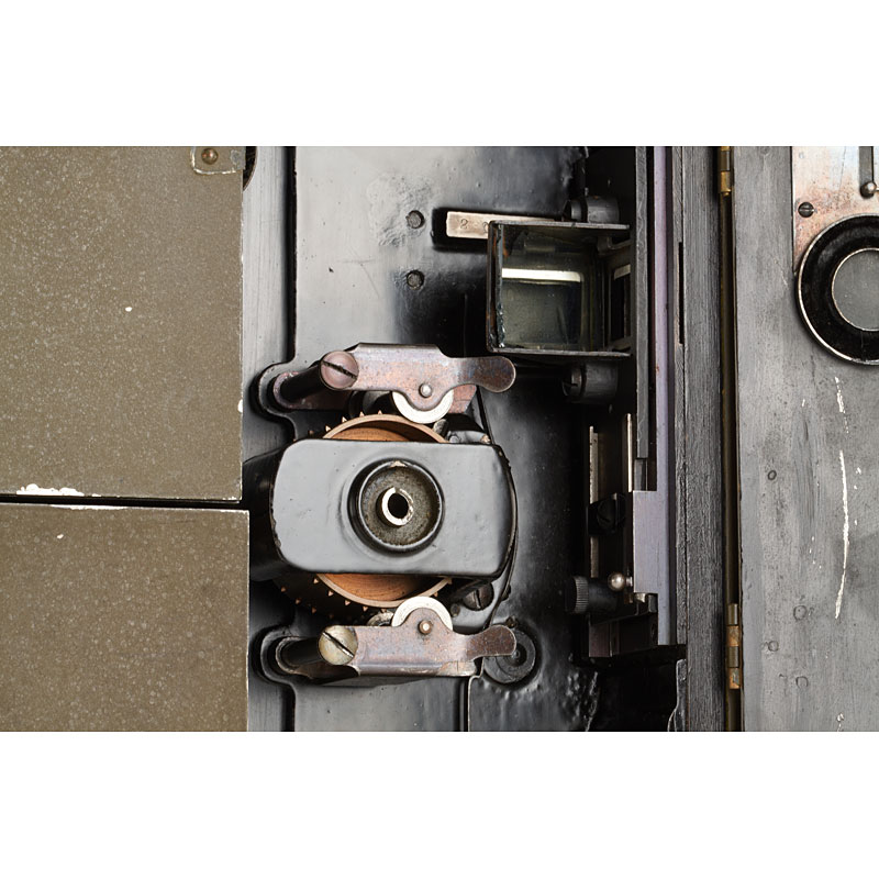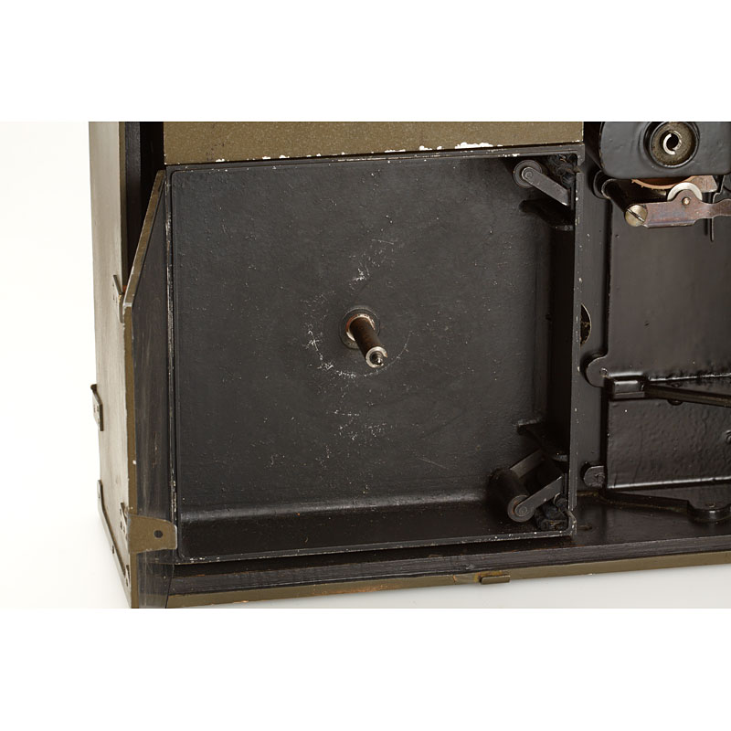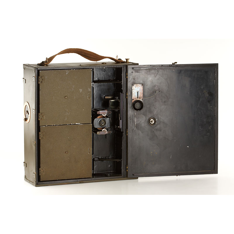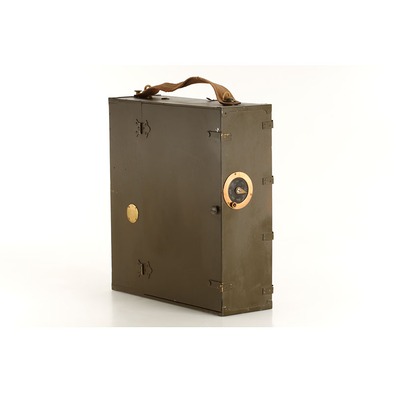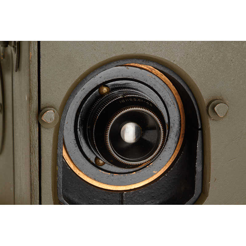 this 35mm metal camera was introduced in 1918 when the United States entered the First World War and is the first army green painted camouflage camera. It is one of only 2 known items, the second camera known is held by the Smithsonian Museum, USA. In very good condition with original crank.