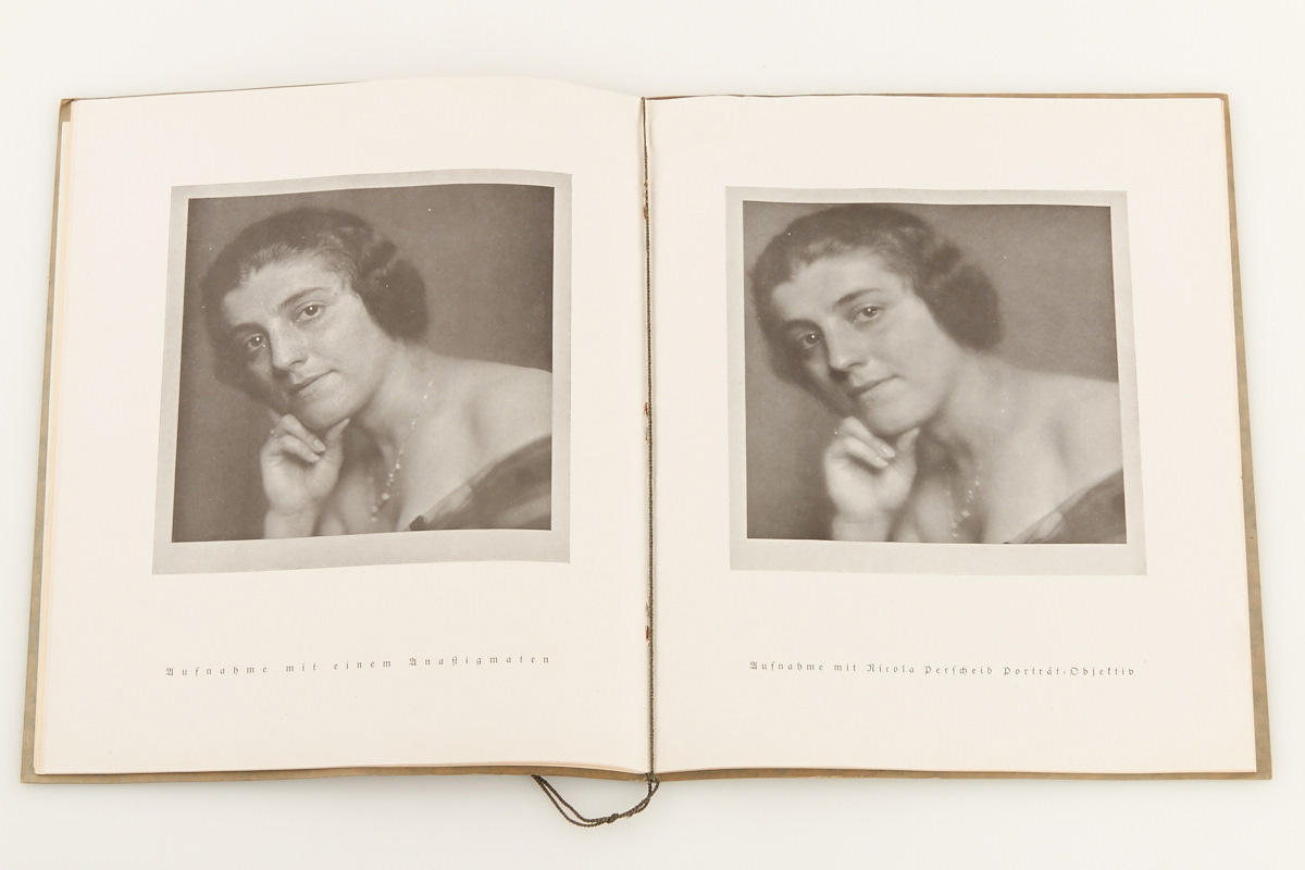 18 pages, 24 x 30.5cm, green cover, printed on high quality paper, first page reads 'Nicola Perscheid-Objektiv D.R.P. a Zur Erzielung malerischer Wirkung in der Porträt Photographie Emil Busch / A.-G. / Optische Industrie / Rathenow', beautifully illustrated, rare and in very good condition