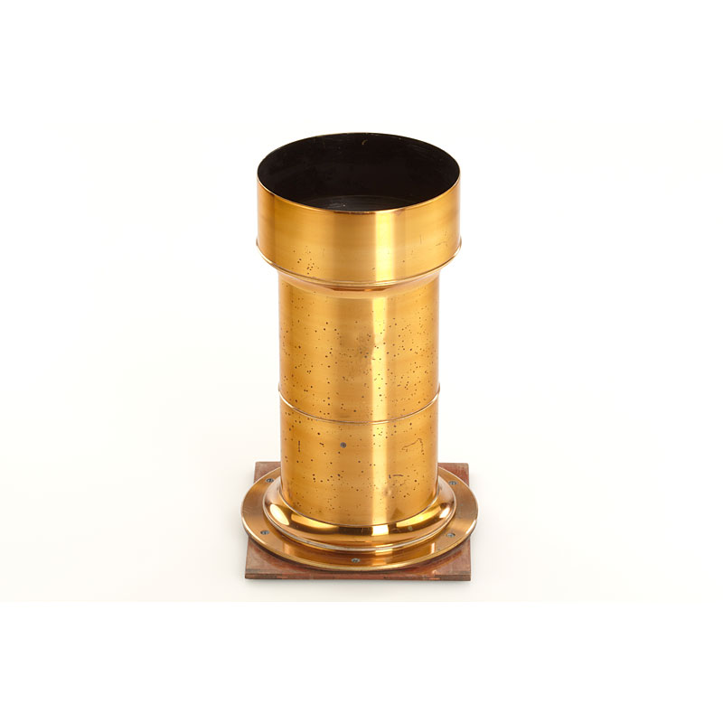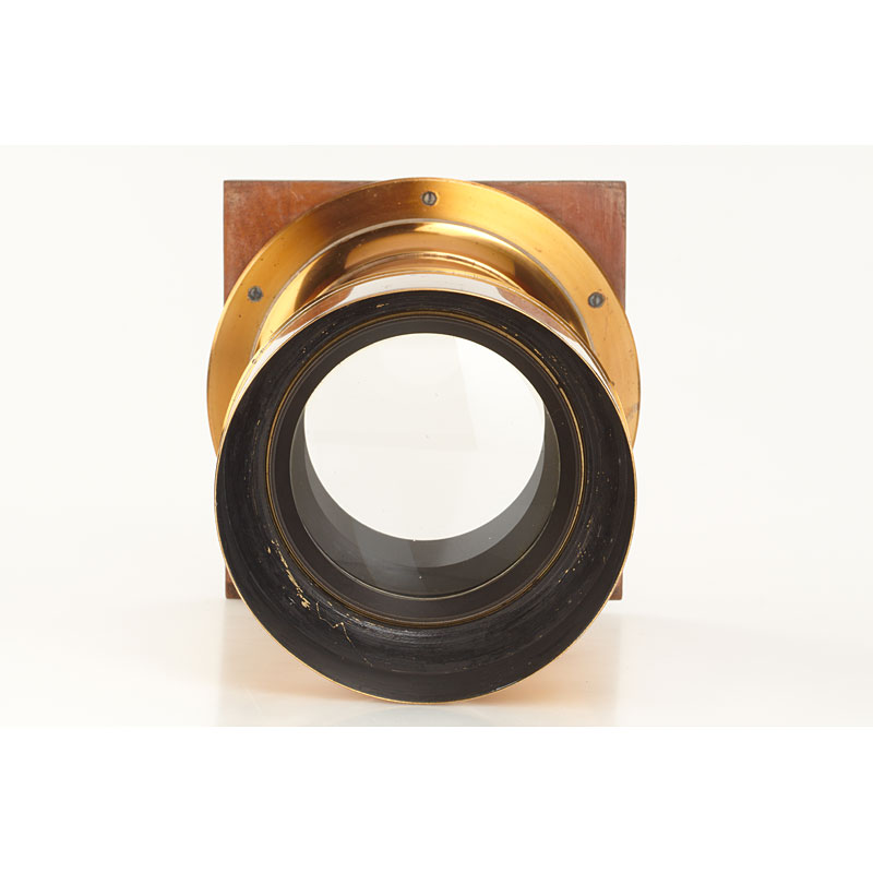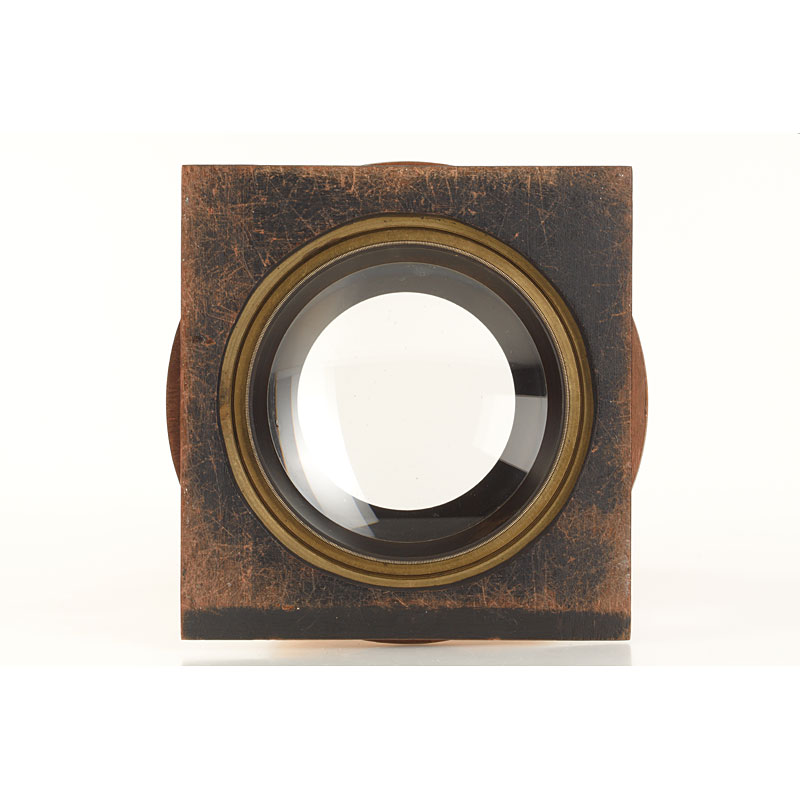 very rare lens, approx. 50cm focal length, c.10.5cm lens diameter, for waterhouse stops, hood, front shutter cap, total height c.30.5cm, with mounting ring on wooden lens board (c.18x18.5cm) - This small company was founded by former Voigtländer employees and made lenses and cameras for a very short period.