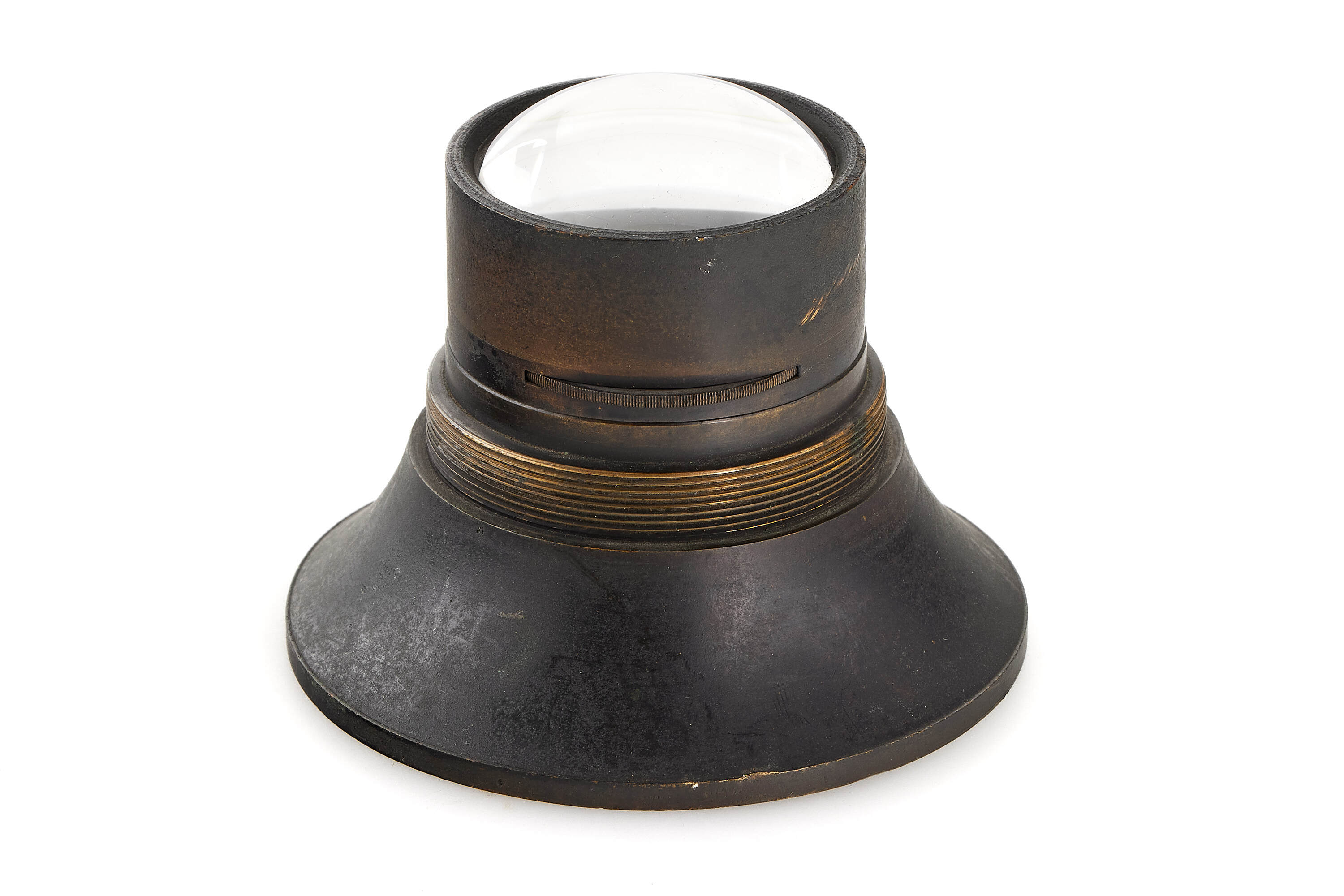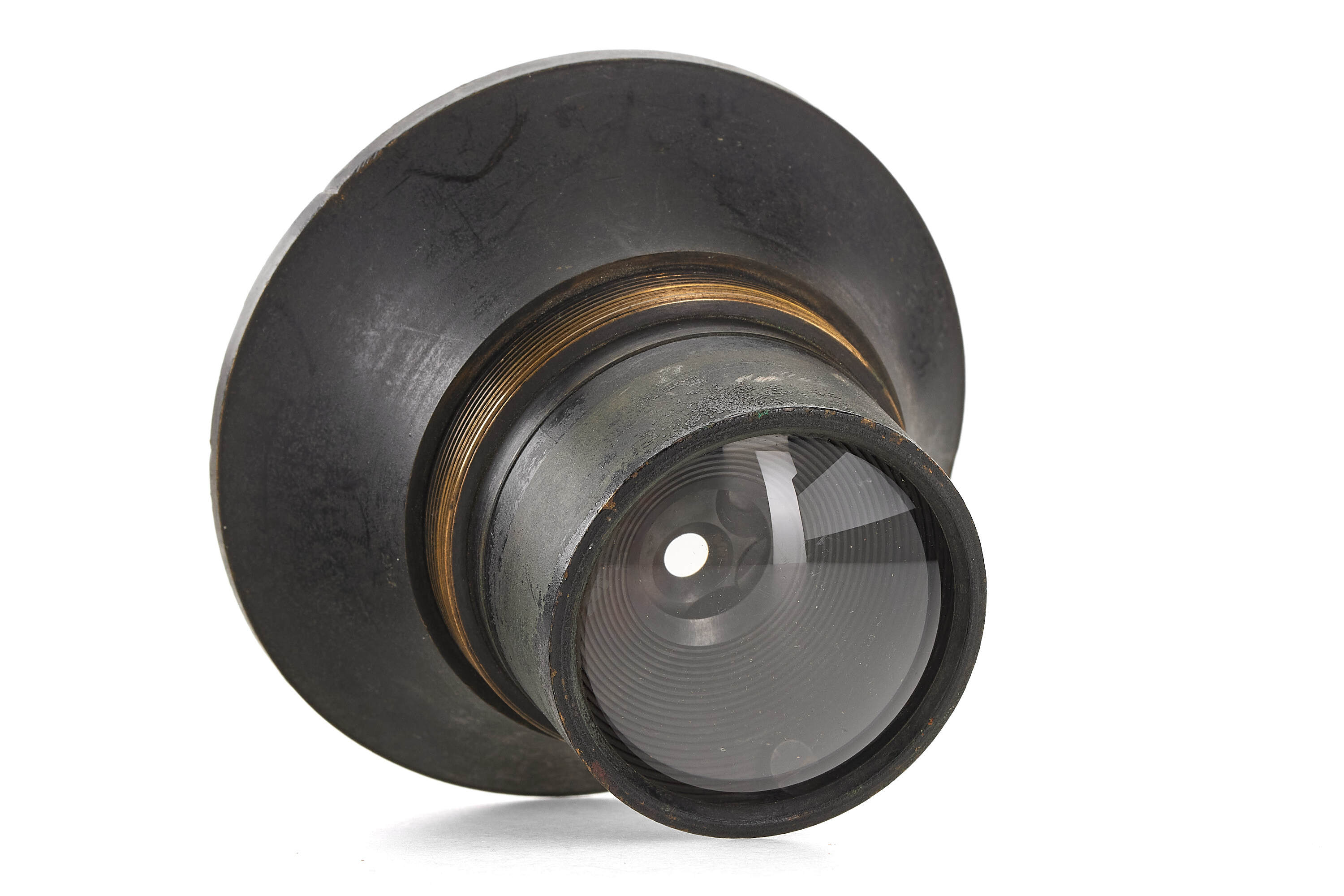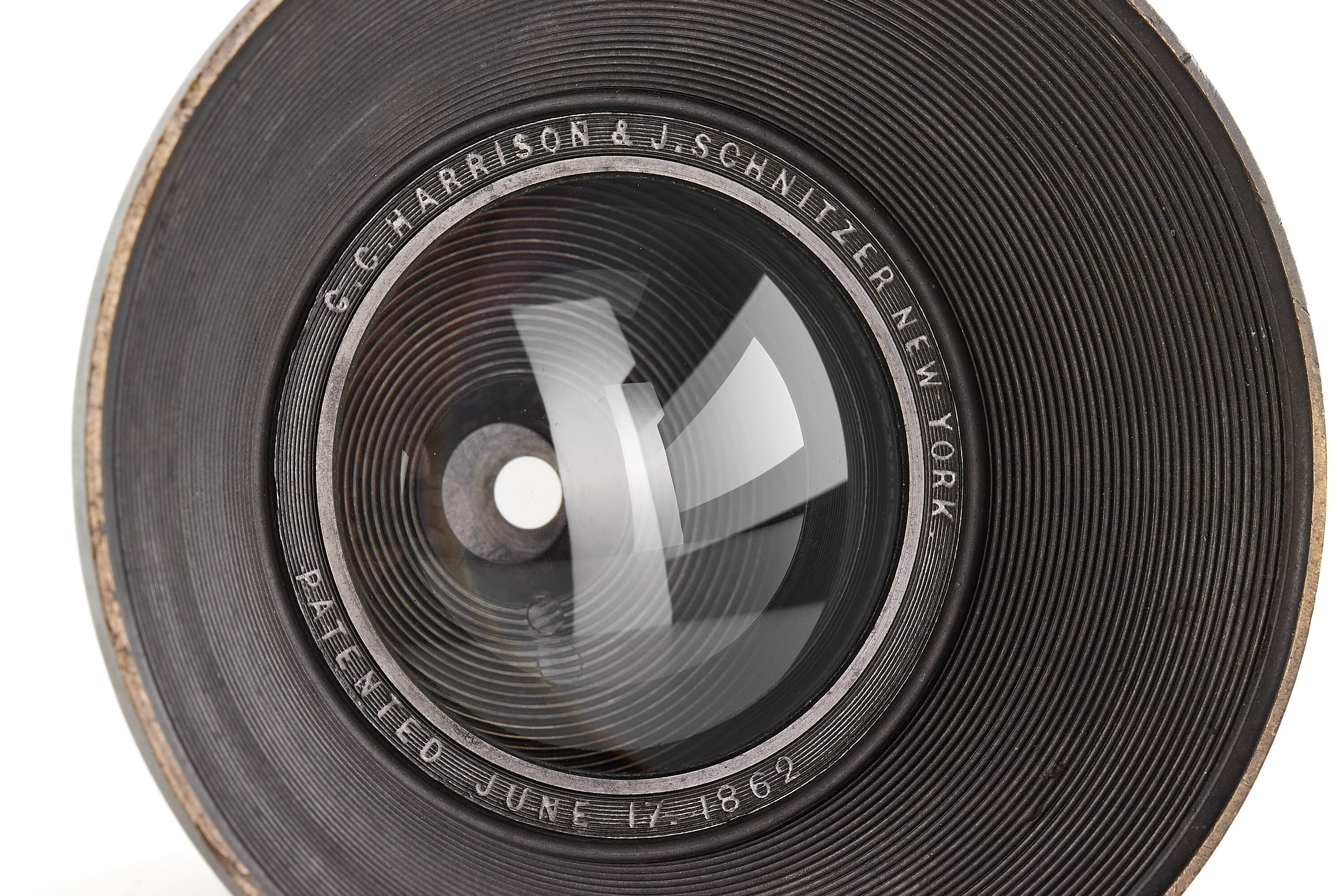 Very rare American Globe lens with stops wheel, approx. 10" focal length, the lens covers 90 degrees. In original, good condition, optics showing some cleaning marks, unlike the earlier Sutton water-filled lens, the Globe Lens focused on a flat field. On June 17, 1862, C. C. Harrison and J. Schnitzer of New York received a patent for the "Globe Lens" (U.S. 35.605) in which two deeply-curved, cemented doublets were arranged about a central stop in such a way that the exterior surfaces formed a sphere. Charles C. Harrison was a daguerreotypist, camera maker, and inventor, he began manufacturing high-quality cameras about 1849 and known to have made daguerreotype apparatus in 1854-1855 at White & Elm Sts.. He died Nov.23, 1864.