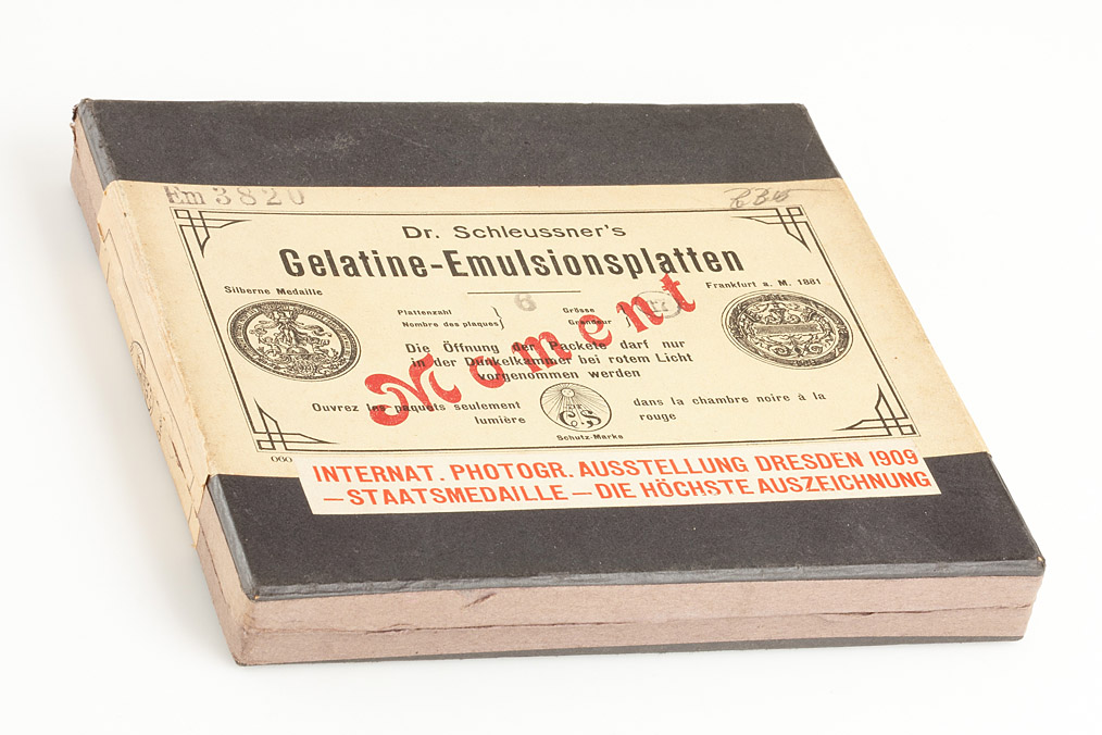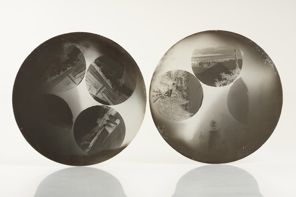 Extremely rare original negatives taken with a Stirn vest camera, eight circular plates (17cm diameter) with private snapshots from the period around 1900 in the original cardboard box. The plates and the original box are in very good original condition. This kind of negatives are hardly ever sold separately!