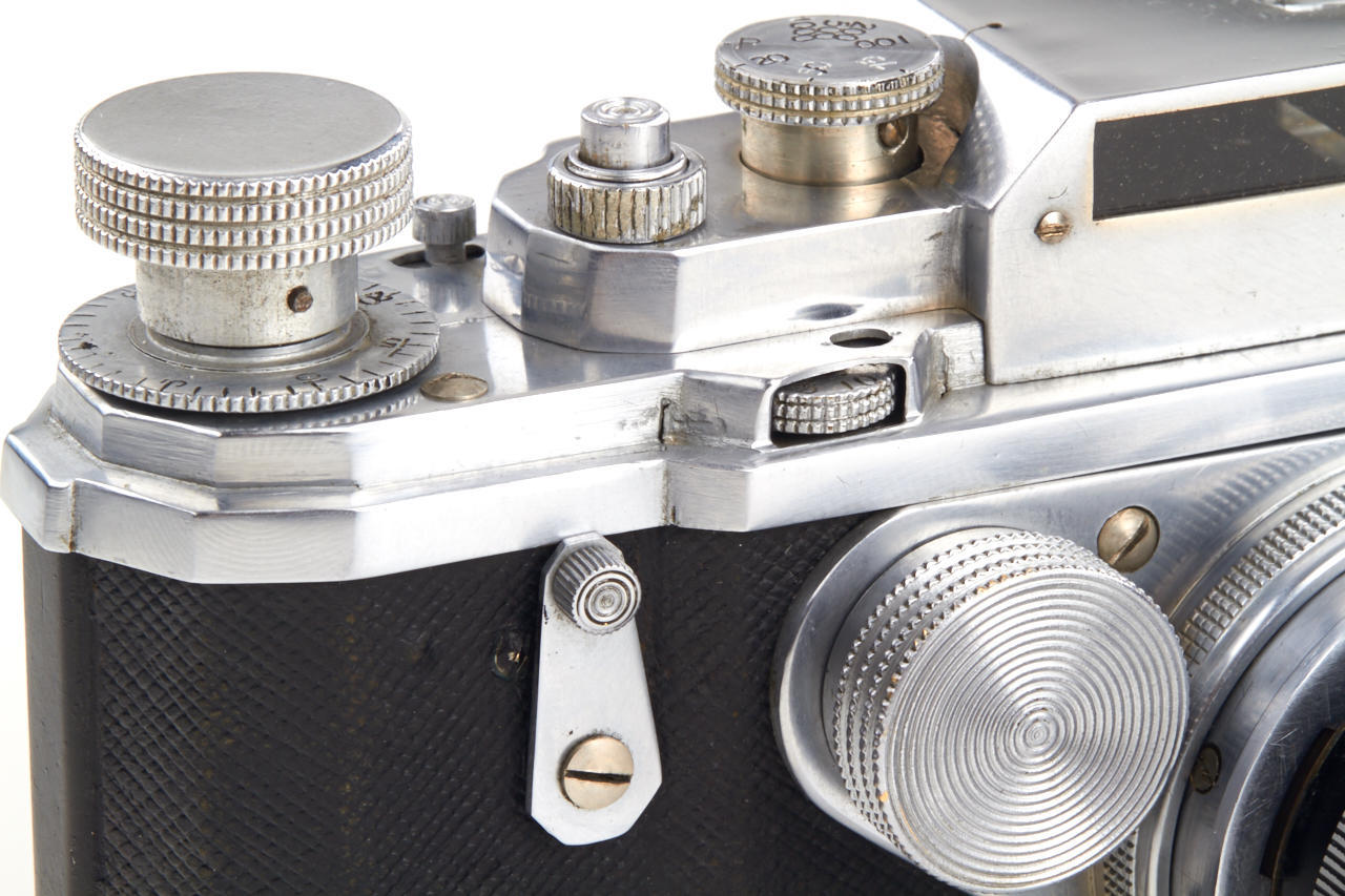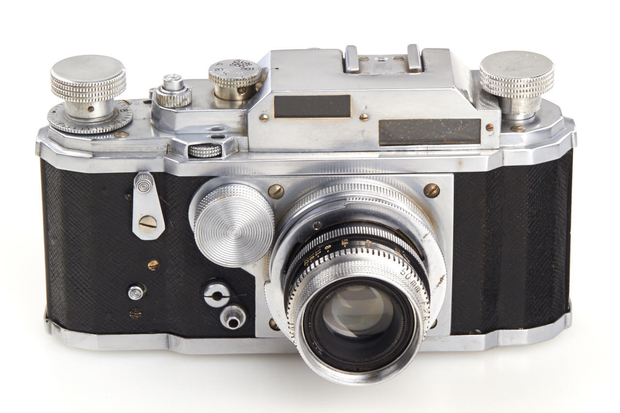 Unknown prototype of a 35mm RF camera 24x36mm with interchangeable lens, focal plane shutter (P, 1 - 1/1000) and selftimer. Uncommon rangefinder- the 1:1 viewfinder image is horizontally divided in two halves of which the lower moves laterally if the lens is focused by turning the substantial knob adjacent to it. The lens, a 2.8/50mm Wollensak Perfex Velostigmat without serial number, is interchangeable in a three claw breech lock bayonet mount of unknown design, it focusses to 3 feet. Longer shutter speeds (1/20 to 1) are set with a small dial above the focusing knob. Below it there are the sync contacts. The back can be removed in Contax style and is arrested with a sliding knob, for use on a tripod it has a 3/8” thread. The camera is the prototype of a advanced professional „Perfex“ camera made by Candid Camera/Chicago, IL, around 1940, which never went in production. The recently discovered camera is in very good and working condition. No other example is known to us.