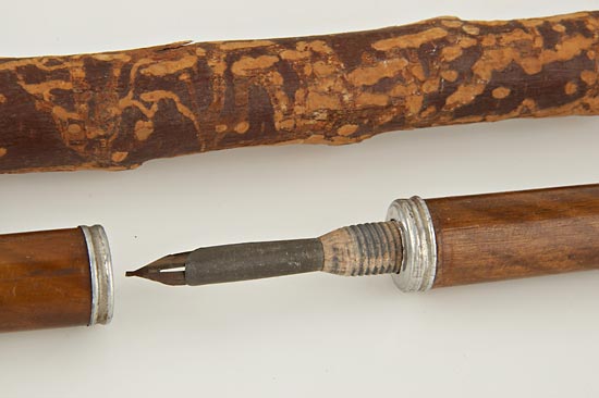 The turned wood cane which unscrews in three sections, one part contains a pen, one part contains a small glass ink well with stopper and the top contains a stanhope of a mosque entitled "Vue Generale du Caire". Ex Spira Collection.