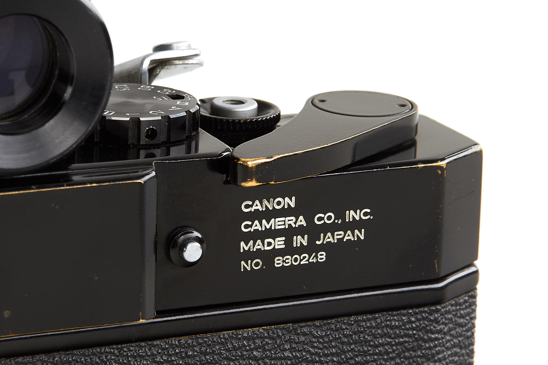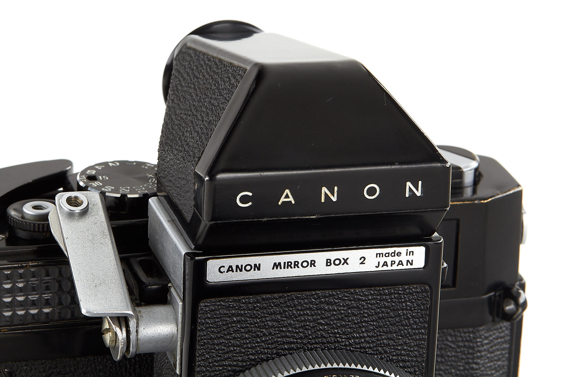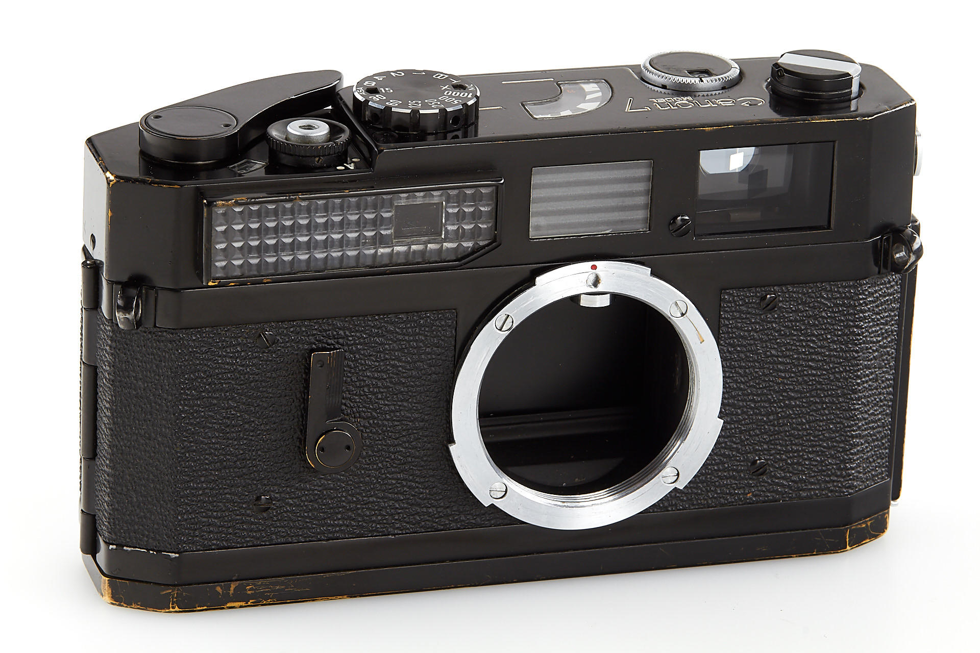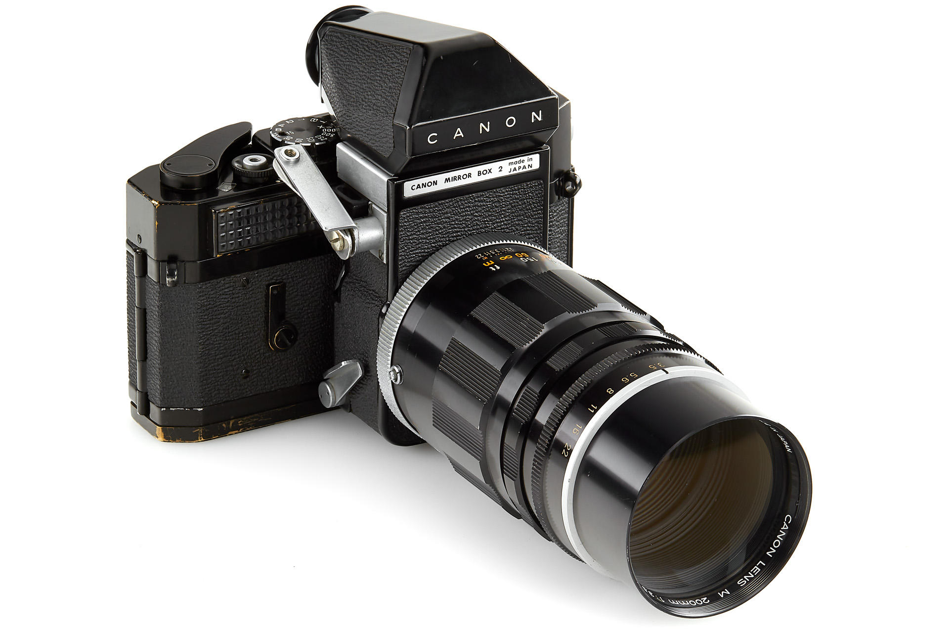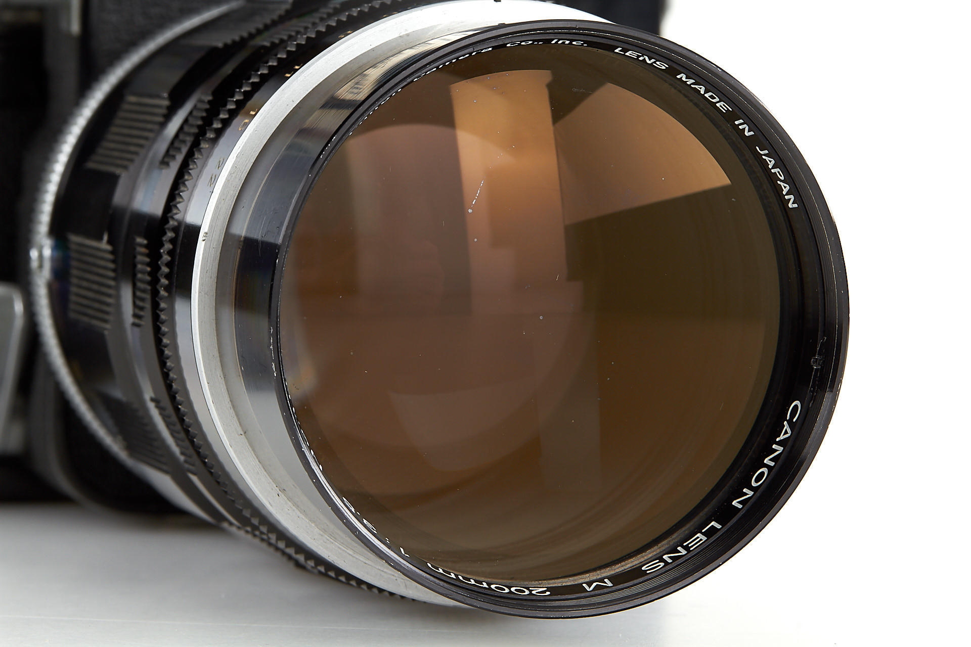 an original black paint Canon 7 in very fine condition and good working order, with rare Canon Mirror Box 2 (with a short arm to use with double cable release), and Canon M 3.5/200mm no.10286 (good optics with only minimal cleaning marks, original front cap)