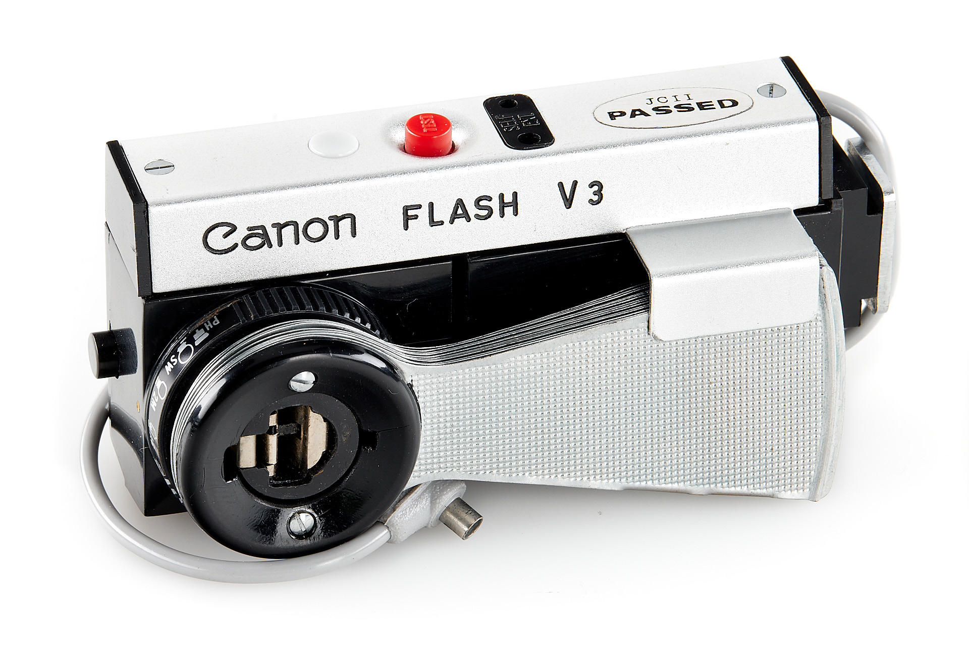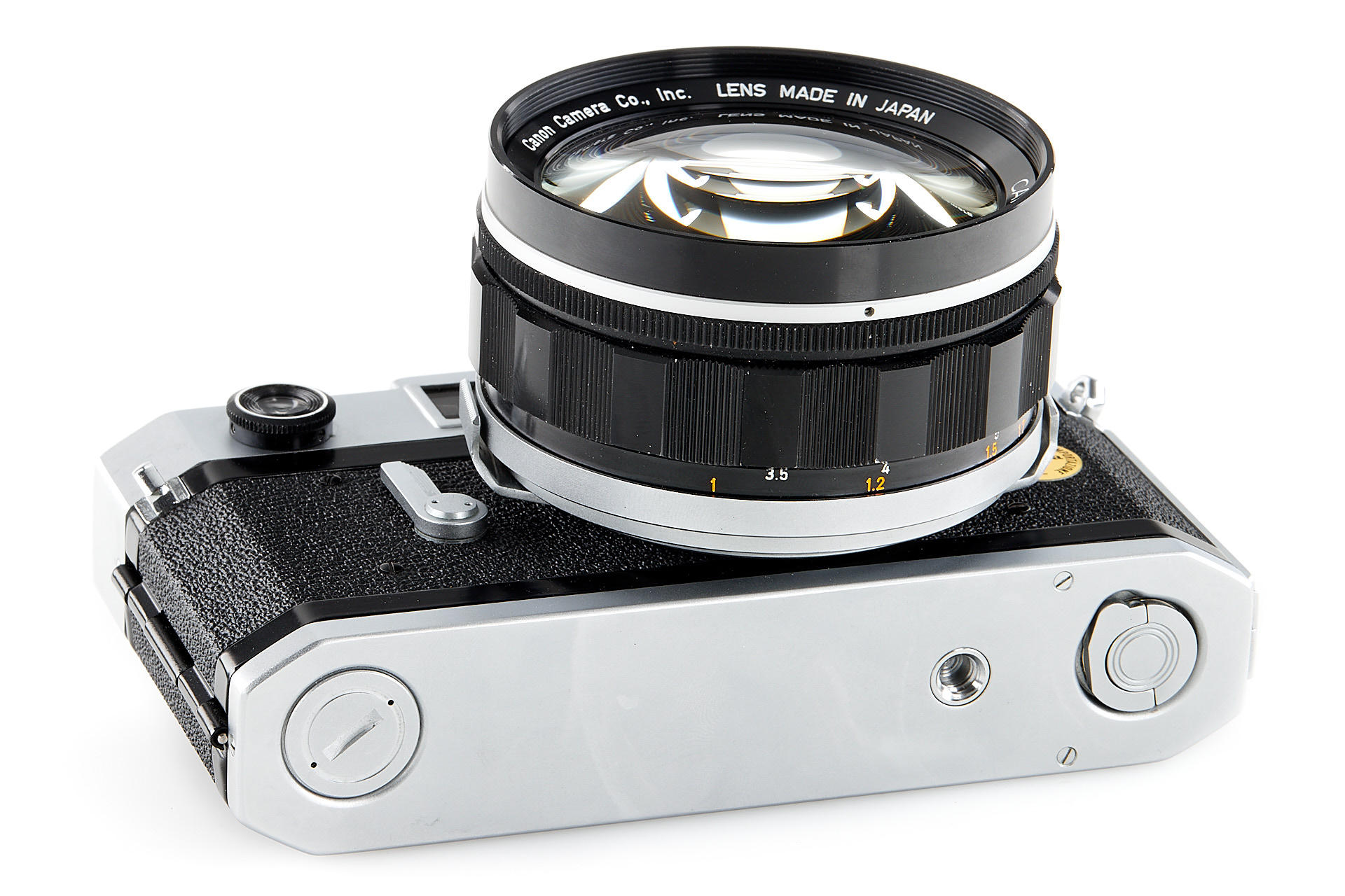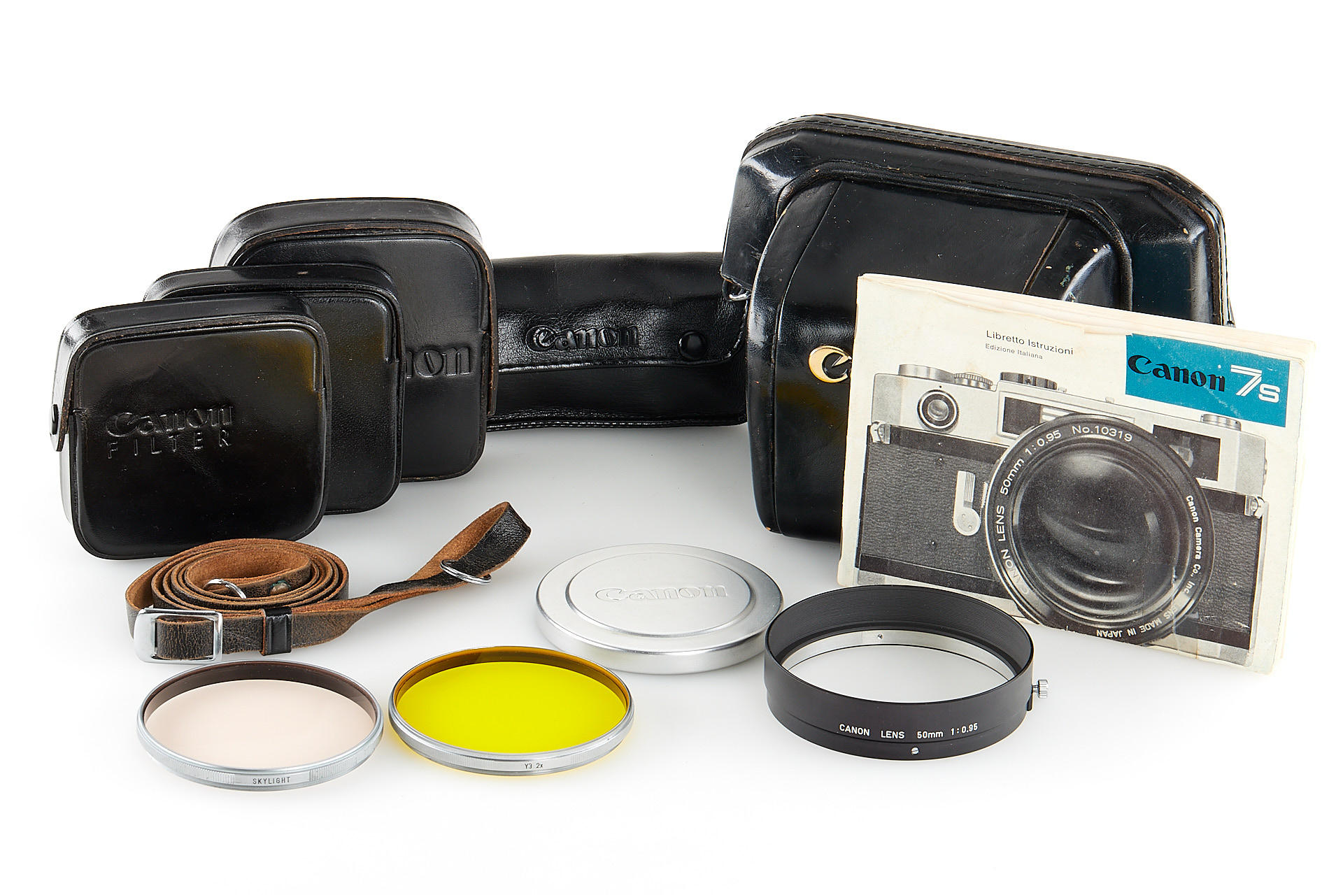 body in near-mint cosmetic condition, with ultra-fast Canon 0.95/50mm no.14014 (very good optics), front cap, original short hood, case, strap, Italian instructions, Canon Flash V3, yellow and skylight filters