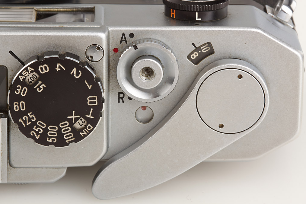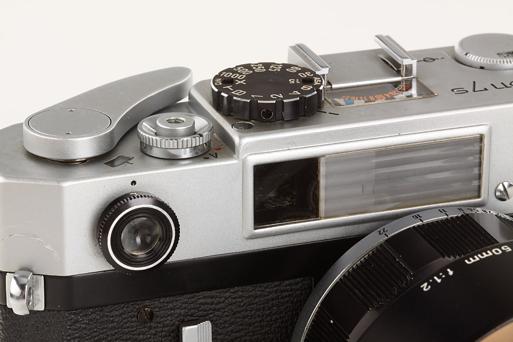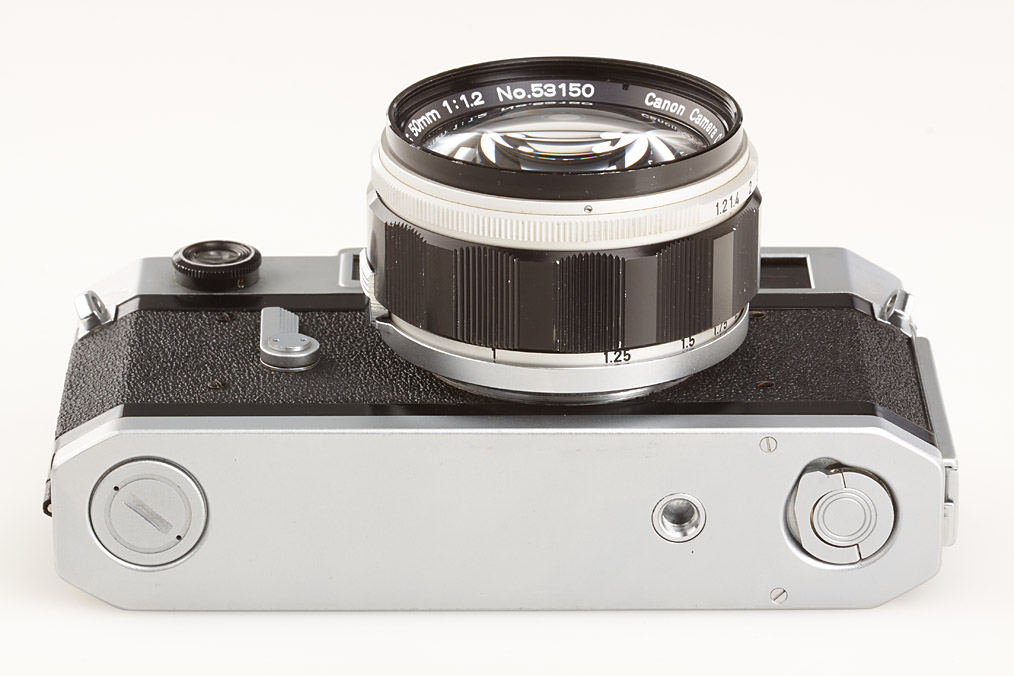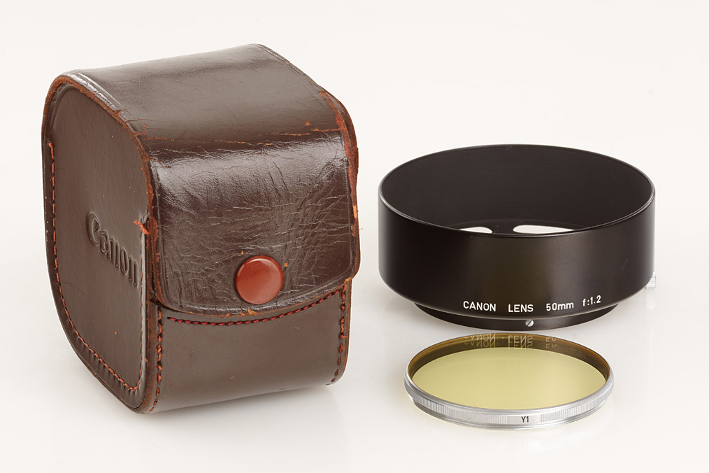 in fine condition with fast Canon Lens 1.2/50mm no.53150 (hazy, UV filter, Miranda cap, hood with yellow filter in leather case)