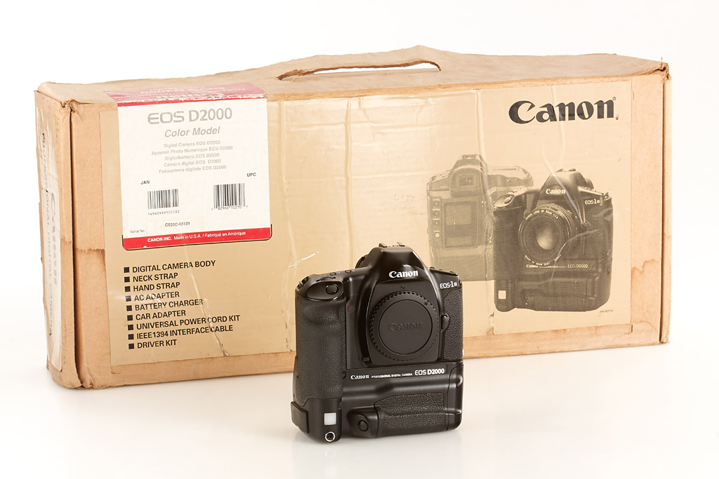 early Canon digital system camera outfit consisting of camera with 2mill. pixels CCD chip, complete with batteries, charger, software, cables and papers in original maker's box - a digital collector's item!