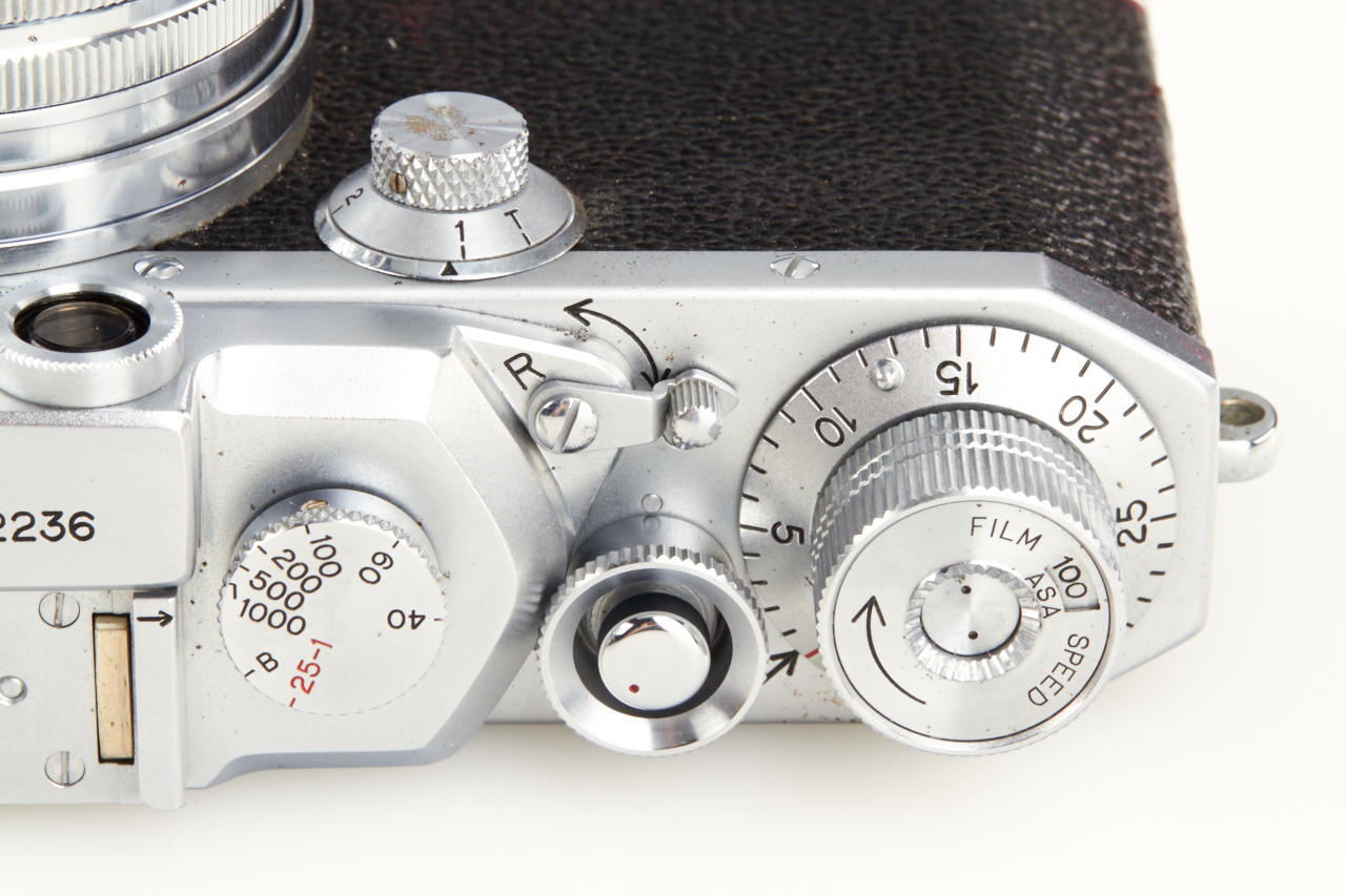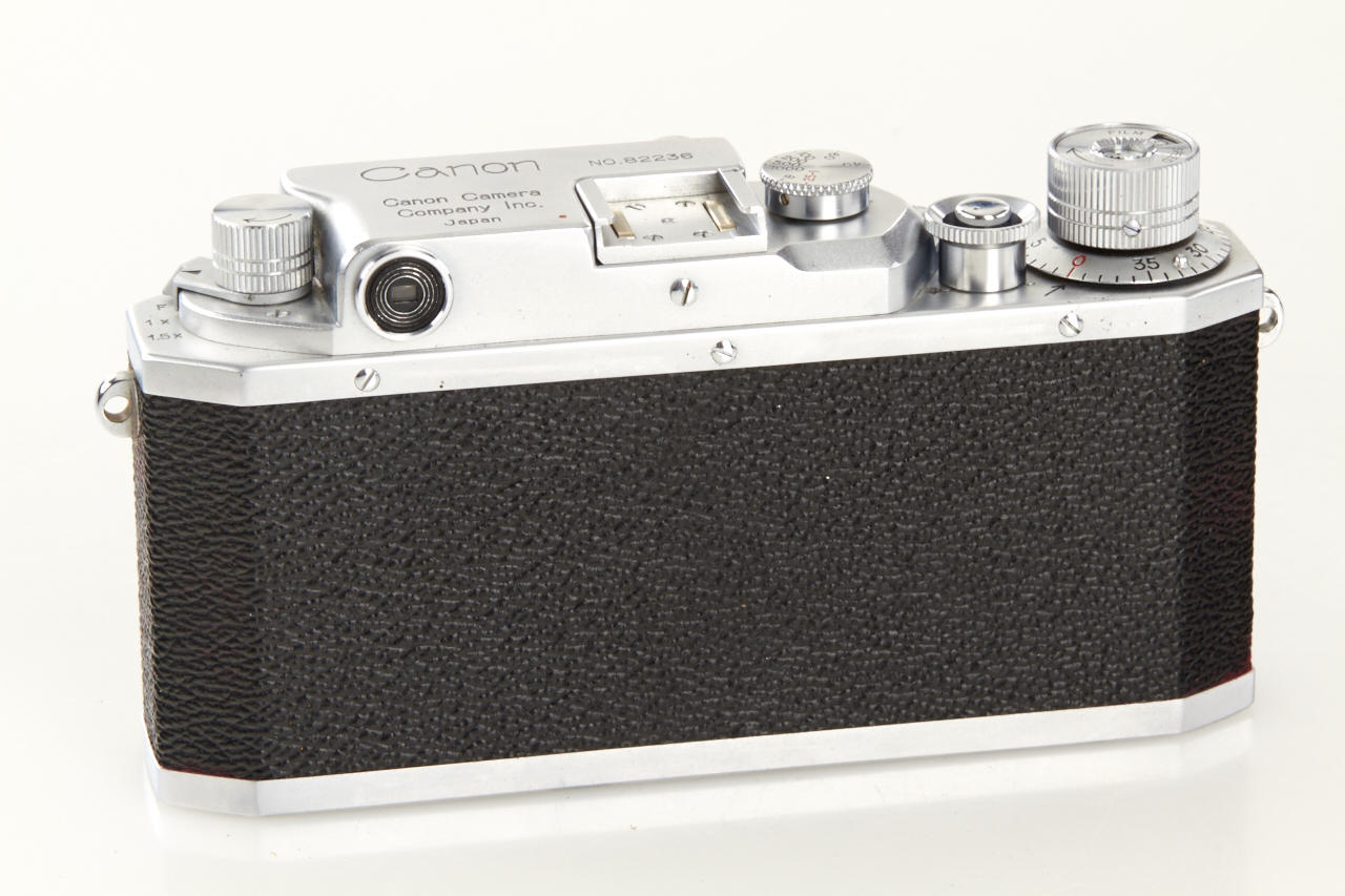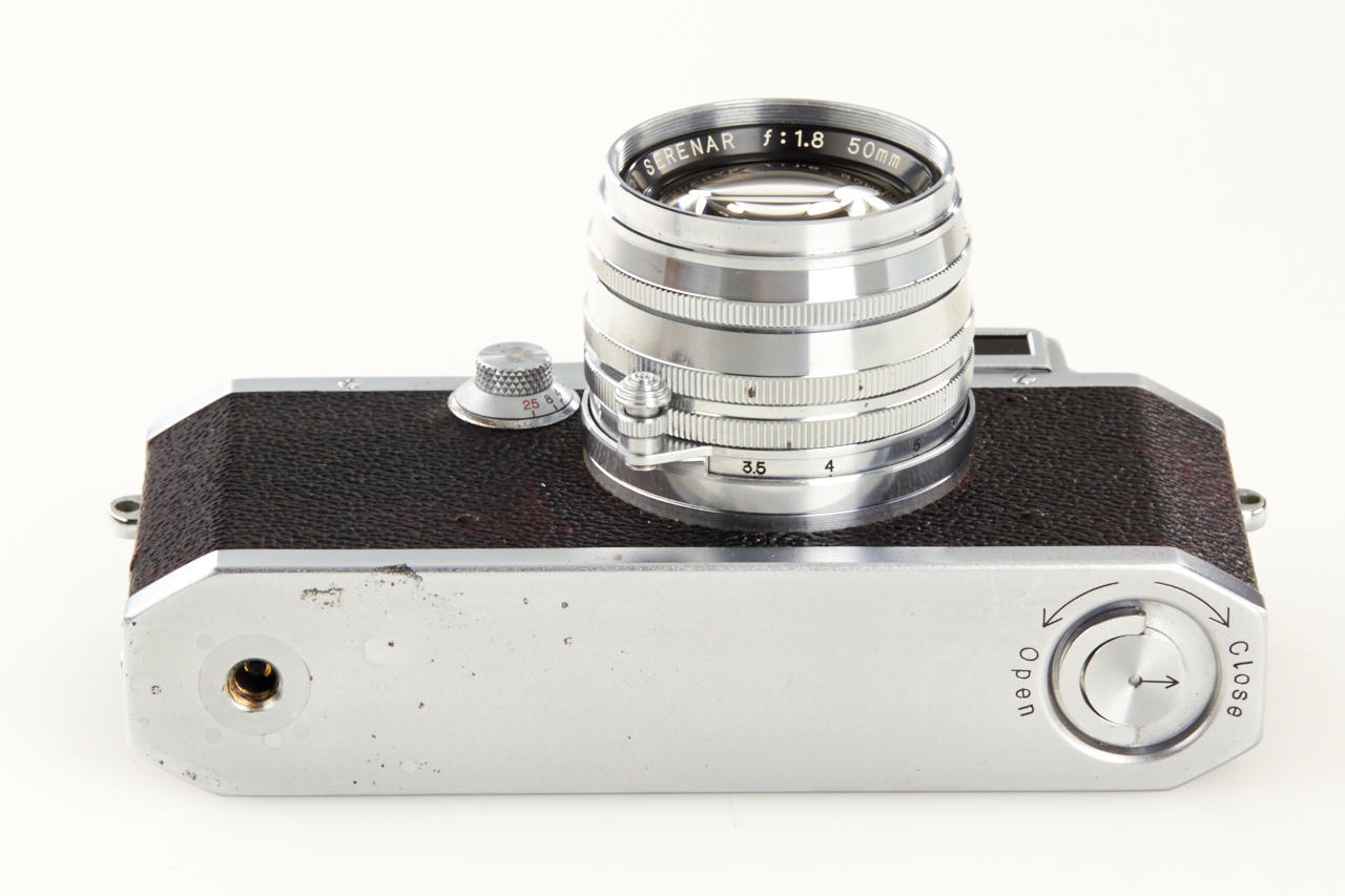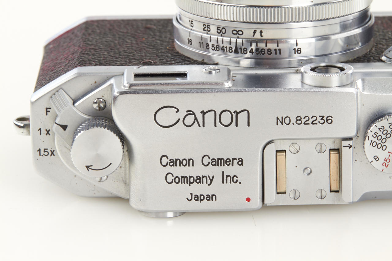 uncommon Canon IIIa with film type indicator in perfect and good working order, chrome Serenar 1.8/50mm no.65352, cap, original case