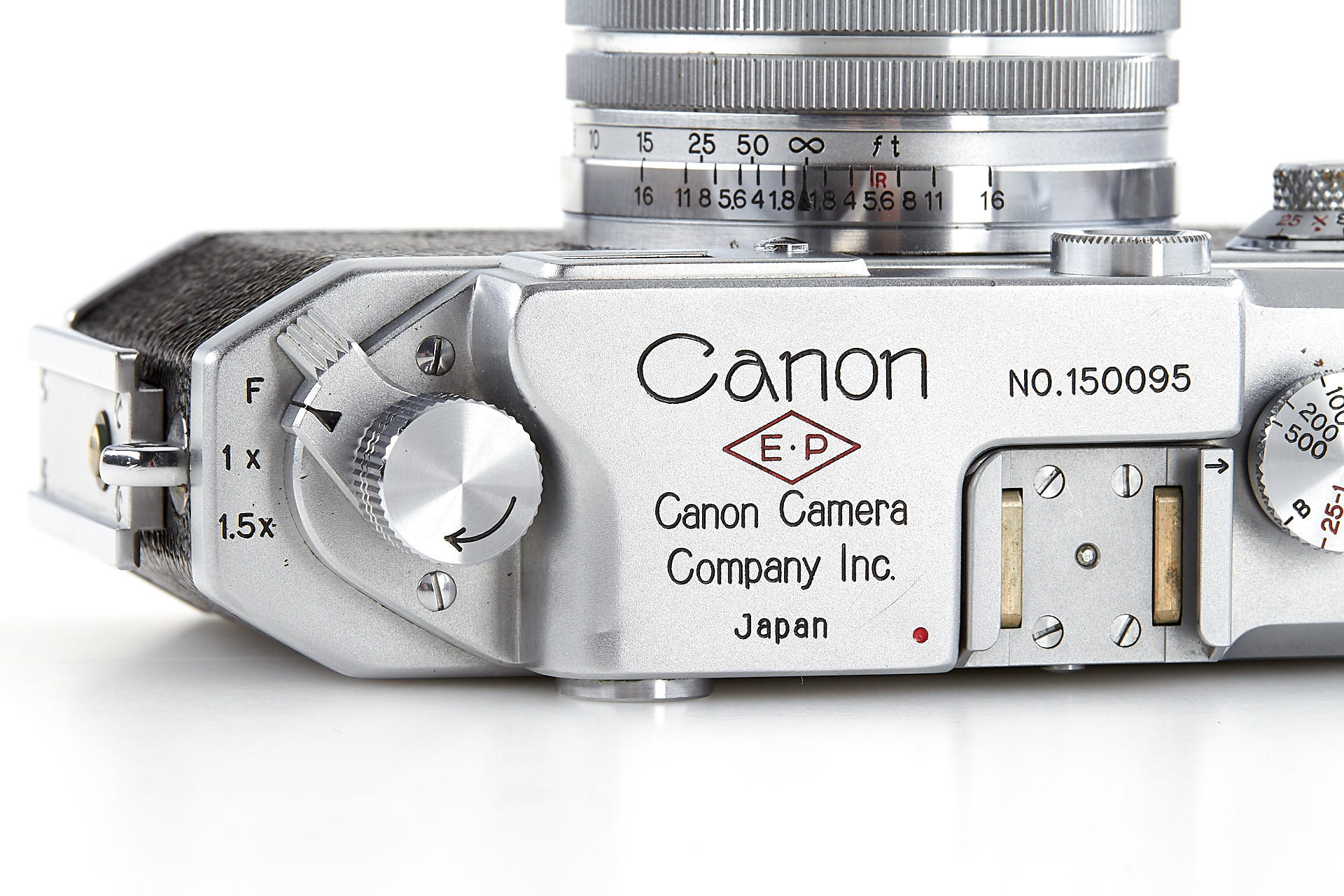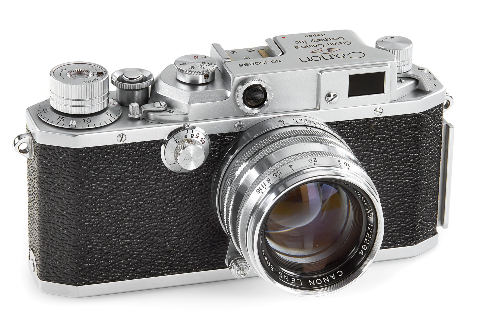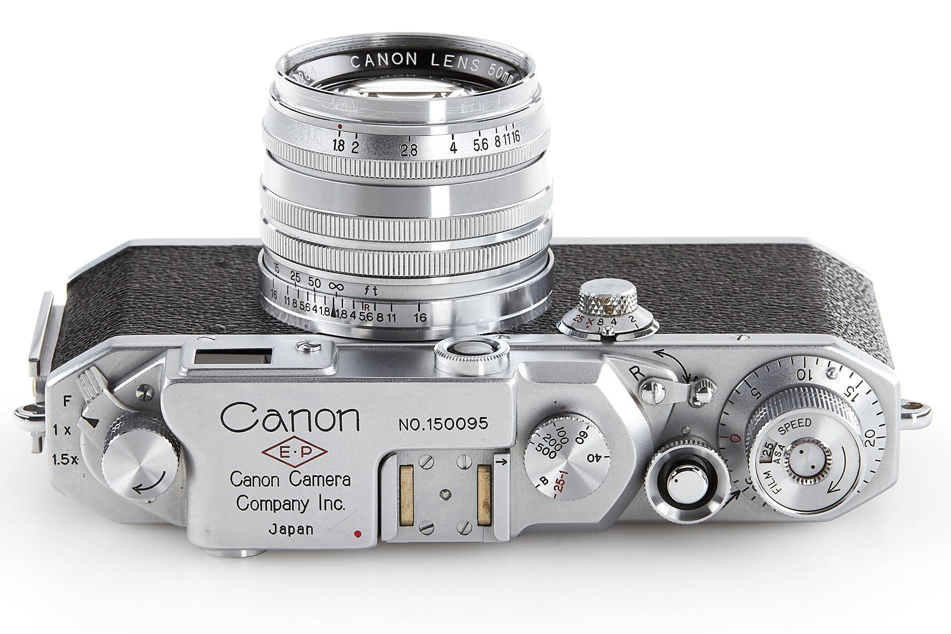 body in excellent condition and good working order, engraved with 'E.P' (export permitted) on the top plate, with Canon 1.8/80mm no.122264 (near mint with good optics)