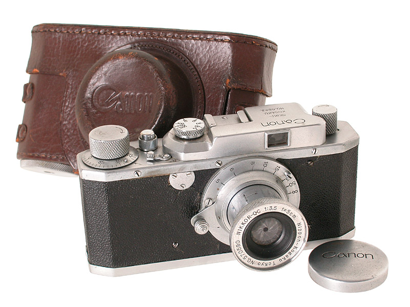 Die erste nach dem Krieg hergestellte Canon, sehr selten, guter Originalzustand mit 3,5/5cm Nikkor-Q.C Nr.570590, Tasche mit Prägung: Made in Occupied Japan