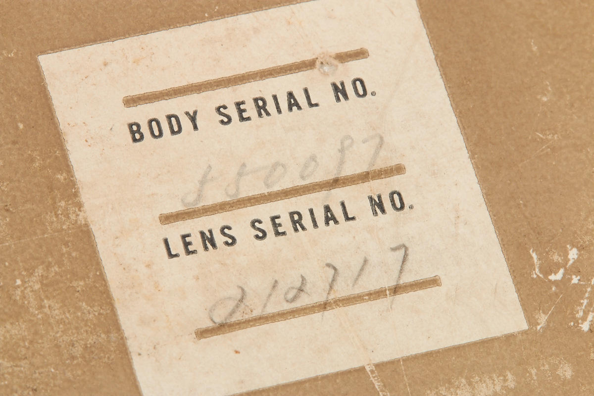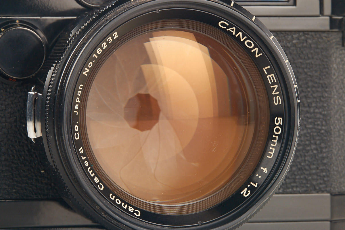 very rare L1 in black painted finish in good working order with rare Canon Lens 1.2/50mm no.16232 with black front ring and matching black cap, black painted Canon meter (not operable), maker's box for Canon L1 with 1.8/50mm lens