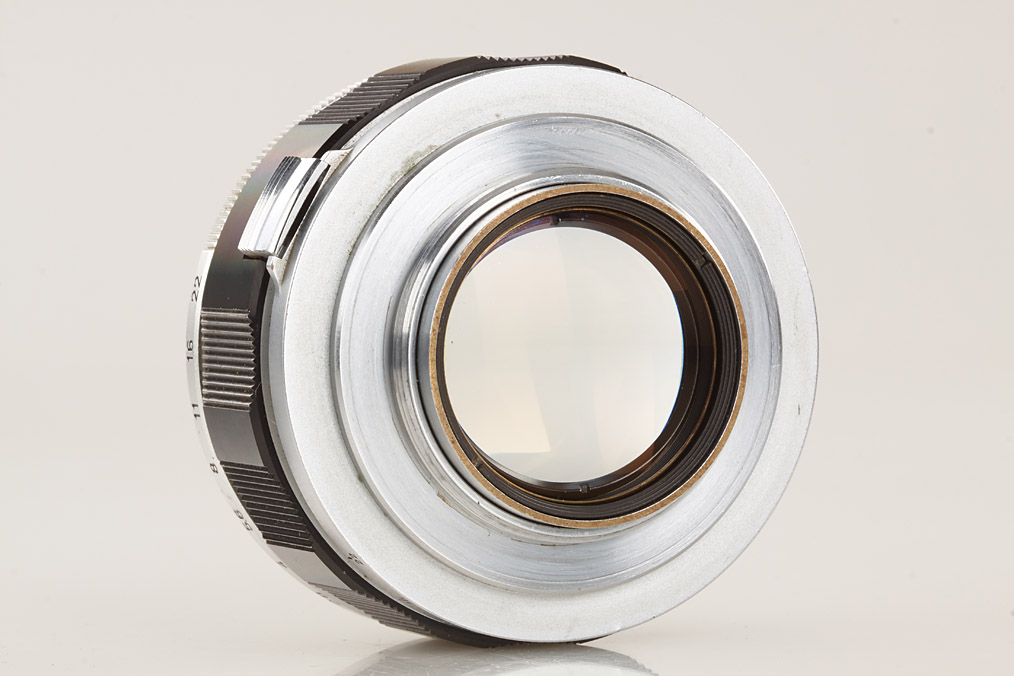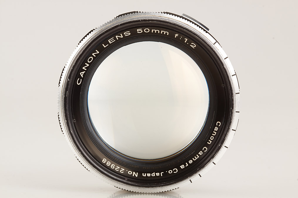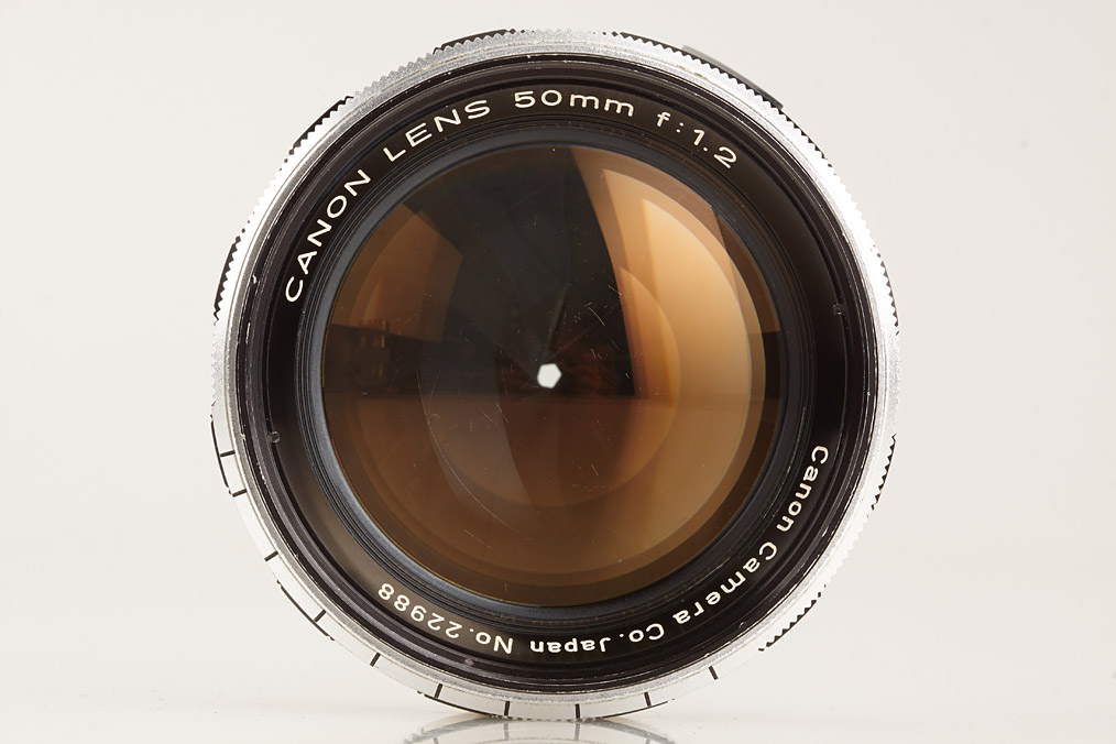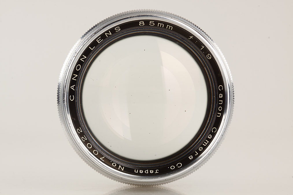 two RF coupled M39 Canon Lenses, (1) 1.2/50mm no.22988 with some cleaning marks (cap), (2) 1.9/85mm no.70022 with some cleaning marks (cap)