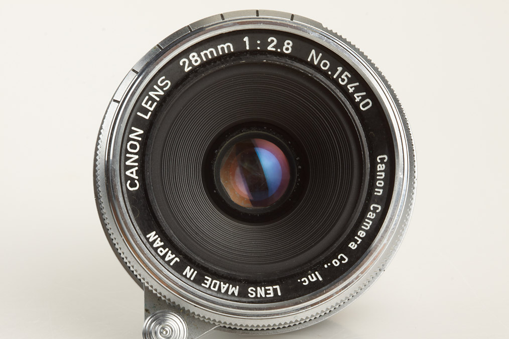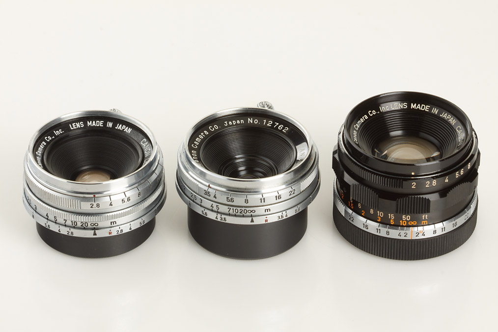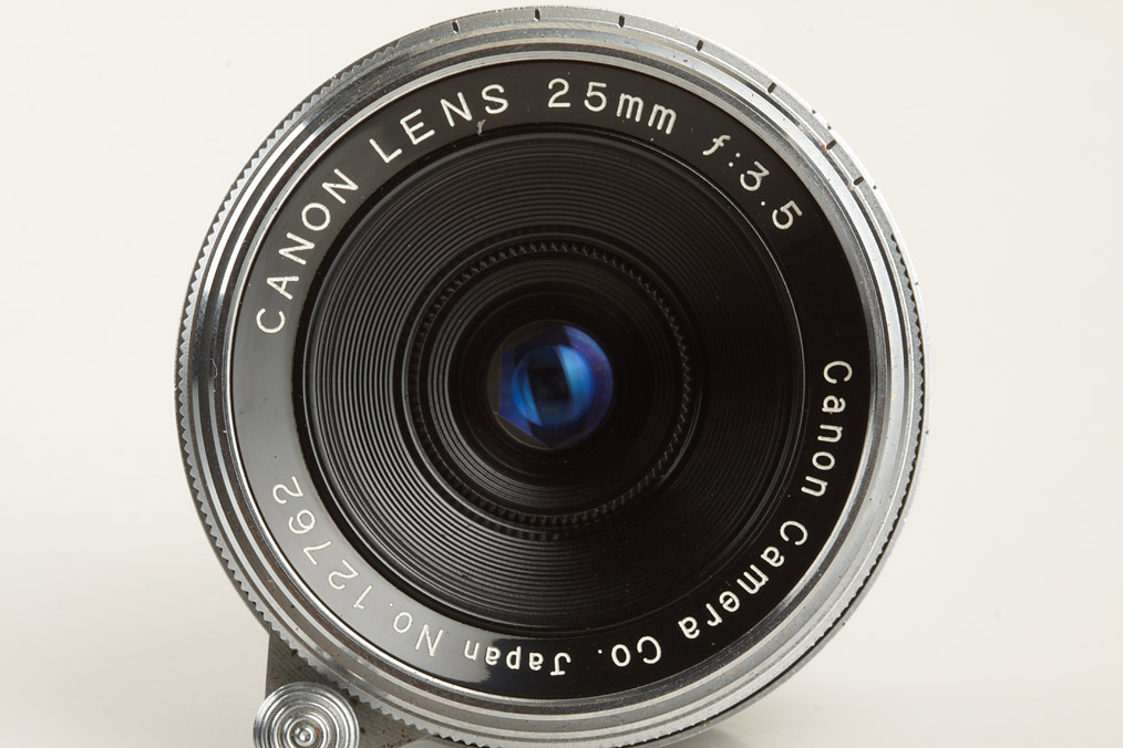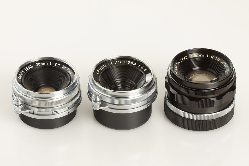 three Canon M39 screw mount lenses: (1) chrome Canon Lens 3.5/25mm no.12762 (cond. A/B, rear cap, 25mm finder with case), (2) chrome Canon Lens 2.8/28mm (some cleaning marks, caps, keeper, black finder), (3) black Canon Lens 2/35mm no.20840 (caps, keeper, chrome finder) (3)
